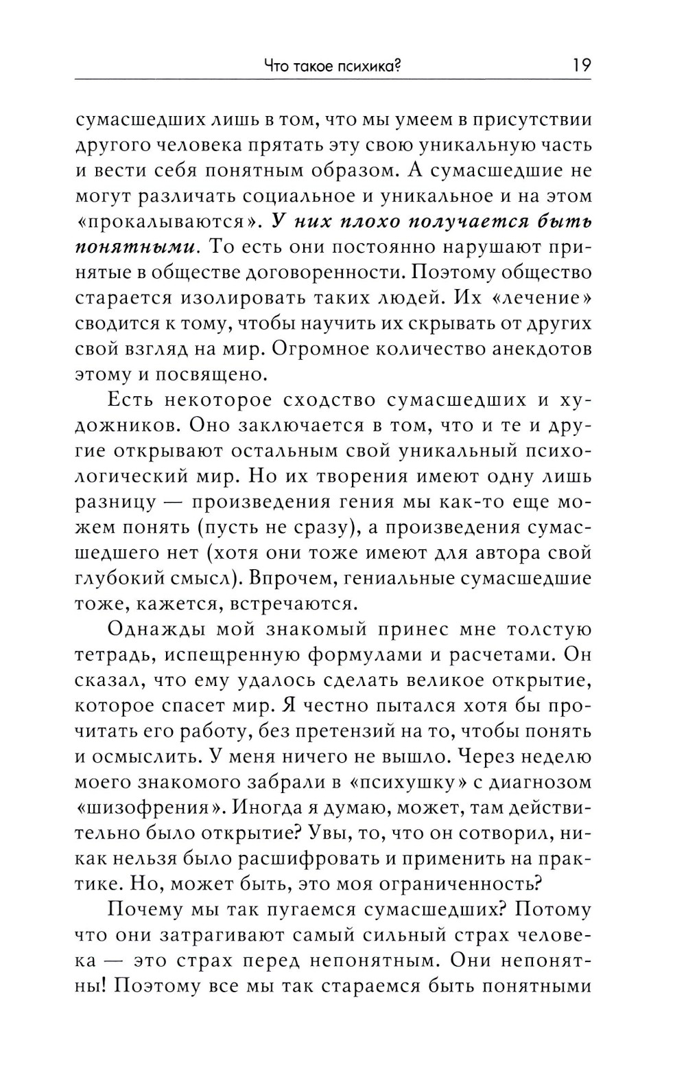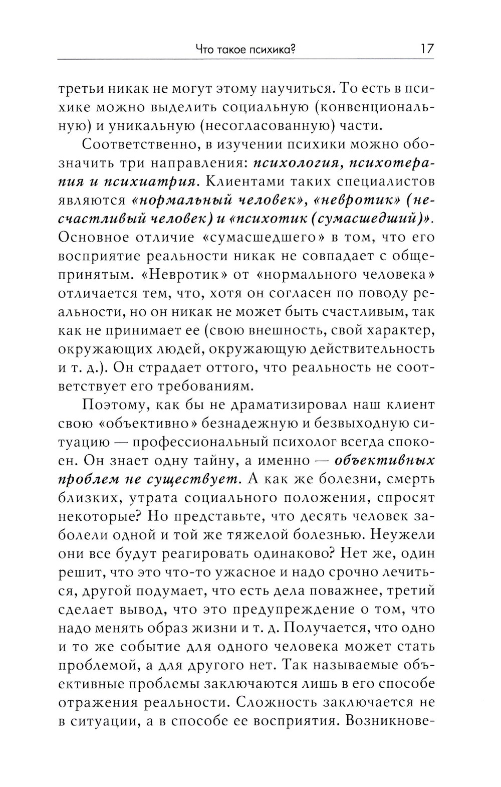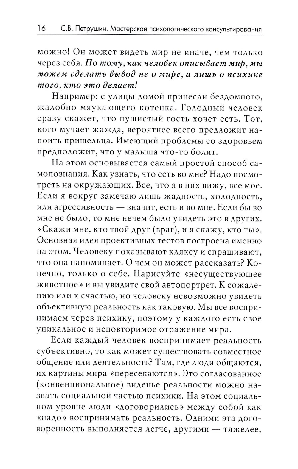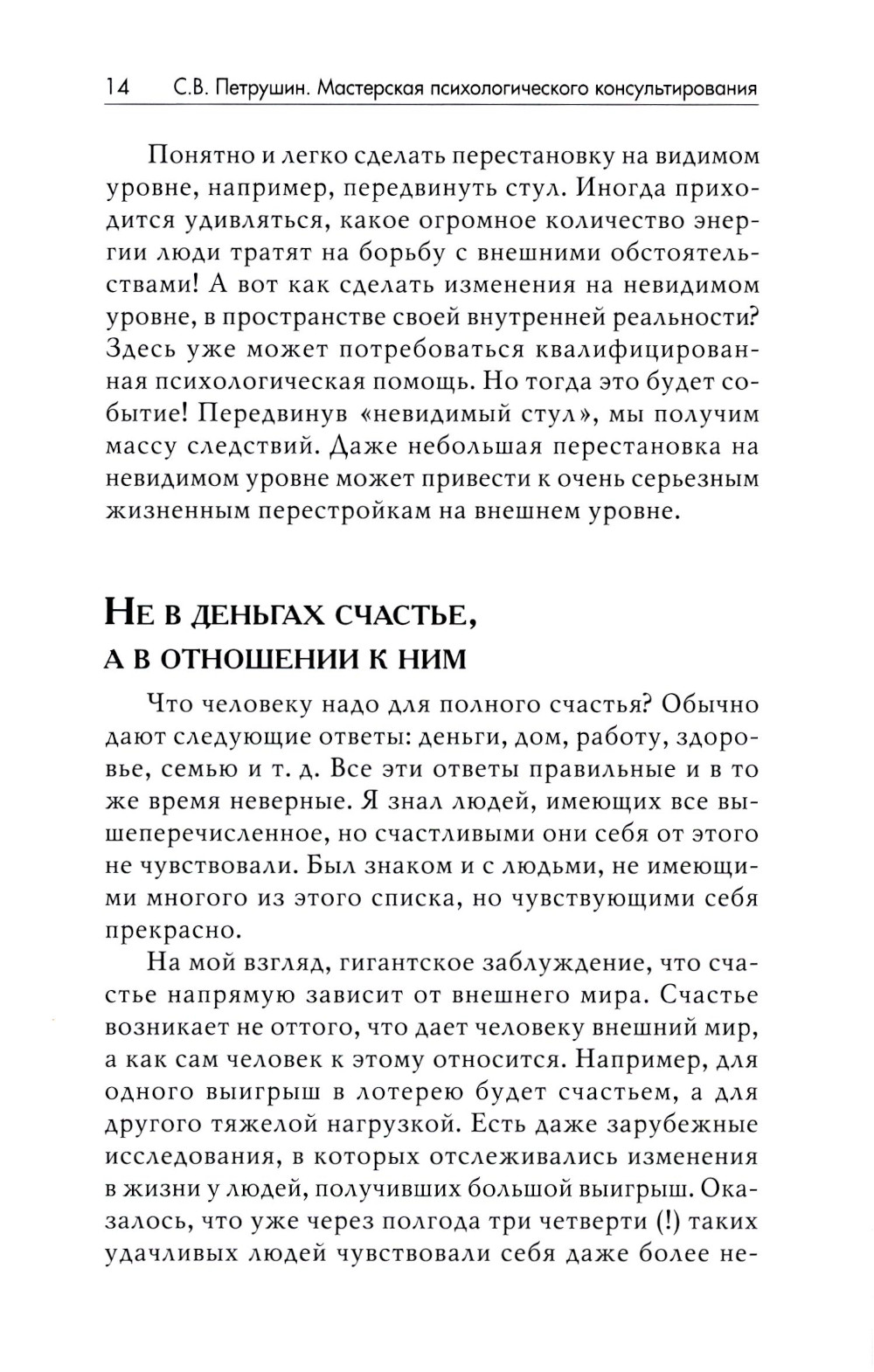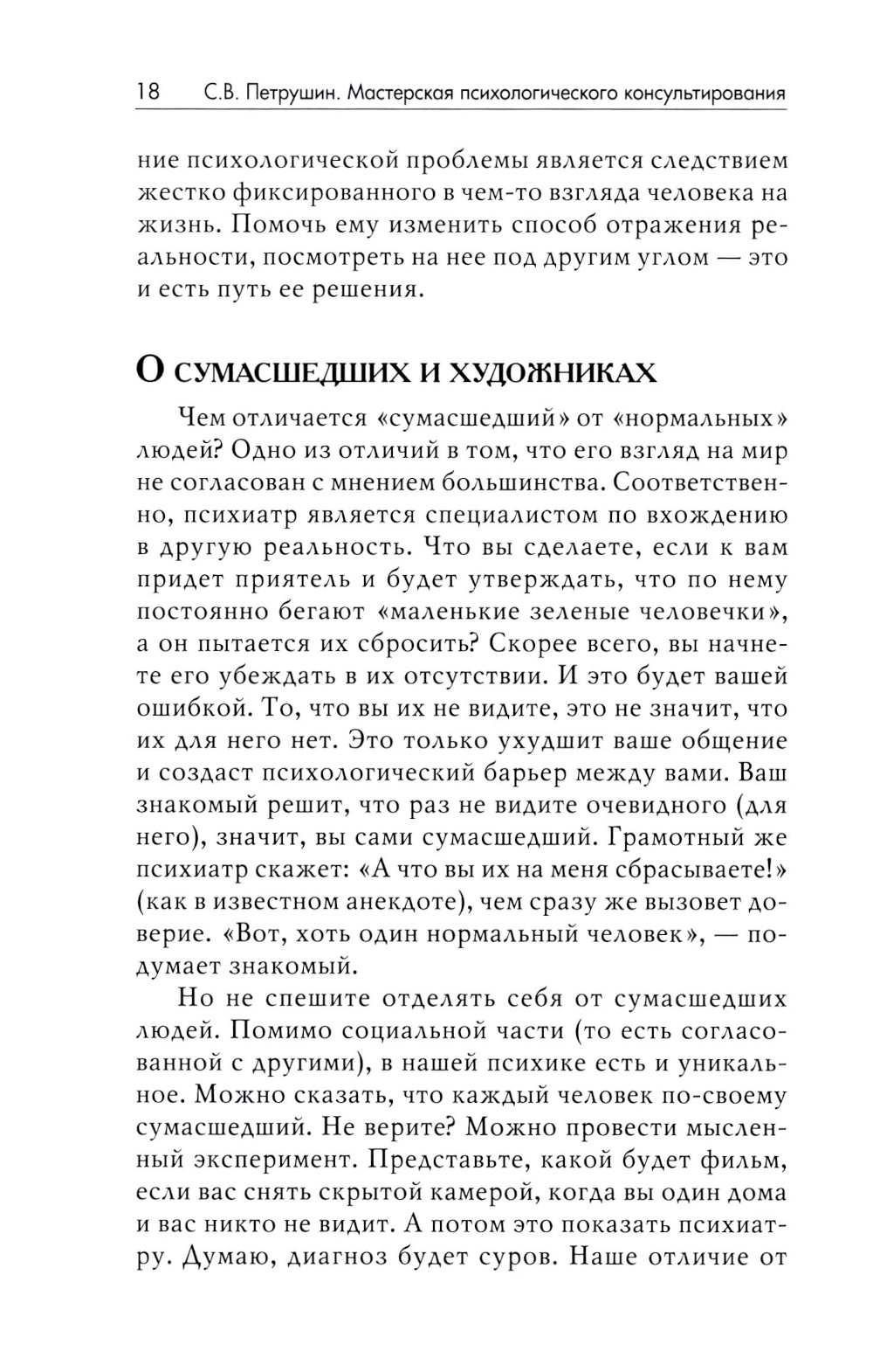 «Психолог-консультант - специалист, оказывающий помощь в решении психологических проблем. Эти отношения совершенно не похожи на то, с чем обычно сталкивается человек в своей жизни. В них с помощью консультанта происходит встреча человека с самим собой». Эту книгу можно рассматривать как некоторые этюды на ту или иную тему, связанную с представлениями о работе практического психолога. Сначала в сжатом виде излагается программа авторской «Психологической мастерской». Затем эта программа более подробно рассматривается в пяти разделах книги. В некоторых даются упражнения по тренировке профессиональных умений. В качестве следующих блоков включены иллюстрации-репортажи со встреч в мастерской и фрагменты консультативных бесед. В заключение рассматриваются некоторые базовые психотерапевтические методы, которые можно использовать в консультировании. Книга поможет как начинающим, так и опытным консультантам и психотерапевтам, а также всем тем, кто интересуется практической психологией.| Издательство | Академический проект |