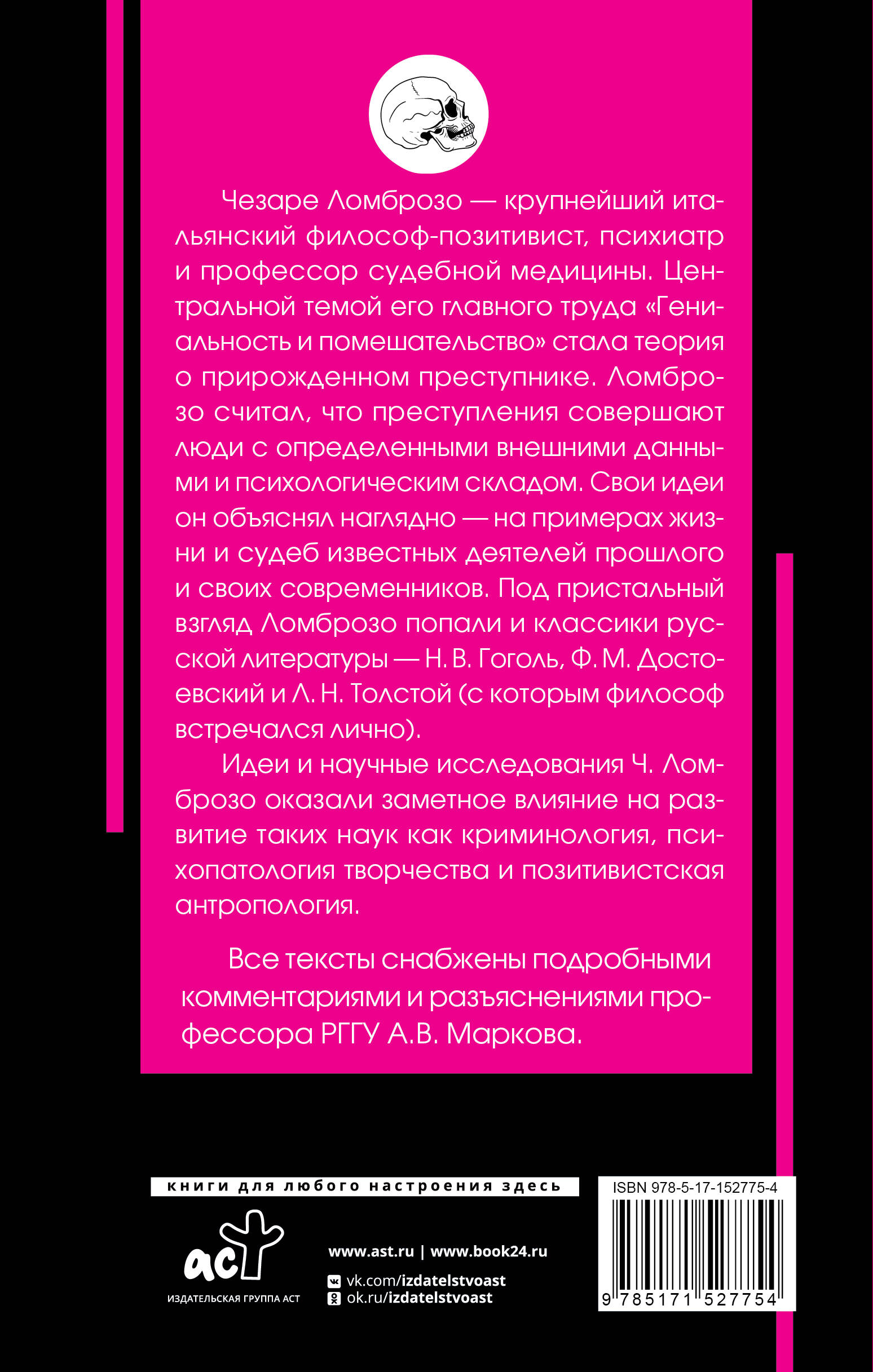 Чезаре Ломброзо - крупнейший итальянский философ-позитивист, психиатр и профессор судебной медицины. Центральной темой его главного труда "Гениальность и помешательство" стала идея о прирожденном преступнике. Ломброзо считал, что преступления совершают люди с набором определенных внешних данных и психологических характеристик. Будучи родоначальником оригинальной концепции творчества как сочетания патологических состояний, Ламброзо объяснял вдохновение как неразумное использование психической энергии, которое порождает оригинальные результаты и способствует прогрессу культуры. Его идеи и научные исследования оказали заметное влияние на развитие таких наук как криминология, психопатология творчества и позитивистская антропология. Все тексты снабжены подробными комментариями и разъяснениями профессора РГГУ А.В. Маркова.| Издательство | ИЗДАТЕЛЬСТВО "АСТ" |