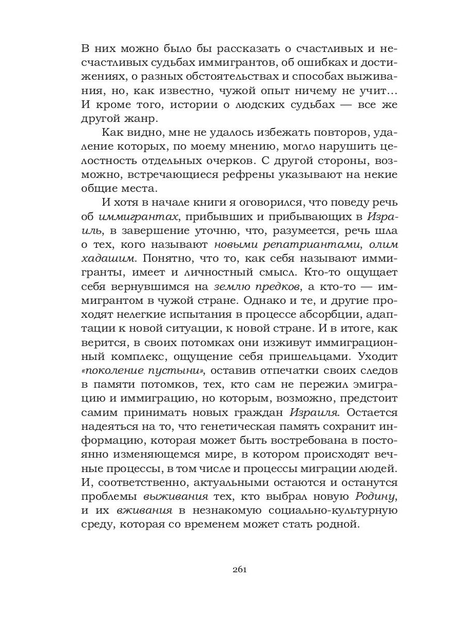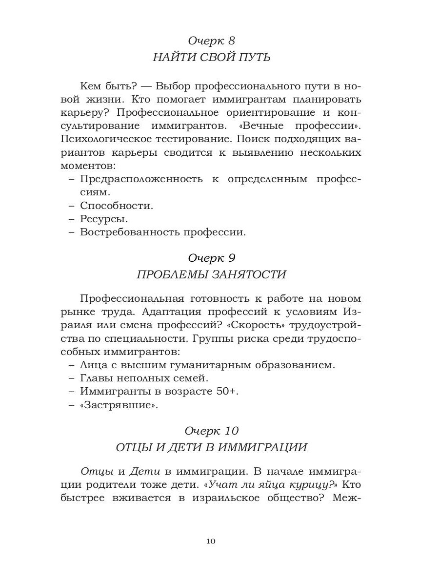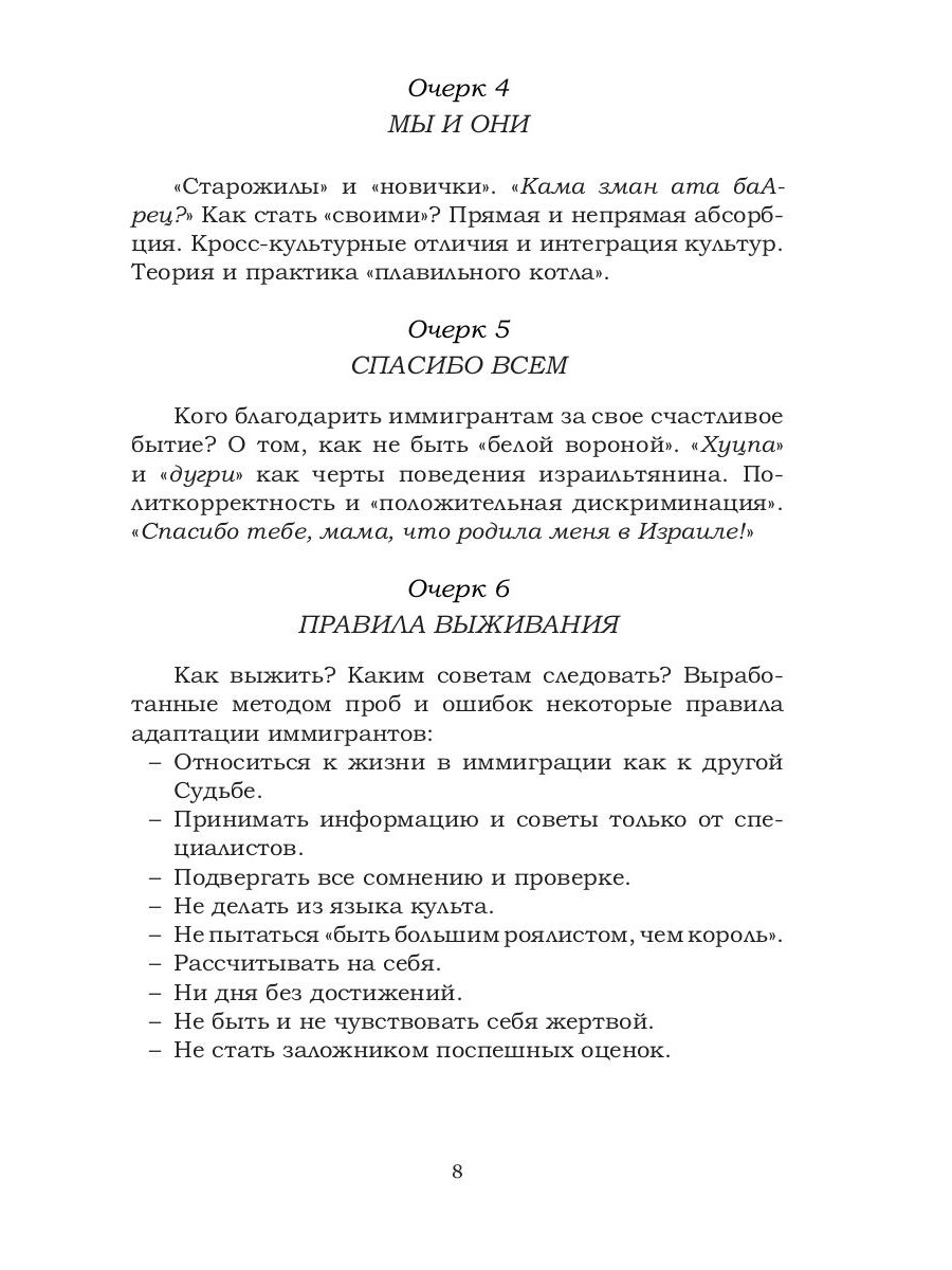 Книга представляет собой сборник объединенных одной темой очерков, отражающих различные стороны процесса иммиграции в Израиле с точки зрения практикующего психолога. Материал основан на опыте психологического консультирования иммигрантов и возвратившихся граждан Израиля, а также на самонаблюдении автора, являющегося иммигрантом с почти тридцатилетним стажем. Книга может быть интересна как самим эмигрантам или иммигрантам, так и тем, кто их обслуживает, помогая им в адаптации в новом для них мире. Она также может быть полезна и тем, кто занимается проблемами иммиграции и иммигрантов применительно к другим странам.| Издательство | Т8 RUGRAM |