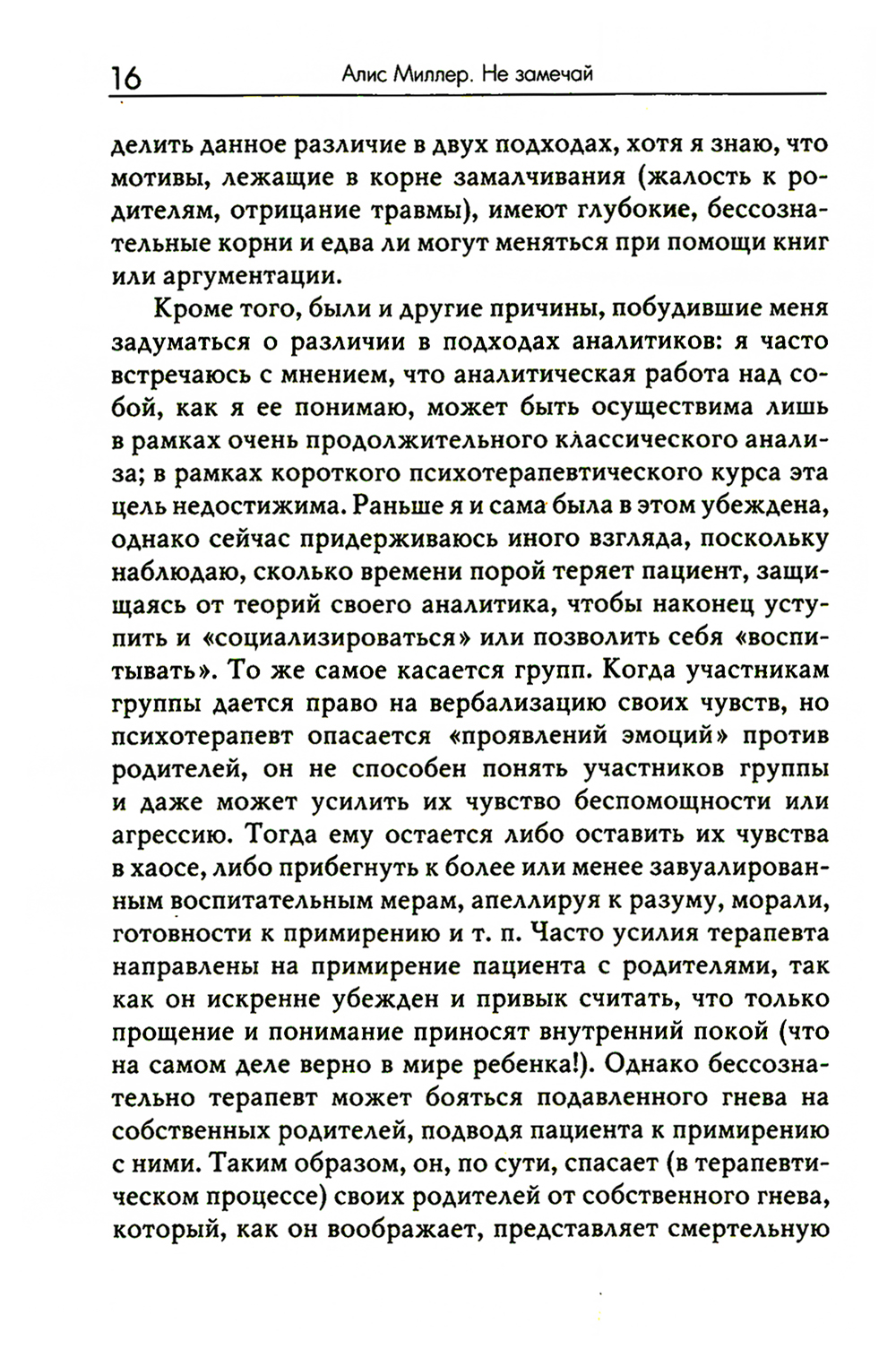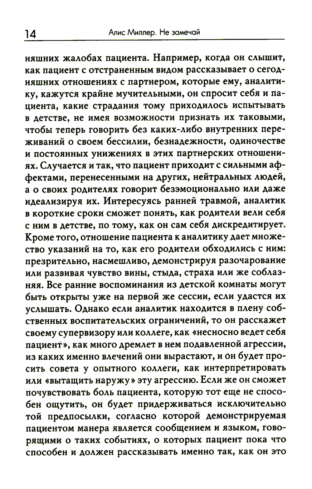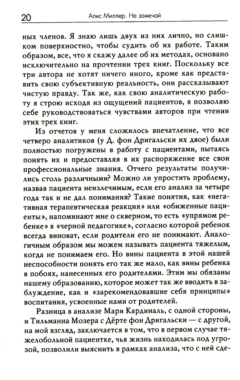 «Не замечай» того, что тебе пришлось пережить в детстве: жестокого обращения и сексуального насилия со стороны взрослых. Это негласное табу исследует психоаналитик Алис Миллер, специалист в области ранних детских травм. Она выступает с критикой психоанализа, в частности психоаналитической теории влечений Фрейда, и задается вопросом, почему многие психоаналитики, начинавшие свои исследования насилия над детьми, позже по каким-то причинам отказывались от своих идей. Миллер говорит о влиянии «черной педагогики» и опоры на заповедь, которая гласит: «Почитай отца твоего и мать твою...», о тех последствиях, которые наступают в результате игнорирования потребностей ребенка, приводя яркие примеры из биографий и творчества В. Вулф, Ш. Бодлера, Ф. Кафки и др. Автор открывает читателю, как важен понимающий и принимающий человек, который будет сопровождать пациента на пути столь болезненных и тяжелых воспоминаний и осознаний. Для психологов, психотерапевтов, социальных работников, а также всех, кто интересуется проблемами детства.