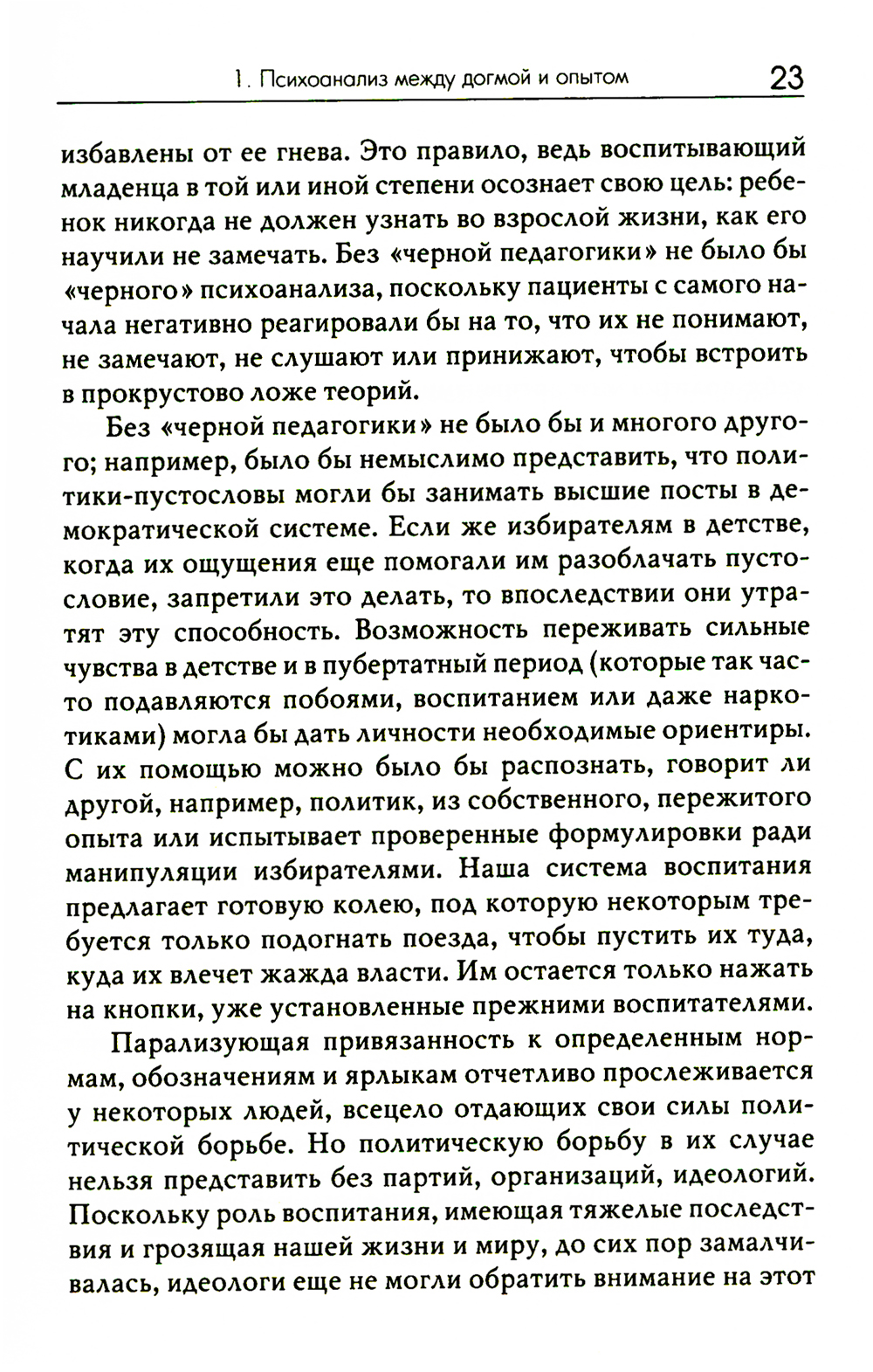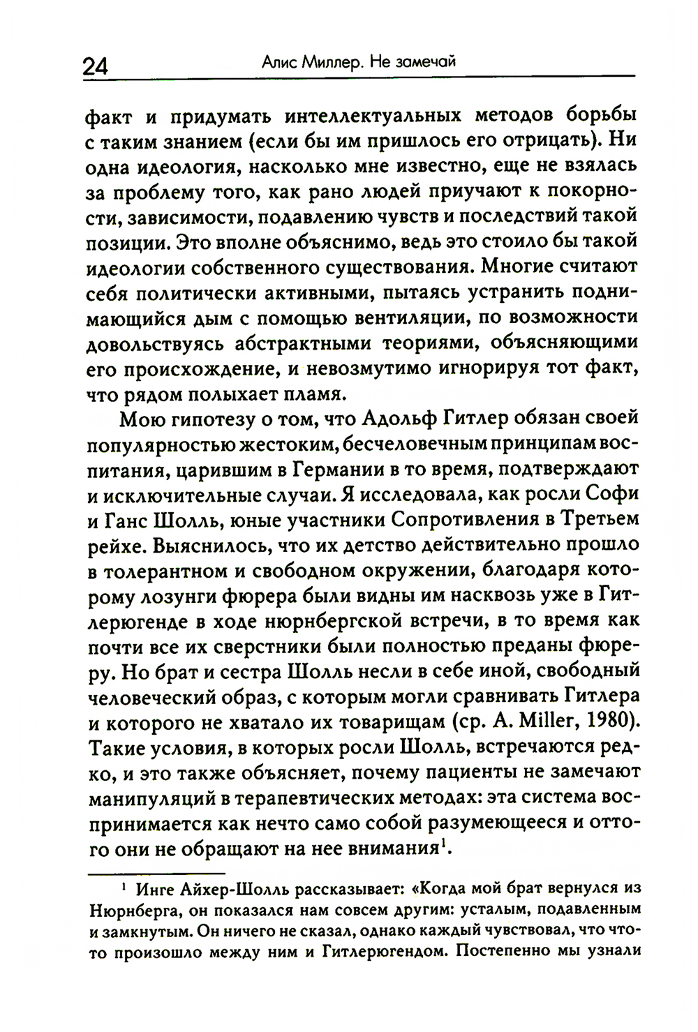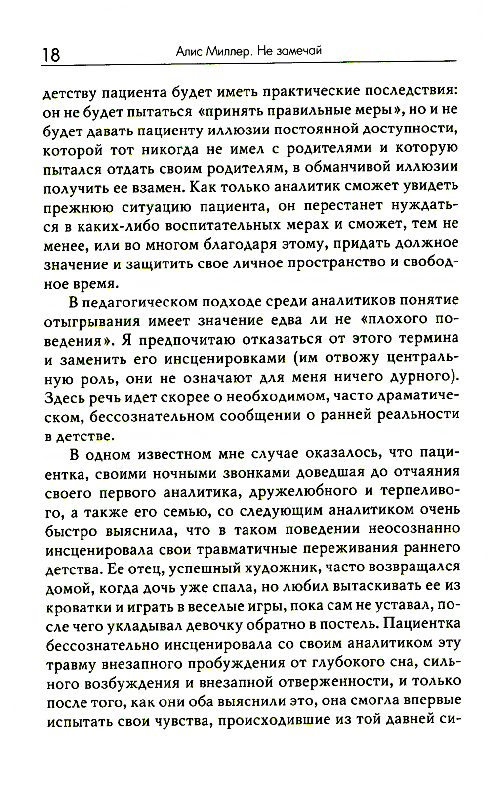 «Не замечай» того, что тебе пришлось пережить в детстве: жестокого обращения и сексуального насилия со стороны взрослых. Это негласное табу исследует психоаналитик Алис Миллер, специалист в области ранних детских травм. Она выступает с критикой психоанализа, в частности психоаналитической теории влечений Фрейда, и задается вопросом, почему многие психоаналитики, начинавшие свои исследования насилия над детьми, позже по каким-то причинам отказывались от своих идей. Миллер говорит о влиянии «черной педагогики» и опоры на заповедь, которая гласит: «Почитай отца твоего и мать твою...», о тех последствиях, которые наступают в результате игнорирования потребностей ребенка, приводя яркие примеры из биографий и творчества В. Вулф, Ш. Бодлера, Ф. Кафки и др. Автор открывает читателю, как важен понимающий и принимающий человек, который будет сопровождать пациента на пути столь болезненных и тяжелых воспоминаний и осознаний. Для психологов, психотерапевтов, социальных работников, а также всех, кто интересуется проблемами детства.