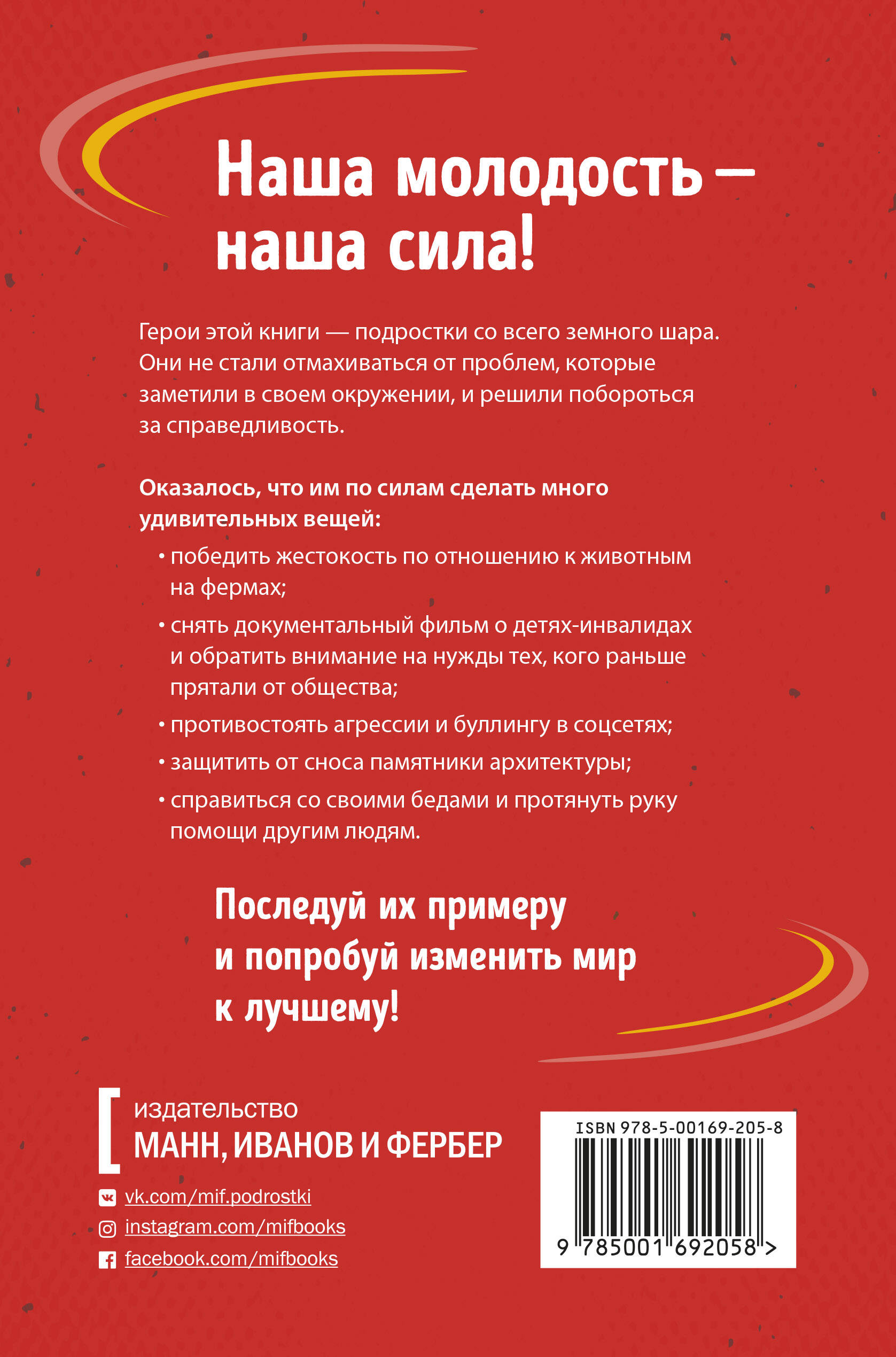 В этой книге собраны истории 57 подростков со всего мира, которые не захотели мириться с несправедливостью и смогли добиться серьезных перемен в обществе, несмотря на свой юный возраст. Книга предназначена для лиц старше 18 лет.| Издательство | МАНН, ИВАНОВ И ФЕРБЕР ООО |