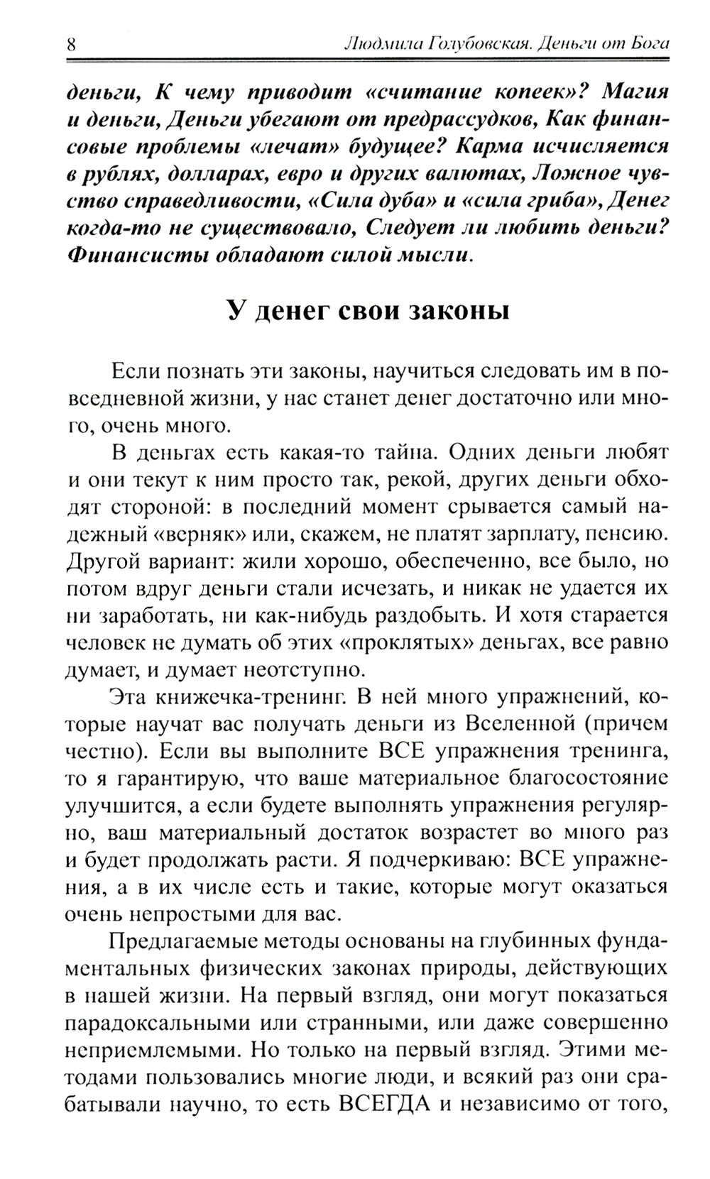 В деньгах есть какая-то тайна. Одних деньги любят, и они текут к ним просто так, рекой, других деньги обходят стороной. Ключевая идея этой книги - как сделать земные деньги результатом правильной духовной жизни. Это книга-тренинг. В ней упражнения, с помощью которых вы научитесь получать деньги из Вселенной.| Издательство | Амрита-Русь |