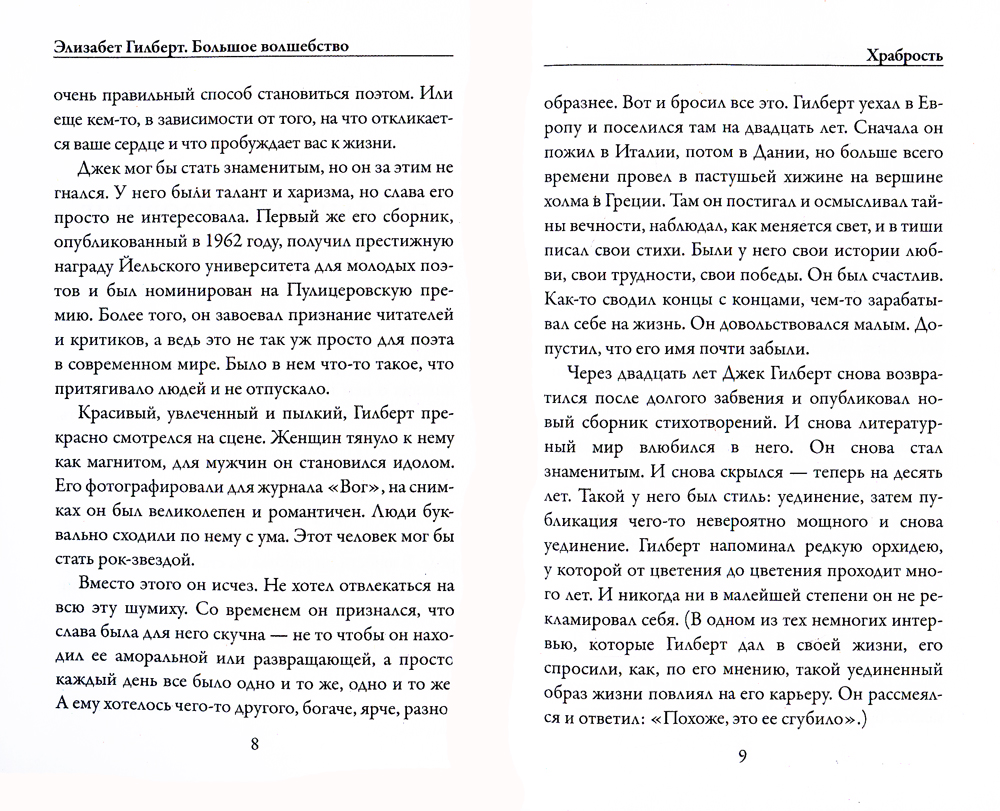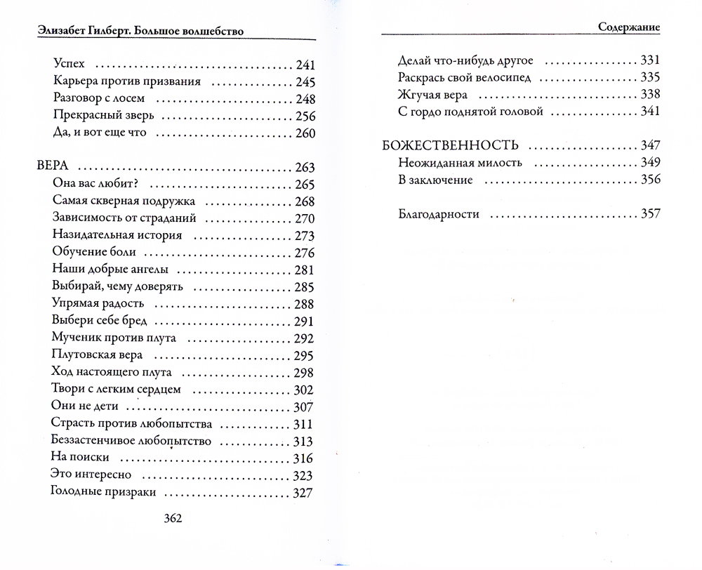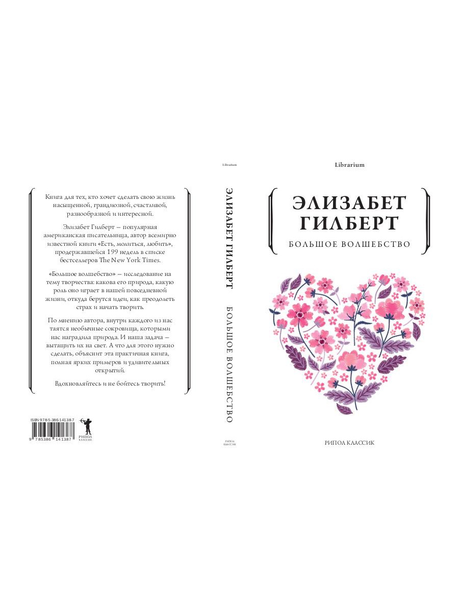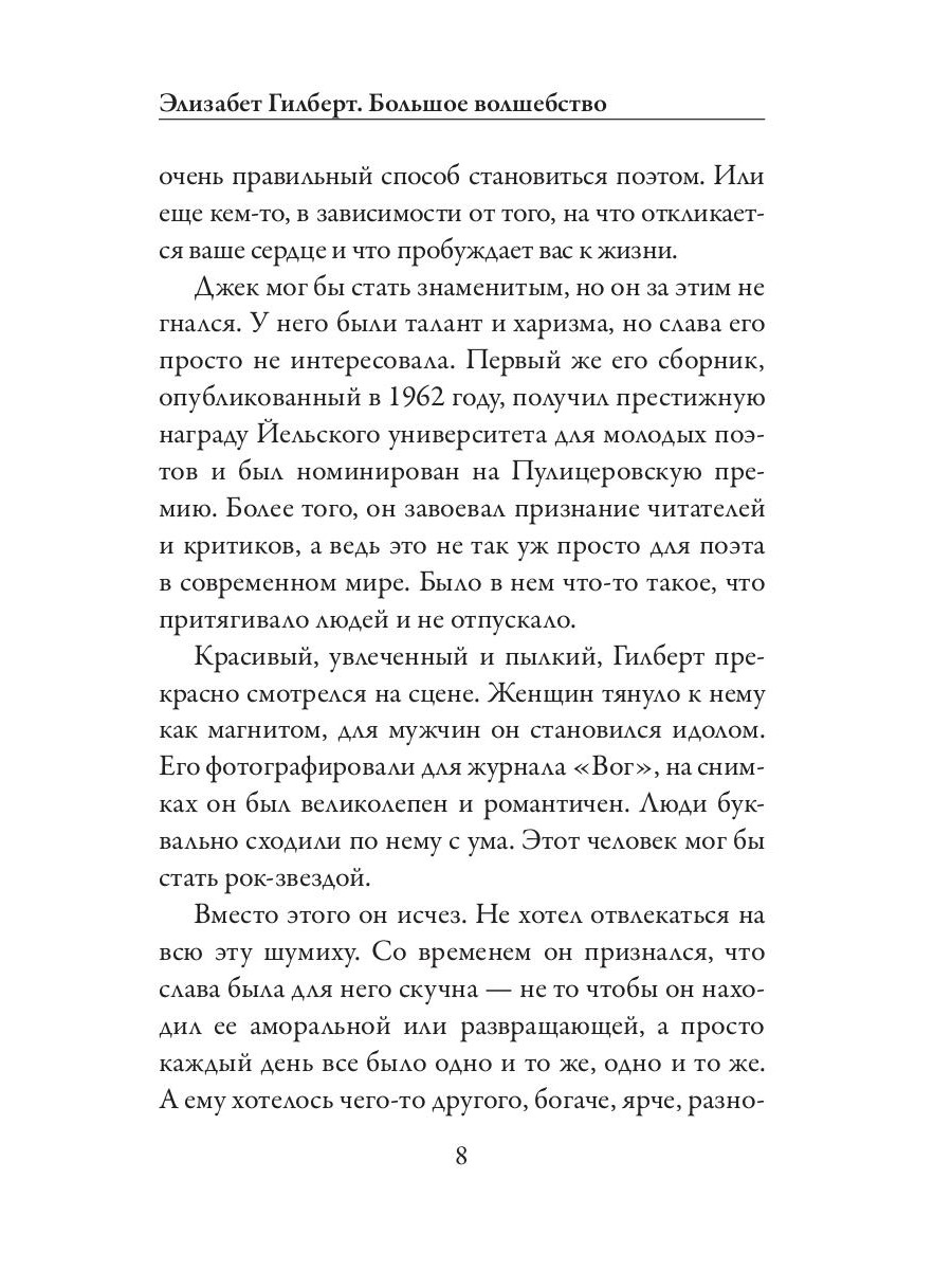 Книга для тех, кто хочет сделать свою жизнь насыщенной, грандиозной, счастливой, разнообразной и интересной. Элизабет Гилберт - популярная американская писательница, автор всемирно известной книги «Есть, молиться, любить», продержавшейся 199 недель в списке бестселлеров The New York Times. «Большое волшебство» - исследование на тему творчества: какова его природа, какую роль оно играет в нашей повседневной жизни, откуда берутся идеи, как преодолеть страх и начать творить. По мнению автора, внутри каждого из нас таятся необычные сокровища, которыми нас наградила природа. И наша задача - вытащить их на свет. А что для этого нужно сделать, объяснит эта практичная книга, полная ярких примеров и удивительных открытий. Вдохновляйтесь и не бойтесь творить!