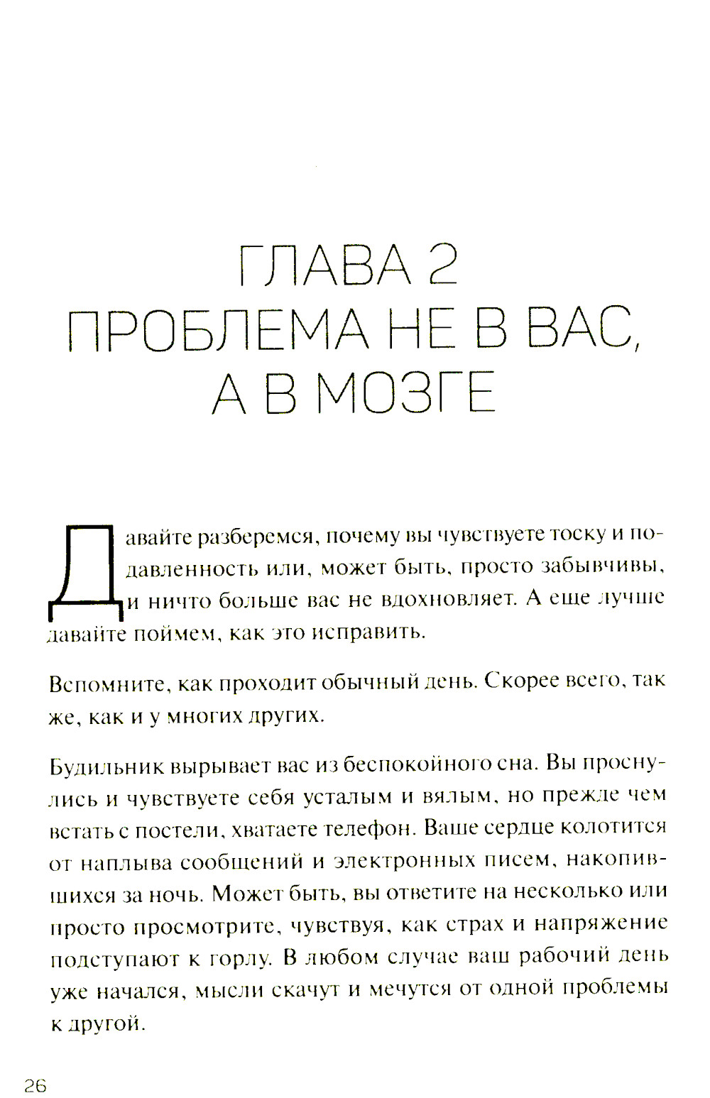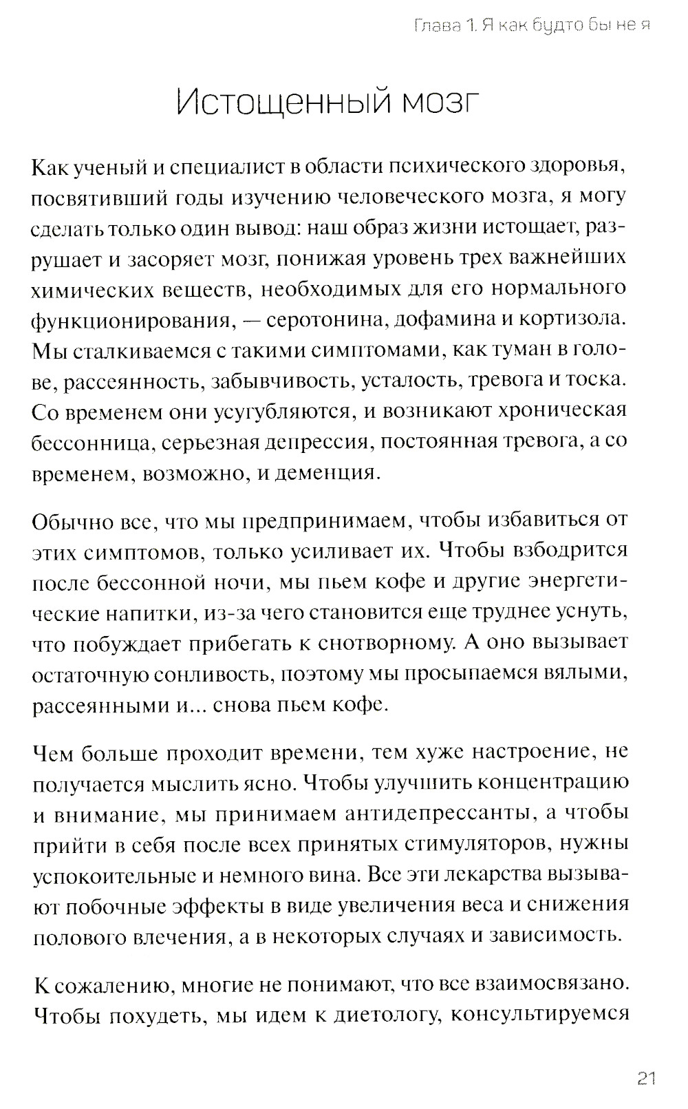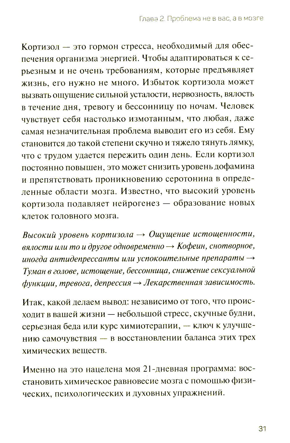 Новая эпидемия охватила мир - эпидемия хронической усталости, рассеянности и, как говорят пациенты доктора Майка, - тумана в голове. Вероятно, и вам это знакомо: мозг словно ватный, мысли тяжко ворочаются или, наоборот, стремительно разбегаются, а выполнение привычных дел требует нечеловеческого напряжения. Ученые полагают, что такое состояние вызвано перегрузкой мозга и нехваткой химических веществ, которые дают нам энергию, спокойствие, способность концентрироваться и испытывать радость. К счастью, у Майка Дау есть решение. Он предлагает трехнедельную программу восстановления баланса гормонов, обеспечивающих отличную работу мозга: серотонина, дофамина и кортизола. Вы получите рабочую тетрадь с планом действий на каждый день. В этот план входит: - контроль питания, физической нагрузки, сна и общего состояния; - трансформация образа мыслей; - тренировка мозга с помощью увлекательных задач; - духовные упражнения и медитации. Перевернув последнюю страницу книги, вы заметите, что стали мыслить более четко, помнить - дольше, учиться - быстрее и творить - вдохновеннее. И, что, пожалуй, важнее всего перечисленного, - вы почувствуете себя более радостным, спокойным и энергичным.| Издательство | Портал |