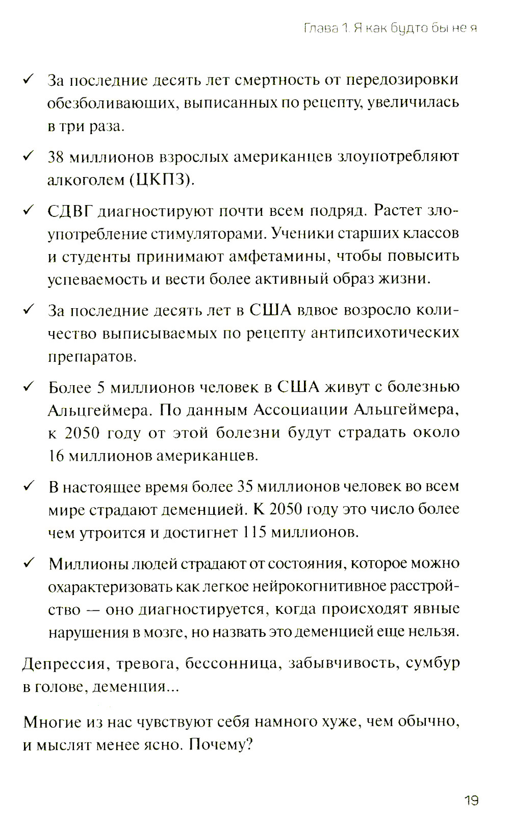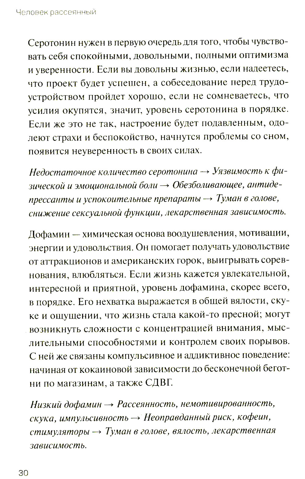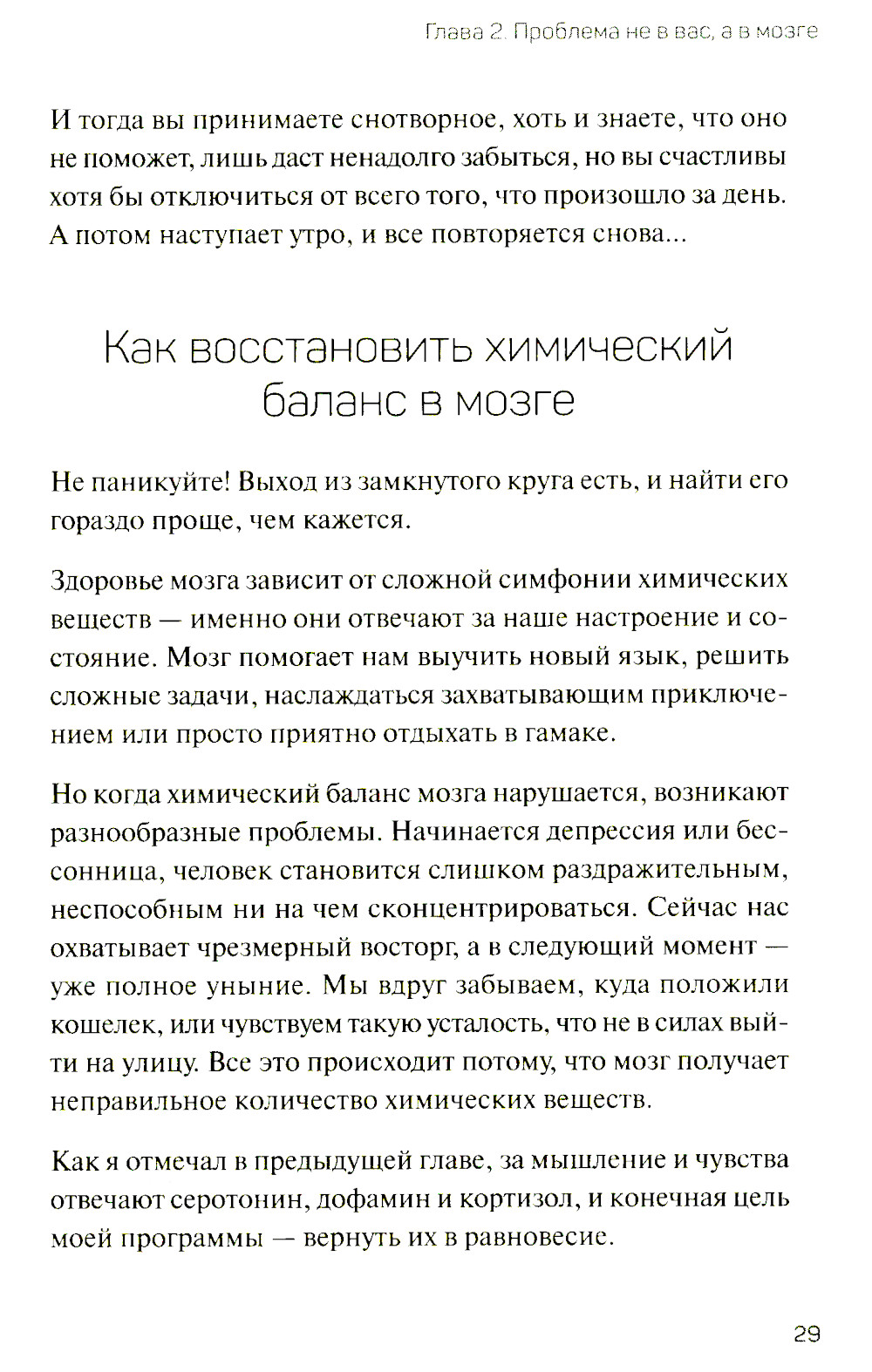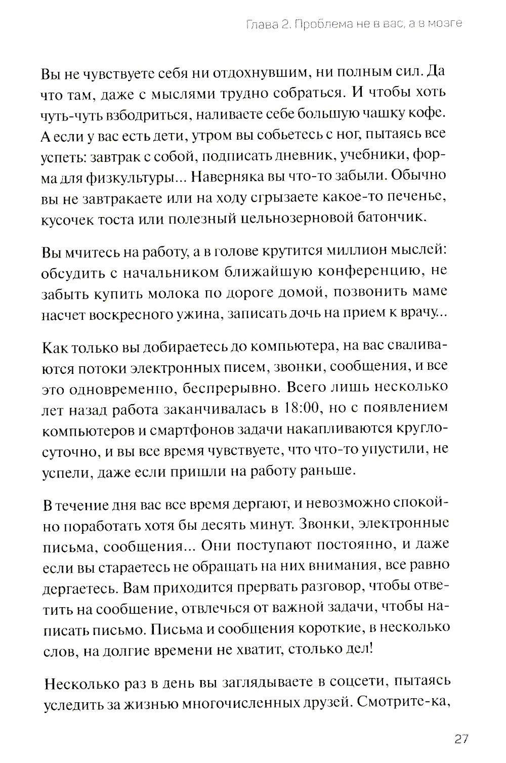 Новая эпидемия охватила мир - эпидемия хронической усталости, рассеянности и, как говорят пациенты доктора Майка, - тумана в голове. Вероятно, и вам это знакомо: мозг словно ватный, мысли тяжко ворочаются или, наоборот, стремительно разбегаются, а выполнение привычных дел требует нечеловеческого напряжения. Ученые полагают, что такое состояние вызвано перегрузкой мозга и нехваткой химических веществ, которые дают нам энергию, спокойствие, способность концентрироваться и испытывать радость. К счастью, у Майка Дау есть решение. Он предлагает трехнедельную программу восстановления баланса гормонов, обеспечивающих отличную работу мозга: серотонина, дофамина и кортизола. Вы получите рабочую тетрадь с планом действий на каждый день. В этот план входит: - контроль питания, физической нагрузки, сна и общего состояния; - трансформация образа мыслей; - тренировка мозга с помощью увлекательных задач; - духовные упражнения и медитации. Перевернув последнюю страницу книги, вы заметите, что стали мыслить более четко, помнить - дольше, учиться - быстрее и творить - вдохновеннее. И, что, пожалуй, важнее всего перечисленного, - вы почувствуете себя более радостным, спокойным и энергичным.| Издательство | Портал |