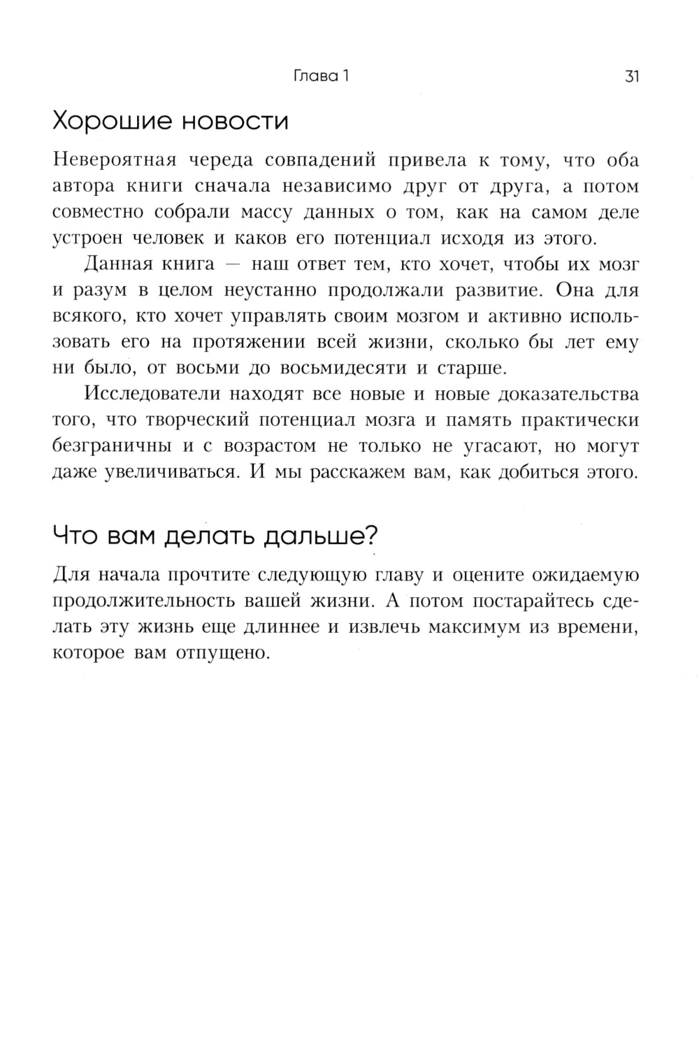 Книга полностью перевернет ваши представления о мозге и старении. Да, организм стареет, но мозг при этом вовсе не деградирует - наоборот, с годами он становится лишь совершеннее. Это абсолютно логично, ведь чем человек старше, тем больше на своем веку он успел испытать и получить опыта. Он пережил множество перемен и привык к ним приспосабливаться, а потому его мозг обладает большей гибкостью. Плюс наш разум отличается практически неисчерпаемой способностью к познанию и созданию новых связей, которая с годами не ослабевает.| Издательство | Попурри |