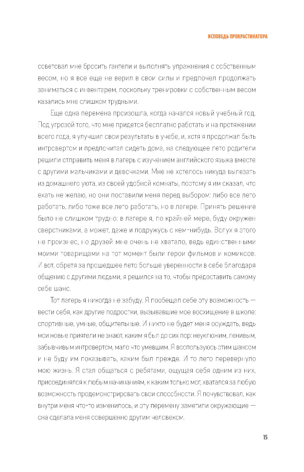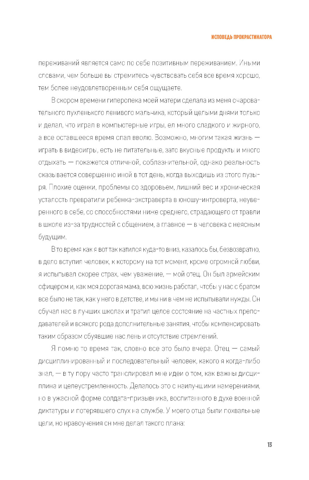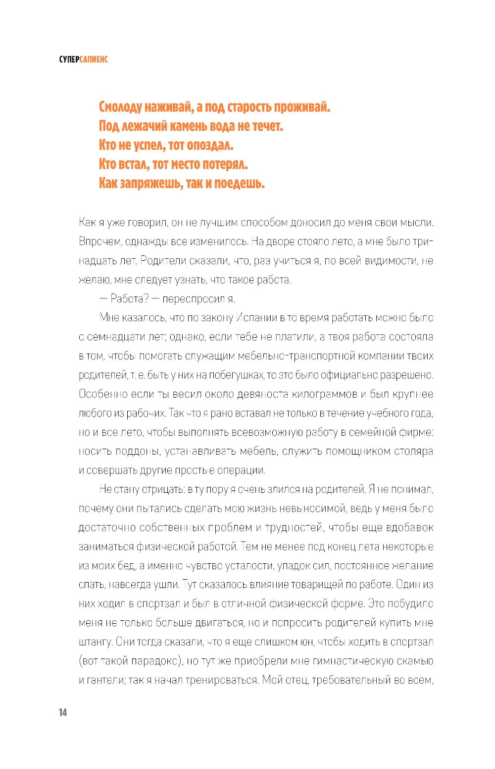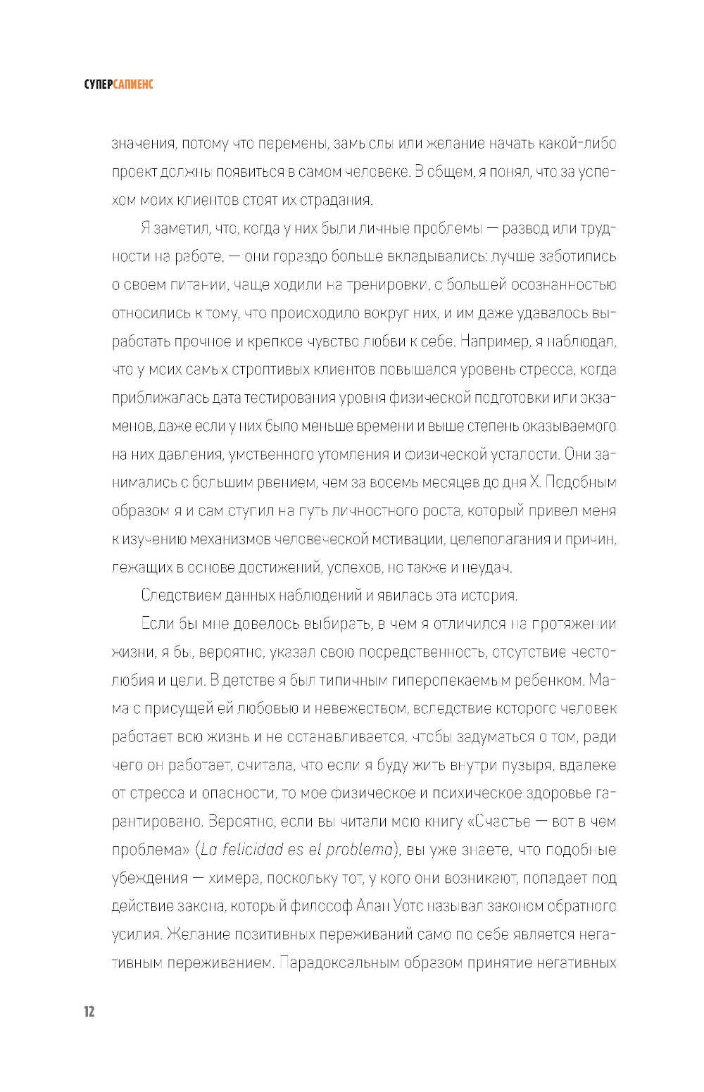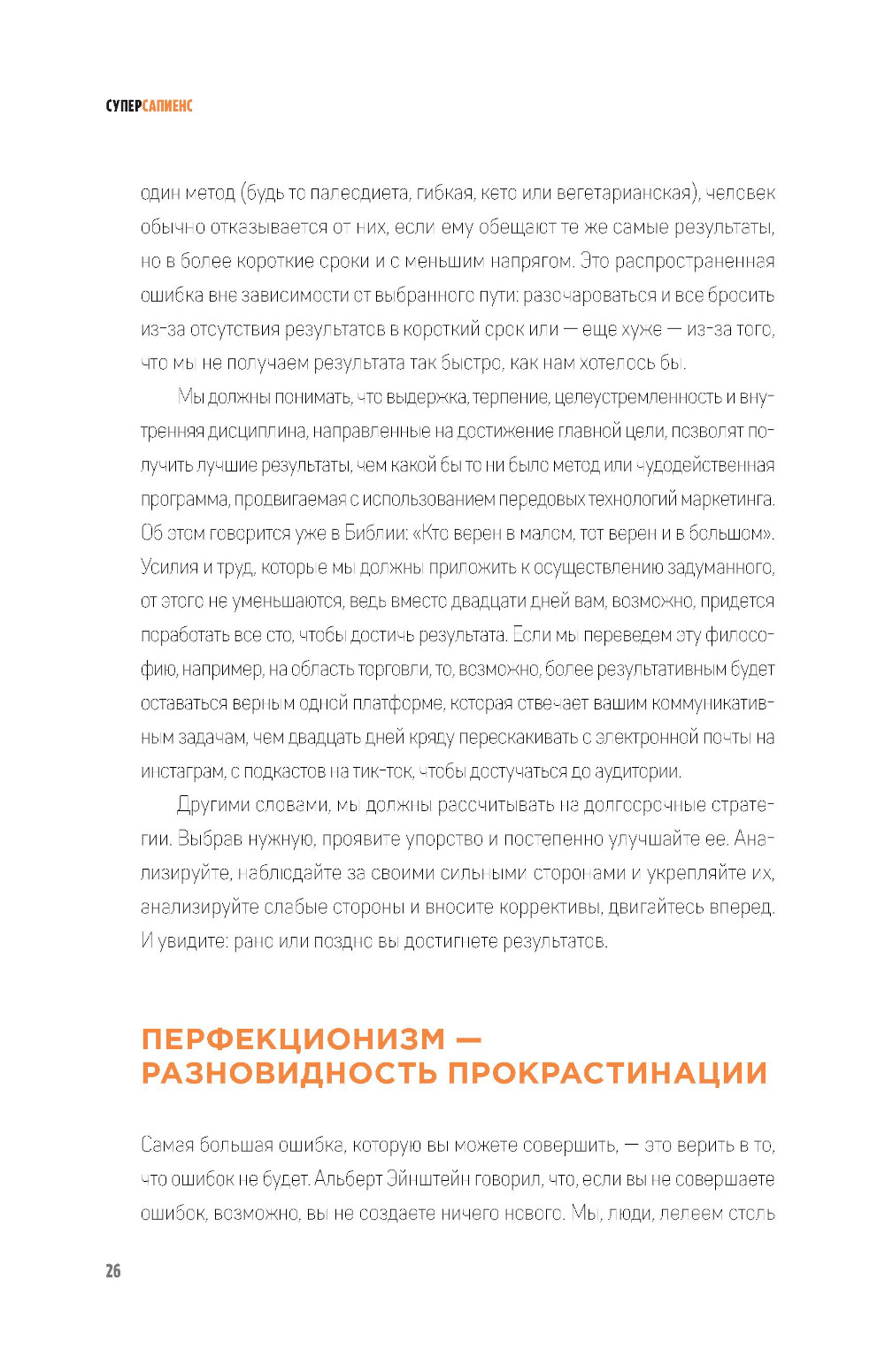 Нерешительность - самая распространенная причина неудач. Собираться порвать отношения с партнером и никак не находить в себе сил сделать это. Размышлять о поисках лучшей жизни в другой стране и изучении языка, но раз за разом придумывать отговорки. Хотеть уйти с работы, на которой у тебя, по твоим ощущениям, нет будущего, но оставаться на ней из страха, что не найдешь ничего лучшего. Мечтать об идеальной физической форме и постоянно переносить занятия на «следующий понедельник». Открыть свой бизнес и планировать совершить прорыв, который принесет тебе финансовую свободу, но продолжать двигаться по прежней траектории. Все это - следствия прокрастинации, или привычки откладывать на потом. В своей книге Педро Вивар дает нам ключ к пониманию того, как работает прокрастинация и каким образом ее побороть, чтобы максимально развить наши физические и ментальные способности. Он предлагает ряд стратегий и инструментов, с помощью которых мы можем в полной мере раскрыть свой потенциал. Опираясь как на популярные философские системы, так и на последние изыскания современной психологии, автор представляет нашему вниманию концепцию личности «суперсапиенса». Начав с самых простых действий, которые мы можем внедрить в свою повседневную жизнь, мы шаг за шагом учимся быть более активными, дисциплинированными, ответственными и в конечном счете познавать самих себя, чтобы стать своей улучшенной версией.