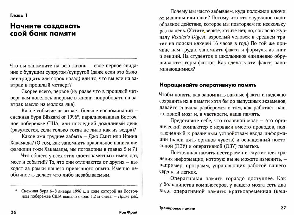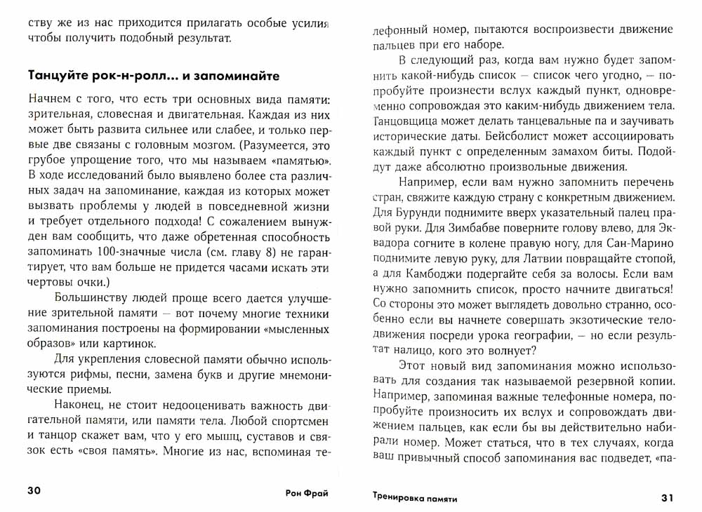 Эта книга, выдержавшая шесть переизданий в США и Европе, предлагает читателю простые, нетривиальные и действенные способы для запоминания сведений разной степени сложности. Нужно быстро подготовиться к экзамену, контрольной работе, докладу или проведению презентации, но нет уверенности в том, что в самый ответственный момент память не подведет? Кажется невозможным запомнить иностранные слова, сложные термины и речевые конструкции? Не можете сосредоточиться при запоминании больших объемов информации? Эта книга для вас! Упражнения по мнемотехнике, приведенные на страницах «Тренировки памяти», обязательно помогут справиться с вышеперечисленными проблемами. Автор методики профессор Рональд Фрай является признанным в США авторитетом в области педагогики и автором нескольких десятков бестселлеров по эффективному образованию. Книга адресована школьникам, студентам, их родителям и педагогам, а также всем, кто продолжает учиться и узнавать новое, не желая останавливаться на достигнутом.| Издательство | Альпина Паблишер |