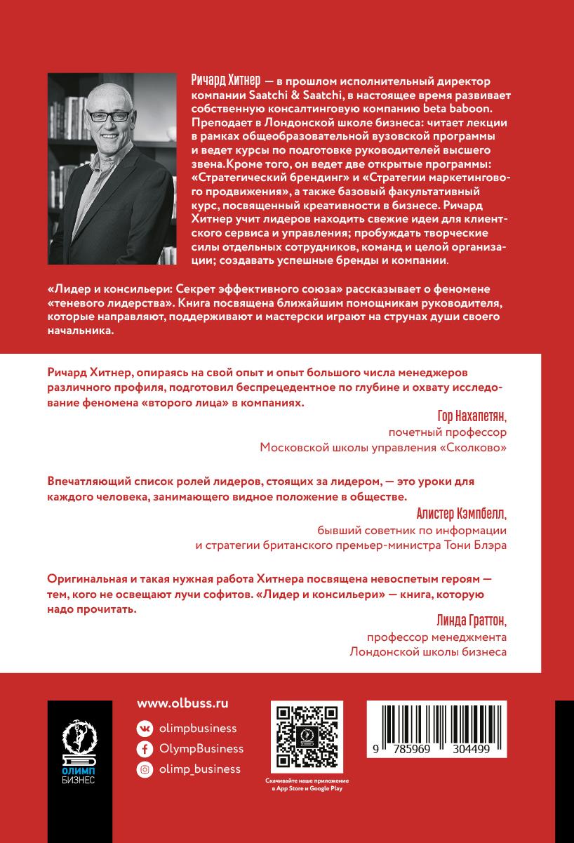 «Лидер и консильери» - одно из немногих изданий по психологии лидерства и управлению компаниями, посвященное второму эшелону управленцев: исполнительным и операционным директорам, вице-президентам, заместителям, советникам, чье влияние может определять судьбы стран, политических партий, мультинациональ-ных корпораций и некоммерческих организаций. Исследуя феномен «второго по званию», автор рассматривает особенности теневого лидерства, качества, необходимые для этой роли, а также способы выстраивания эффективного взаимодействия с первым лицом организации. Советы и рекомендации, изложенные в «Лидере и консильери», не ограничены сферой управления, поэтому книга будет интересна как опытным и начинающим управленцам, так и широкому кругу читателей. Ранее книга выходила под названием «Консильери : Лидер в тени».| Издательство | Олимп-Бизнес |