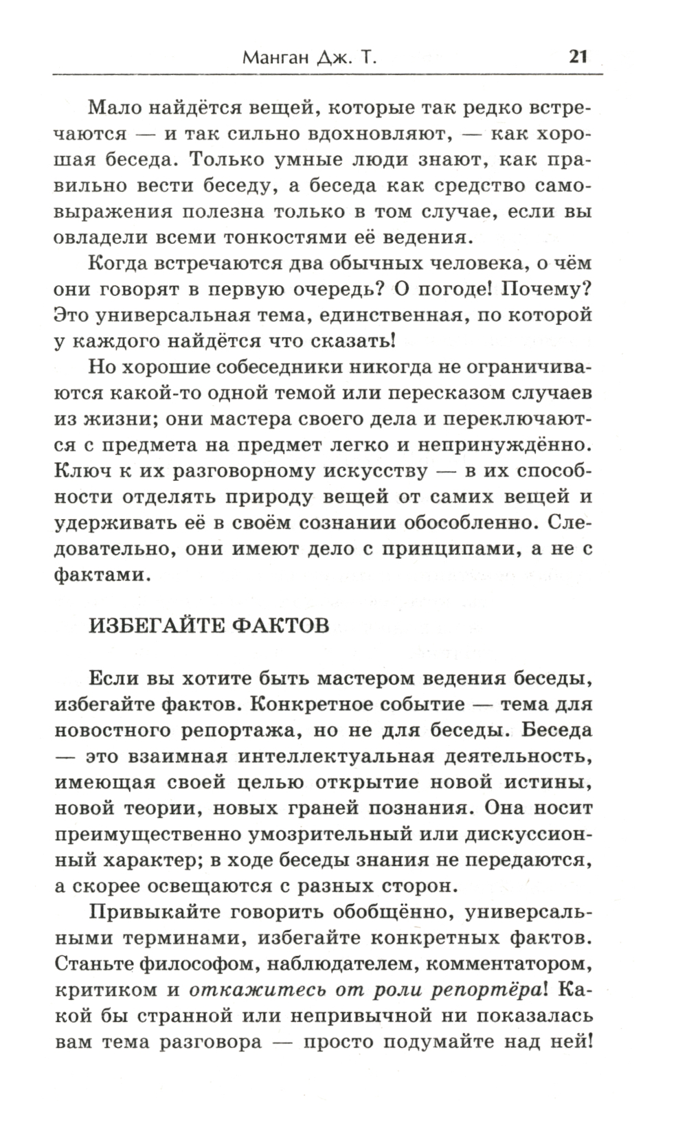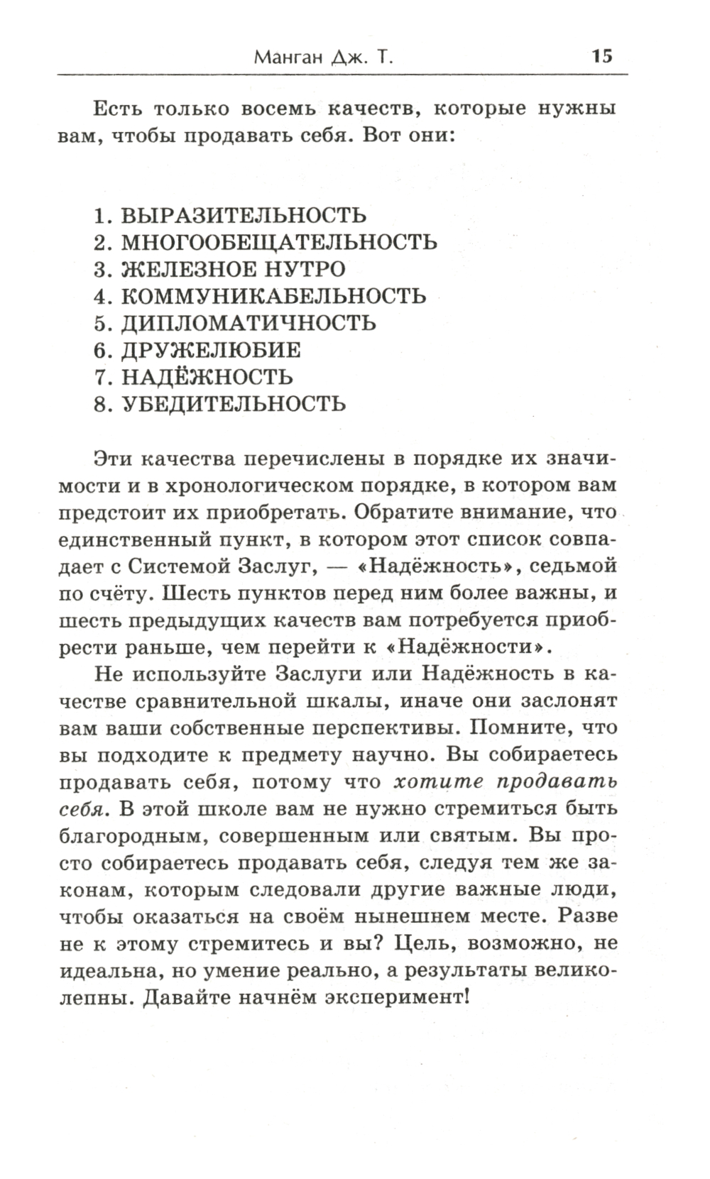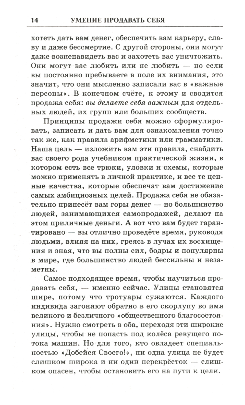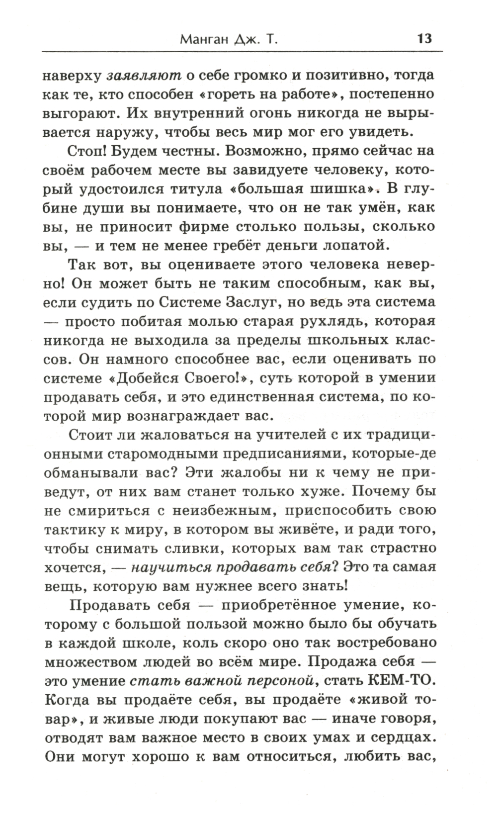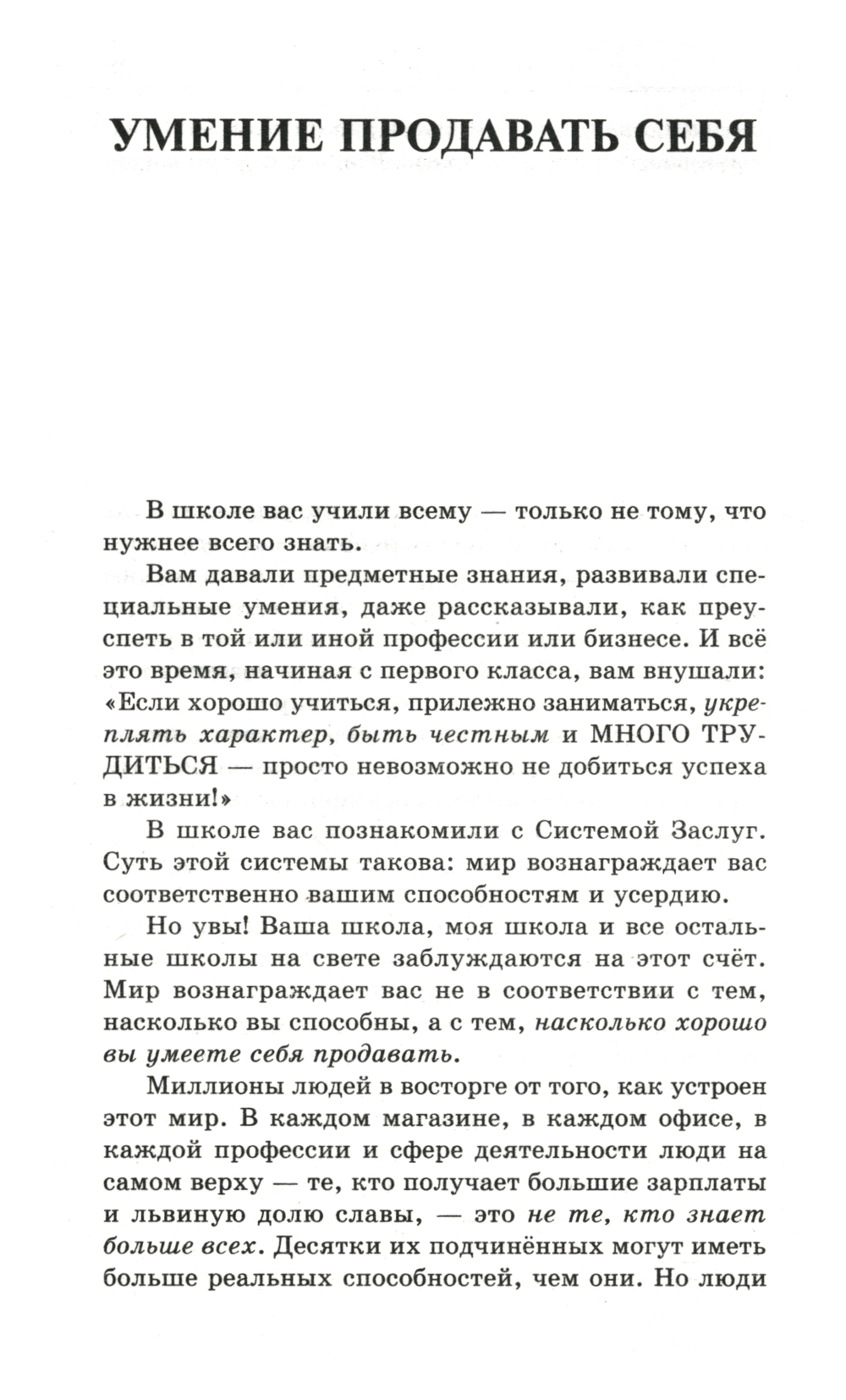 Мир несправедлив. Деньги и славу зачастую получают не те, у кого больше знаний и умений. Увы, мир вознаграждает не самых способных, а тех, кто умеет продвигать себя, или, говоря циничнее, продавать себя. Пока мир таков, надо научиться играть по этим правилам и - выигрывать, а не выживать или погибать. После того, как вы научитесь продвигать себя, большинство других ваших проблем, связанных с материальным успехом, будут решены автоматически. Принципы продвижения себя можно сформулировать точно так же, как правила арифметики или грамматики. Что и делает в своей книге Джеймс Т. Манган. Он излагает эти правила, снабжает вас своего рода учебником практической жизни, в котором есть все трюки, уловки и схемы, которые можно применять в личной практике, и все те ценные качества, которые обеспечат вам достижение самых амбициозных целей. Вы думаете, что слишком застенчивы, робки, боитесь людей или слишком невежественны, чтобы оказаться в центре внимания. Вы будете говорить, что все нужные для этого качества даются человеку от рождения. Но вы ошибаетесь! Умение продвигать себя - это приобретённый навык. Продажа себя - это умение стать важной персоной, стать КЕМ-ТО. Это стоит того, чтобы попытаться - не будьте настолько глупы, чтобы говорить себе, что это невозможно, даже не сделав честной попытки. Сделайте её - и вы увидите, как произойдёт чудо!| Издательство | Крылов |