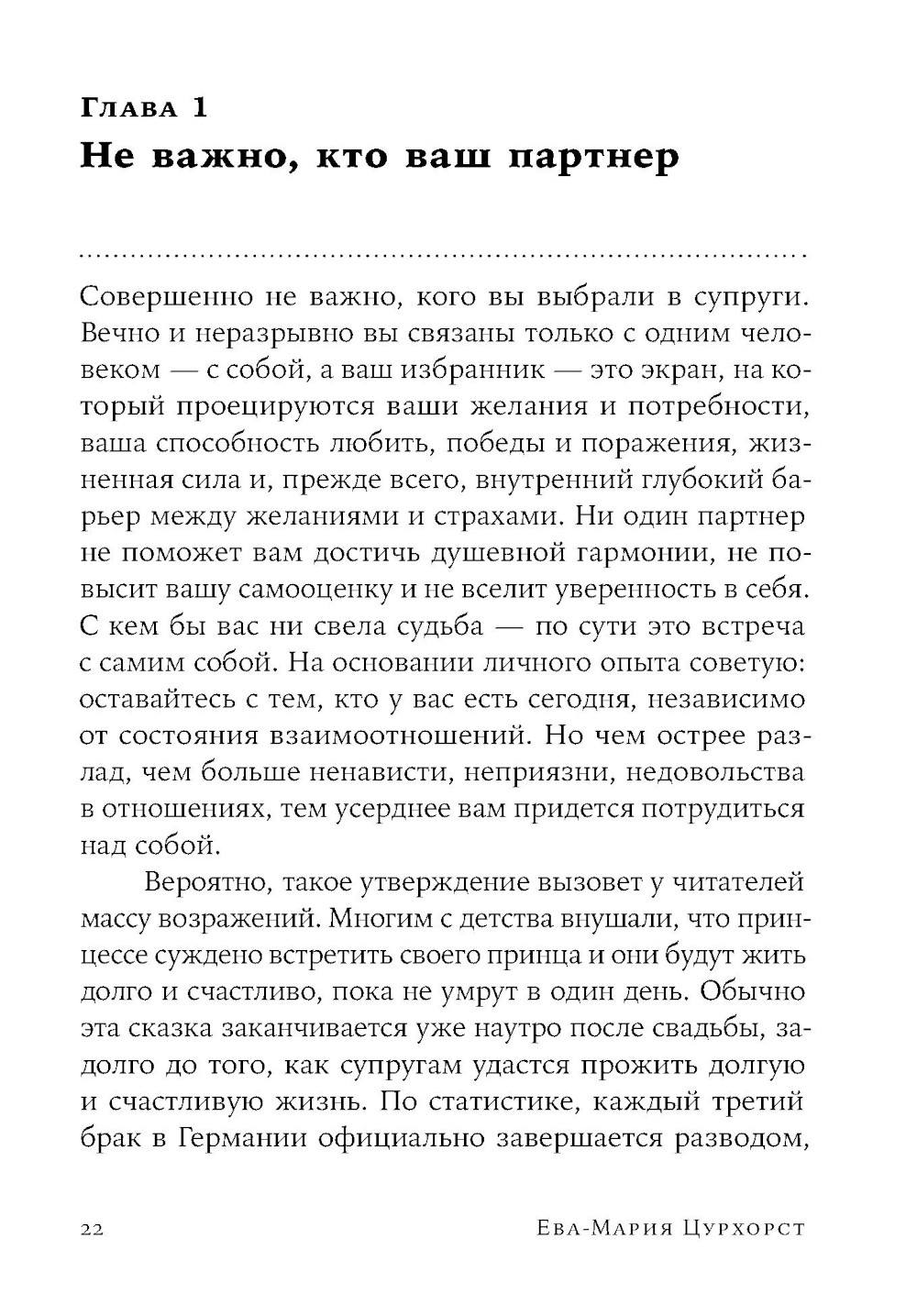 Если вы чувствуете, что любовь прошла и отношения стали натянутыми, это еще не повод планировать развод или пускаться во все тяжкие, считает популярный в Германии и во всем мире психотерапевт Ева-Мария Цурхорст. Постарайтесь для начала честно и объективно оценить, чего на самом деле вы (а не ваши родители, общество или друзья) ждете от этих отношений, и расскажите о своих стремлениях партнеру. Из книги вы узнаете, что мешает вам жить счастливо с выбранным партнером, как перестать наступать на одни и те же грабли в отношениях и почему поиски идеального партнера бесплодны, пока вы не полюбите себя самого. Основана на личном опыте, а также на опыте тысяч пар, которым автор уже помогла.| Издательство | Альпина Паблишер |