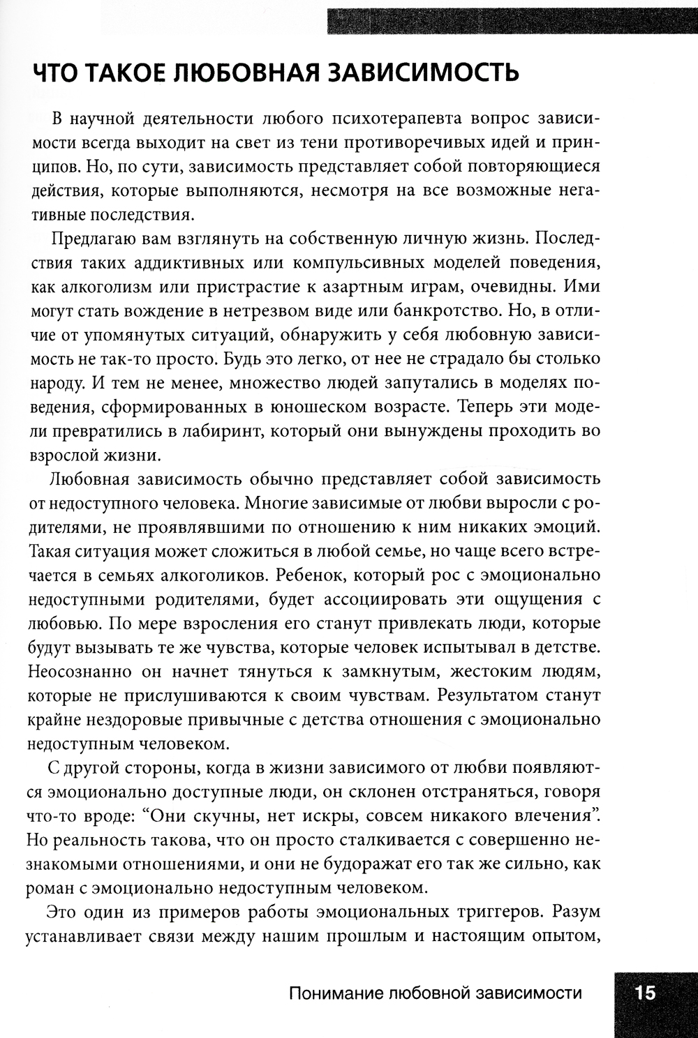 Любовная зависимость - это модель навязчивого поведения в романтических отношениях, которая может навредить вашему счастью и взаимоотношениям с другими людьми. Но исцеление возможно! В этой рабочей тетради вы найдете множество советов и идей, которые помогут понять, как устроен цикл любовной зависимости, как избавиться от привычек, которые вас сдерживают. С помощью эксперта вы оцените свои прошлые отношения и определите причину проблем. Затем познакомитесь с проверенными методами для создания здоровых и прочных отношений, которых вы заслуживаете. Основные темы книги: - Глубокие погружения помогут провести осмысленный полноценный самоанализ с помощью различных инструментов, начиная от быстрых ответов на вопросы и тестов до руководства по постановке целей и созданию собственной системы поддержки; - Истории других людей способствуют обретению надежды и уверенности. Вы узнаете о примерах из жизни других людей, сумевших снова почувствовать себя счастливыми, избавившись от любовной зависимости; - Практические упражнения - это короткие, простые задания, которые можно выполнить прямо в книге, чтобы сразу же начать свой путь к избавлению от любовной зависимости.| Издательство | Диалектика |