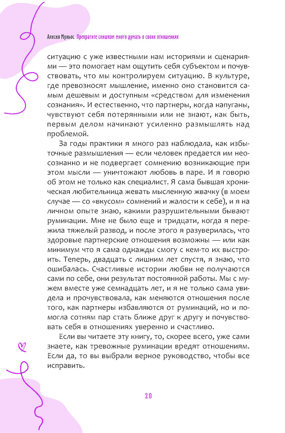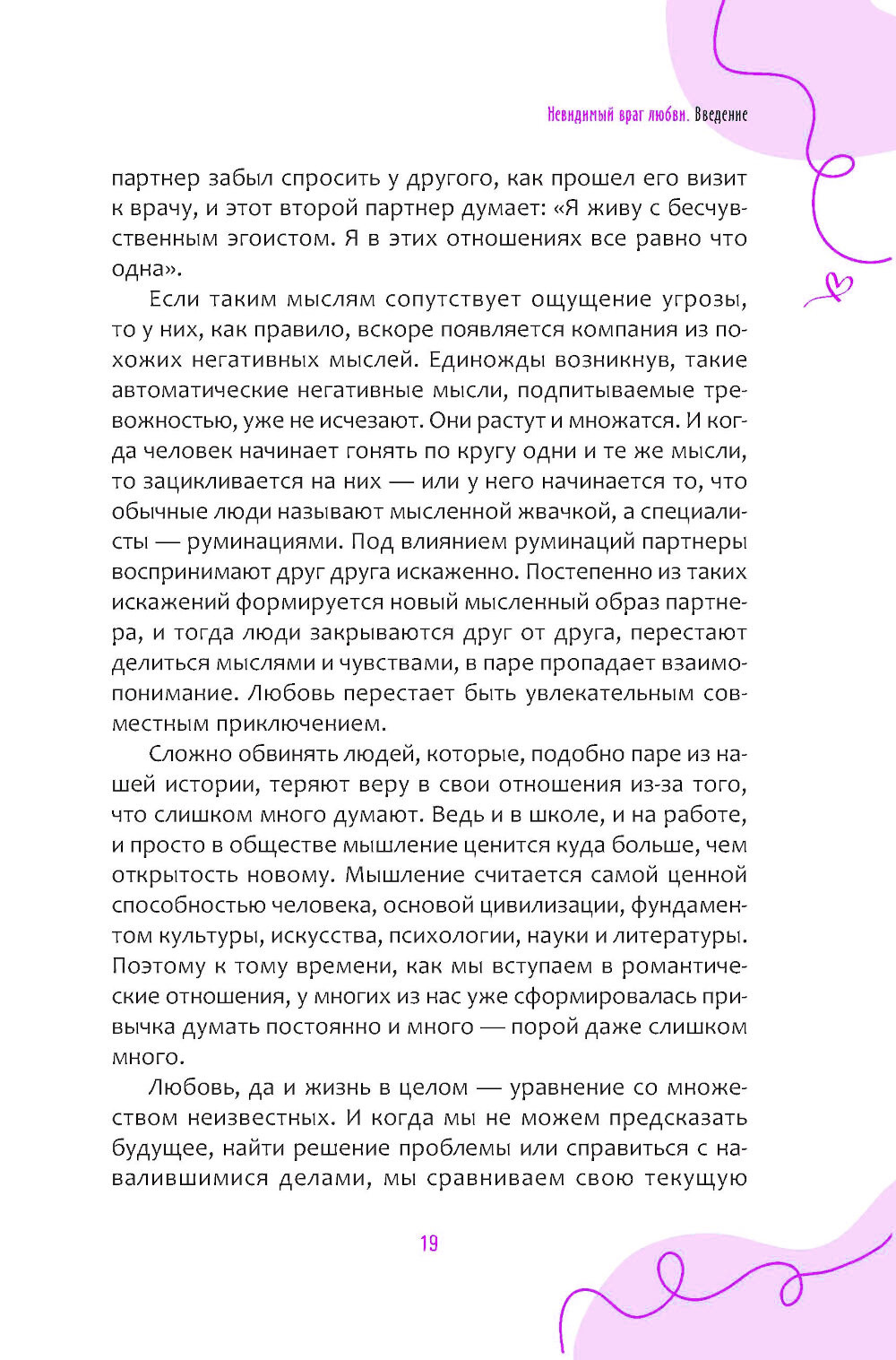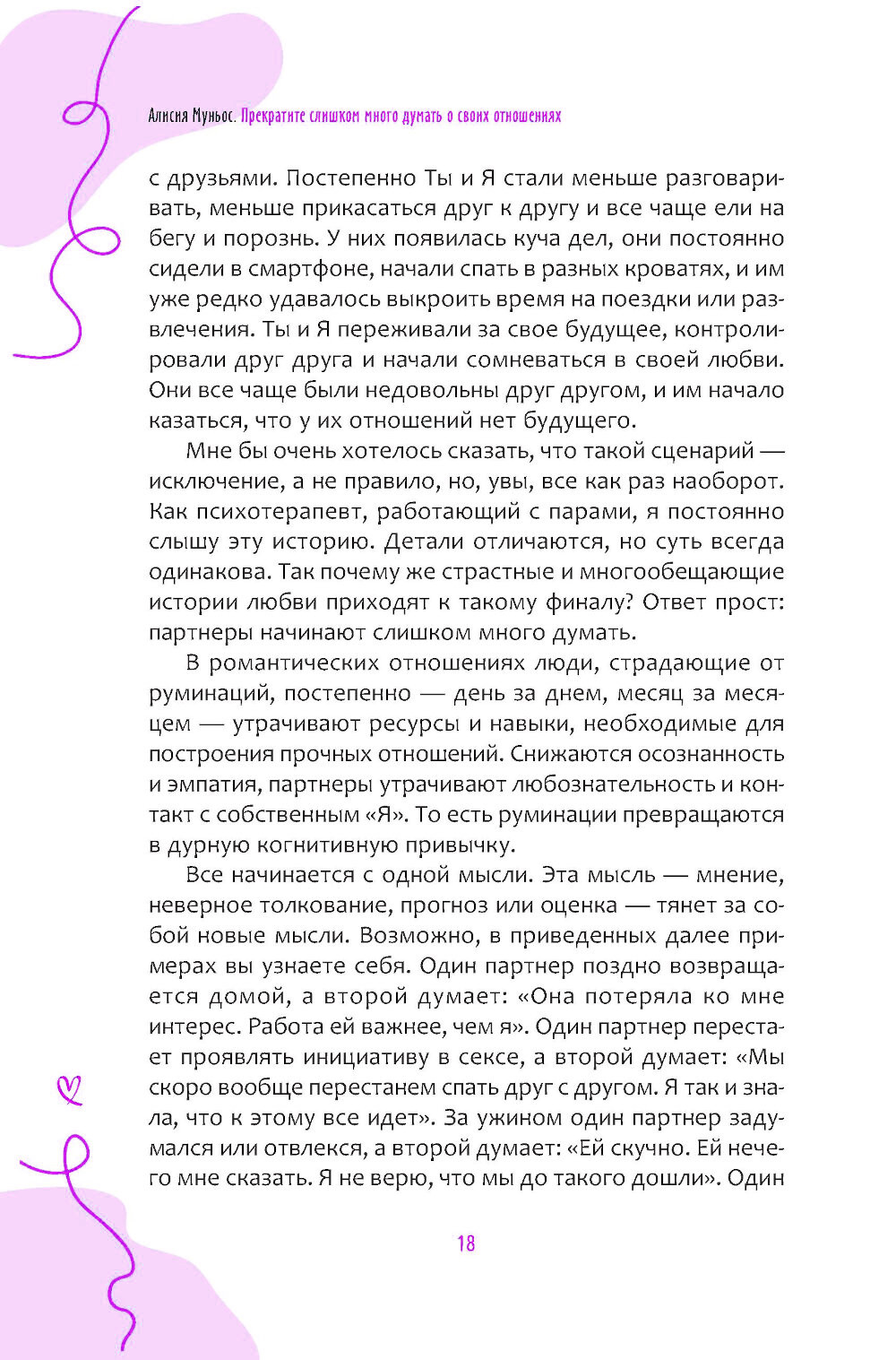 «Все начинается с одной мысли. Эта мысль - мнение, неверное толкование, прогноз или оценка - тянет за собой новые мысли. Единожды возникнув, они, подпитываемые тревожностью, уже не исчезают. Они растут и множатся, и вы начинаете гонять их по кругу. Постепенно у вас формируется новый мысленный образ партнера, и тогда вы закрываетесь друг от друга, перестаете делиться переживаниями и чувствами, в паре пропадает взаимопонимание. Вы все чаще недовольны друг другом, и вам начинает казаться, что у отношений нет будущего... Как психотерапевт, работающий с парами, я постоянно слышу эту историю. Детали отличаются, но суть всегда одинакова. Так почему же страстные и многообещающие истории любви приходят к такому финалу? Ответ прост: кто-то из партнеров начинает слишком много думать. Если вы выбрали эту книгу, то, скорее всего, уже сами знаете, как тревожные мысли вредят отношениям. И вы нашли верное руководство, чтобы все исправить».| Издательство | ИГ Весь |