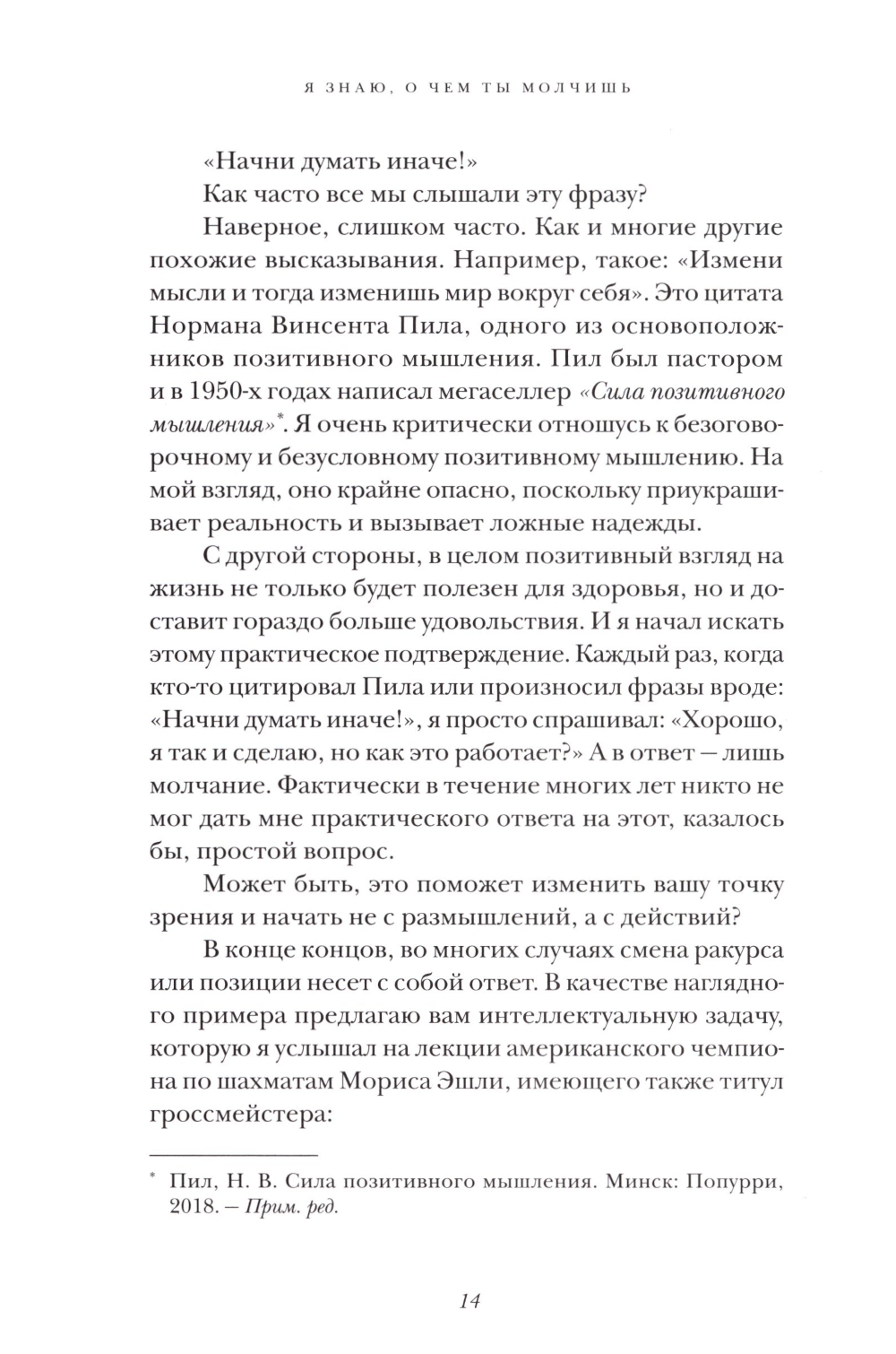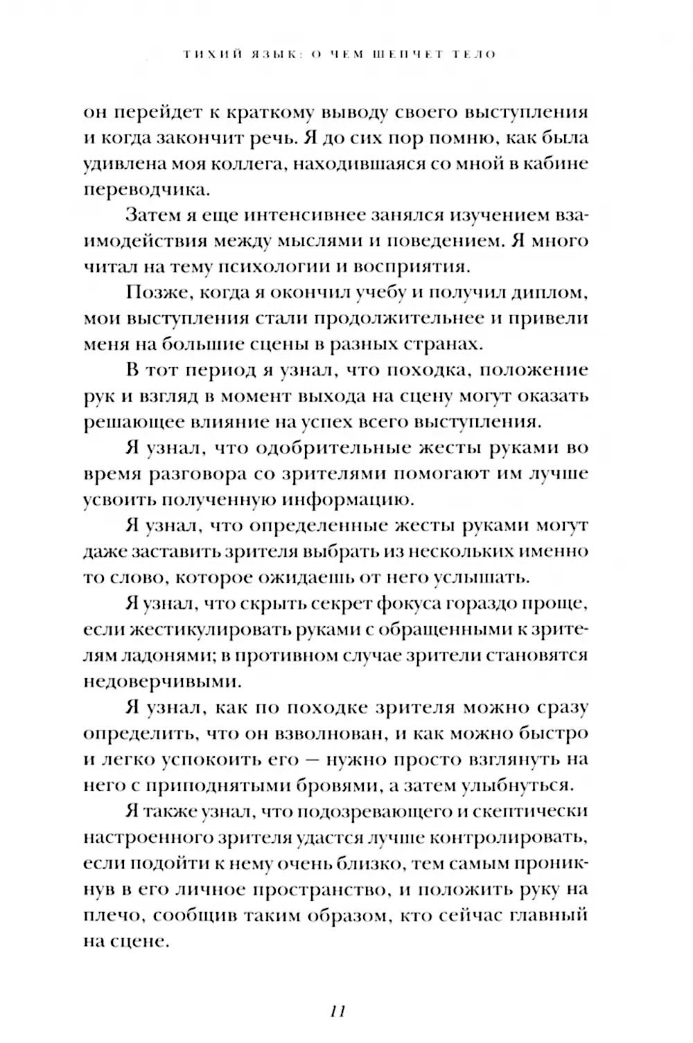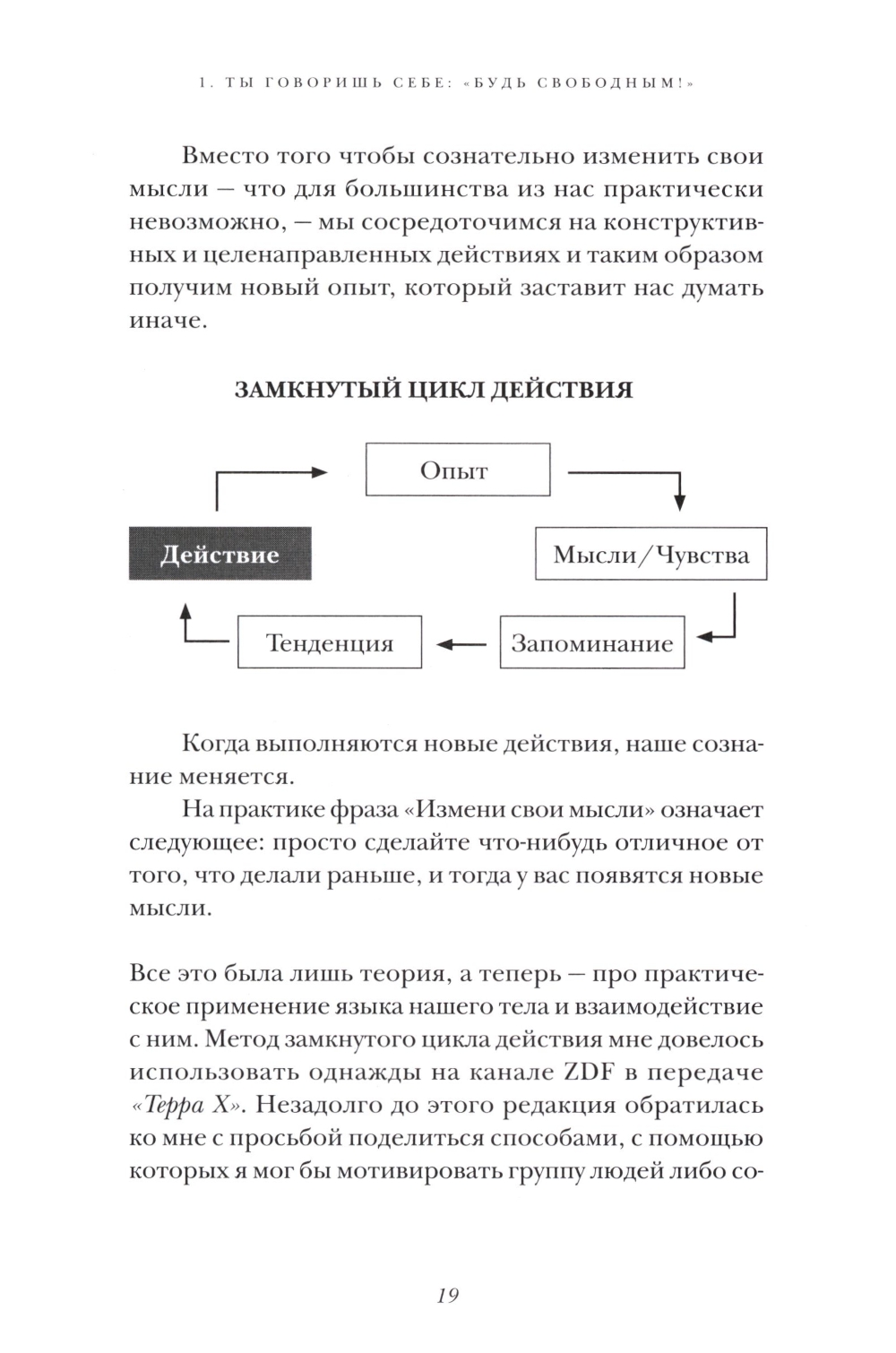 Как читать мысли, не имея экстрасенсорных способностей? Не удивляйтесь, это возможно, ведь тело выдает то, что у нас уме! Где же найти словарь, который поможет читать людей, как книги? Популярный менталист - мастер психологических фокусов - научит понимать язык тела. В своей книге он показывает, как чужие мысли становятся видимыми - благодаря умению наблюдать и замечать детали. Но не спешите! Ведь чтобы понять других, нужно сначала разобраться в том, как мы думаем и насколько тесно наши мысли связаны с действиями. Только после этого мы сможем посмотреть на окружающих, выявить их истинные намерения и сами измениться к лучшему. Благодаря этой книге вы узнаете: - как создать доверительную обстановку, используя позы и жесты; - как выглядеть увереннее и убедительнее; - как провести удачное выступление; - как по одной лишь походке узнать, что думает собеседник; - как быть эффективнее.| Издательство | Портал |
