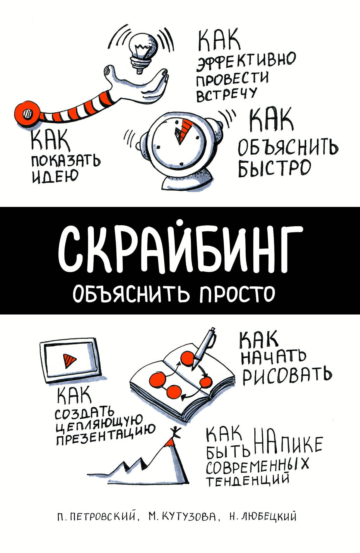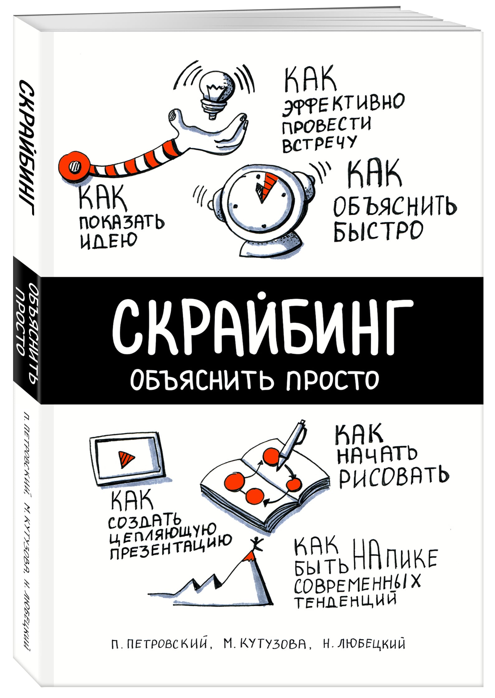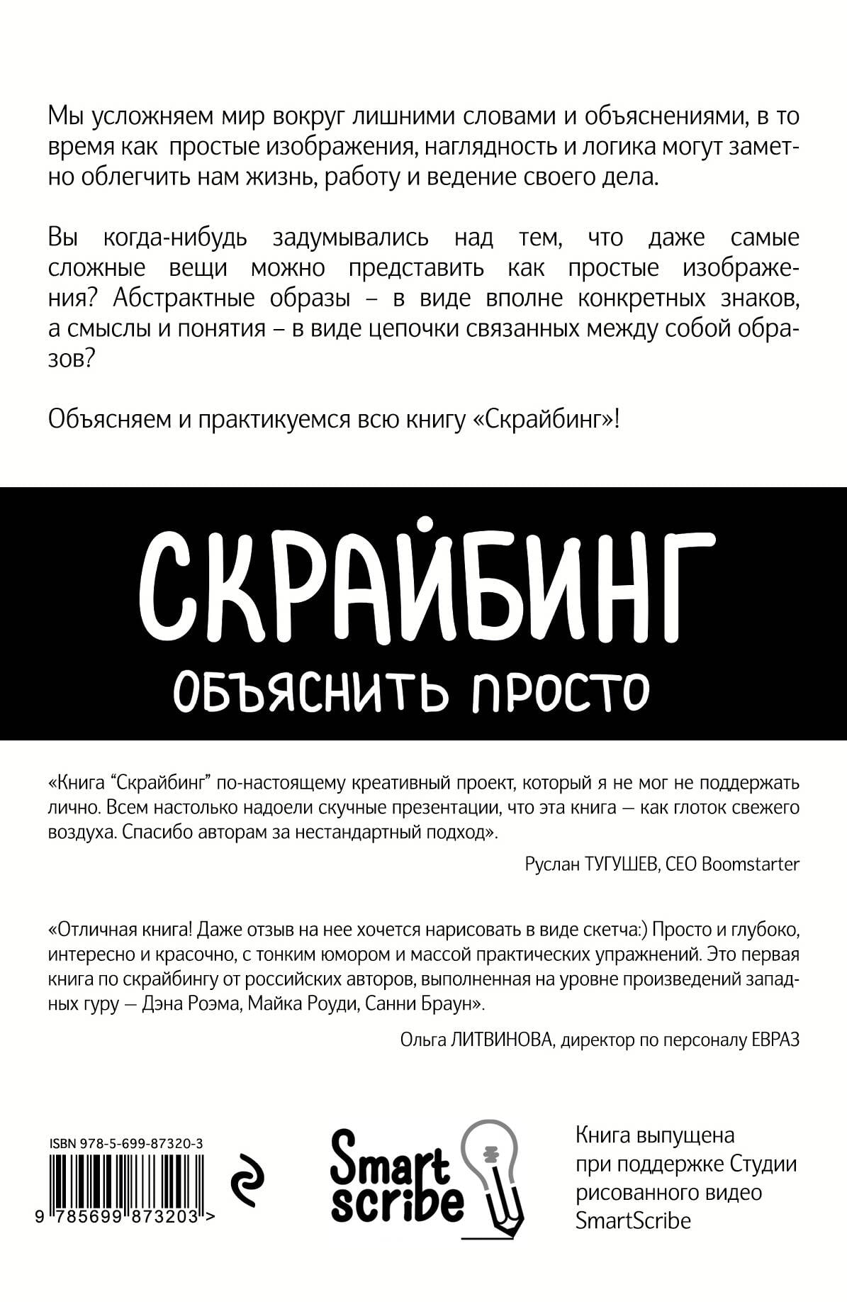 <p>О чем книга: <br /> Скрайбинг - это процесс визуализации основного смысла знаками и образами, при котором отрисовка образов происходит в процессе рассказа. Скрайбинг предназначен для объяснения сложных смыслов, образования, продвижения и рекламы, презентаций и докладов, ведения записей и дневников, создания рисованного видео - видеоскрайбинга.</p> <p>Для кого эта книга: <br /> Для руководителей, предпринимателей, менеджеров, бизнес-тренеров, фасилитаторов, модераторов, спикеров, родителей и специалистов по работе с детьми, организаторов мероприятий. И просто для всех, кто хочет научиться объяснять идеи и процессы так, чтобы это было понятно всем.</p> <p>Фишки книги: <br /> Первая книга по скрайбингу от российских авторов, выполненная на уровне произведений западных гуру - Дэна Роэма, Майка Роуди, Санни Браун. <br /> Это книга-тренинг: теория и практика под одной обложкой. Все скетчи отрисованы вживую, без использования карандаша и предварительных эскизов. <br /> Есть простые задания для рисования и специальные страницы для практики.</p> <p>Об авторах: <br /> Мария Кутузова - эксперт в области графической фасилитации. Работает в Яндексе (направление презентационных технологий). Ведет открытые тренинги по скетчноутингу и скрайбингу. Автор нескольких программ тренингов по визуальной фасилитации (скетчноутингу и скрайбингу), а также дизайну презентаций.</p> <p>Николай Любецкий - предприниматель, сооснователь студии рисованного видео SmartScribe, ведет тренинги по скрайбингу. Студия выпустила более 150 видео, помогающих объяснять, обучать и продавать. Среди клиентов: «Билайн», «Деловая среда Сбербанка», «Яндекс Деньги», WorldClass, ФРИИ (Фонд развития интернет инициатив), телекоммуникационная компания «Энфорта», бухгалтерский сервис «Кнопка», кинокомпания GalaxyVision, «Газпромнефть», фармацевтическая компания «Протек», десятки небольших компаний и стартапов.</p> <p>Павел Петровский - сооснователь студии скрайбинга «SmartScribe. Двенадцать лет назад основал Международную группу компаний «РосРазвитие». Более двух лет занимается скрайбингом, организует и проводит тренинги по скрайбингу. Является одним из инициаторов продвижения скрайбинга в России.</p> <p>Отзывы: <br /> «Книга "Скрайбинг" по-настоящему креативный проект, который я не мог не поддержать лично. Всем настолько надоели скучные презентации, что эта книга - как глоток свежего воздуха. Спасибо авторам за нестандартный подход». <br /> Руслан Тугушев, CEO Boomstarter</p> <p>«Отличная книга! Даже отзыв на нее хочется нарисовать в виде скетча:) Просто и глубоко, интересно и красочно, с тонким юмором и массой практических упражнений. Это первая книга по скрайбингу от российских авторов, выполненая на уровне произведений западных гуру - Дэна Роэма, Майка Роуди, Санни Браун». <br /> Ольга Литвинова, директор по персоналу ЕВРАЗ</p>| Издательство | ООО "Издательство "Эксмо" |