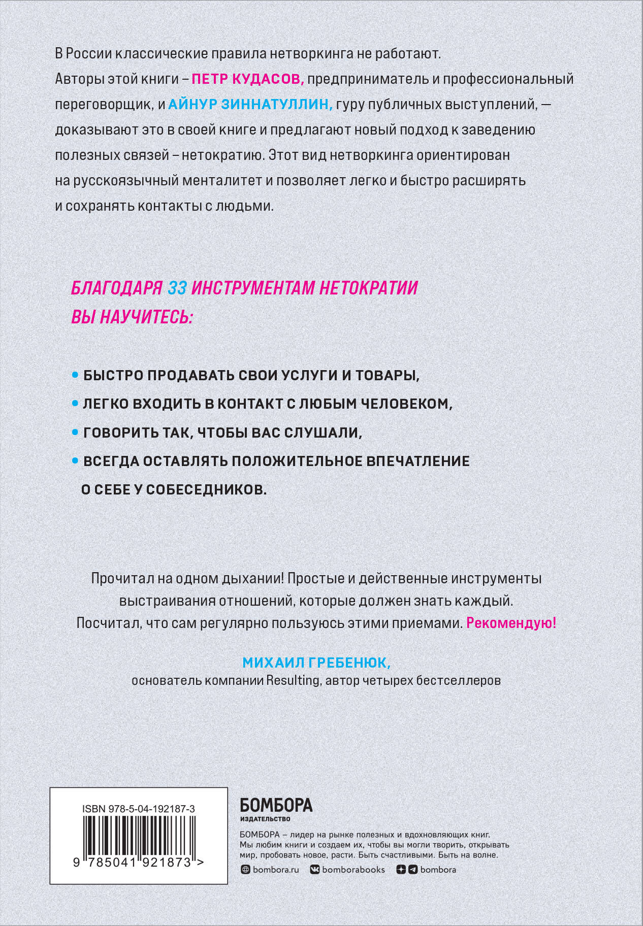 В России классические правила нетворкинга не работают. Авторы этой книги - Петр Кудасов, предприниматель и профессиональный переговорщик, и Айнур Зиннатуллин, гуру публичный выступлений - доказывают это в своей книге и предлагают новый подход к заведению полезных связей - нетократию. Этот вид нетворкинга ориентирован на русскоязычный менталитет и позволяет легко и быстро расширять и сохранять контакты с людьми. Благодаря 33 инструментам нетократии вы научитесь: - быстро продавать свои услуги и товары; - легко входить в контакт с любым человеком; - говорить так, чтобы вас слушали; - всегда оставлять положительное впечатление о себе у собеседников.| Издательство | ООО "Издательство "Эксмо" |