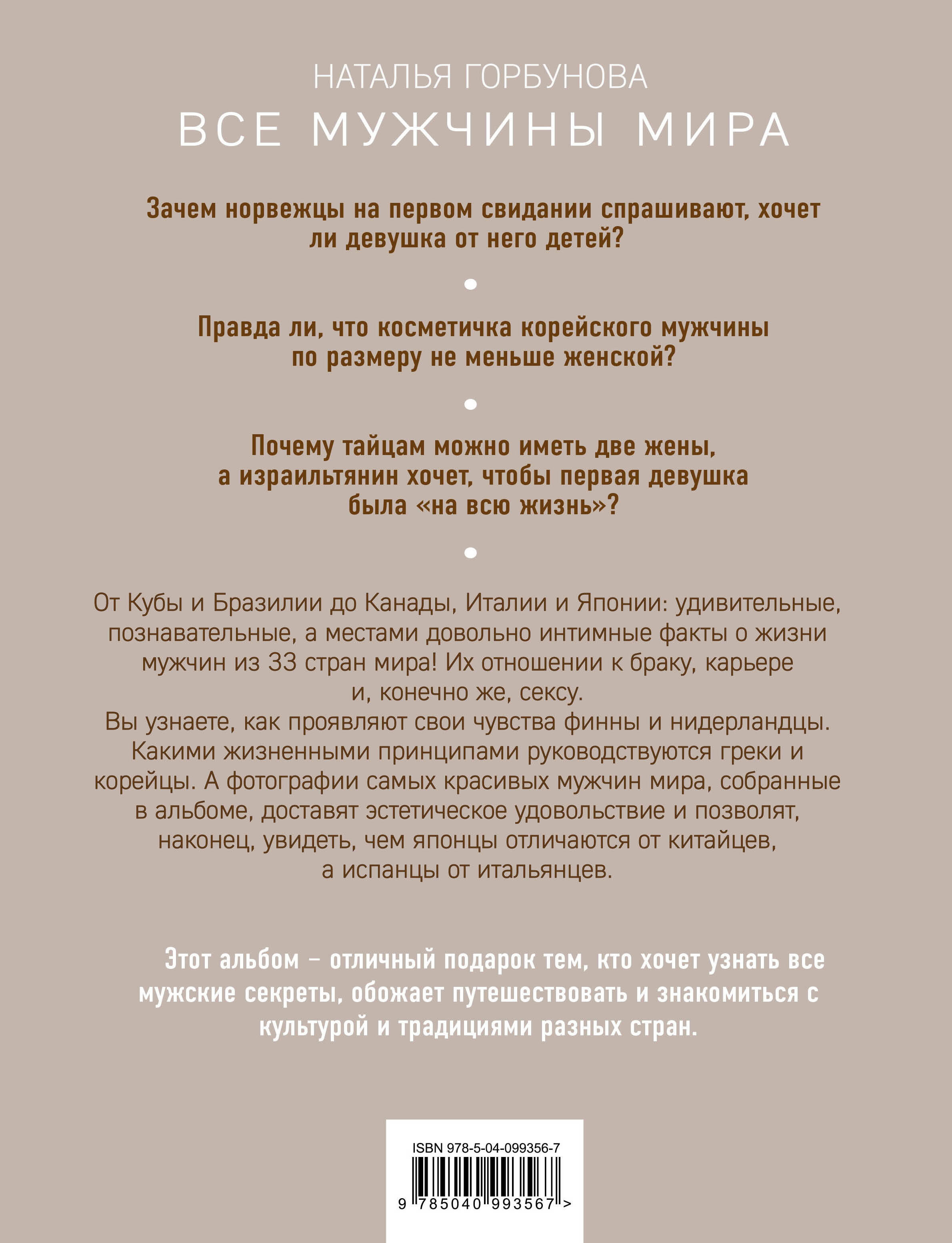 Зачем норвежцы на первом свидании спрашивают, хочет ли девушка от него детей? Правда ли, что косметичка корейского мужчины по размеру не меньше женской? Почему тайцам можно иметь две жены, а израильтянин хочет, чтобы первая девушка была «на всю жизнь»? Удивительные, познавательные, а местами довольно интимные факты о мужчинах из 33 стран - от Кубы и Бразилии до Канады, Италии и Японии. Самые интересные подробности о специфике их отношения к браку, карьере и, конечно же, к сексу. Вы узнаете, как проявляют свои чувства финны и нидерландцы. Какими жизненными принципами руководствуются греки и корейцы. А фотографии самых красивых мужчин мира доставят не только эстетическое удовольствие, но и позволят оценить, чем отличаются внешне, например, японцы от китайцев, а испанцы от итальянцев. Эта книга - отличный подарок не только для тех, кто хочет узнать о мужчинах больше, но и для всех, кто любит путешествовать, знакомиться с культурой разных стран и местными традициями.| Издательство | ООО "Издательство "Эксмо" |