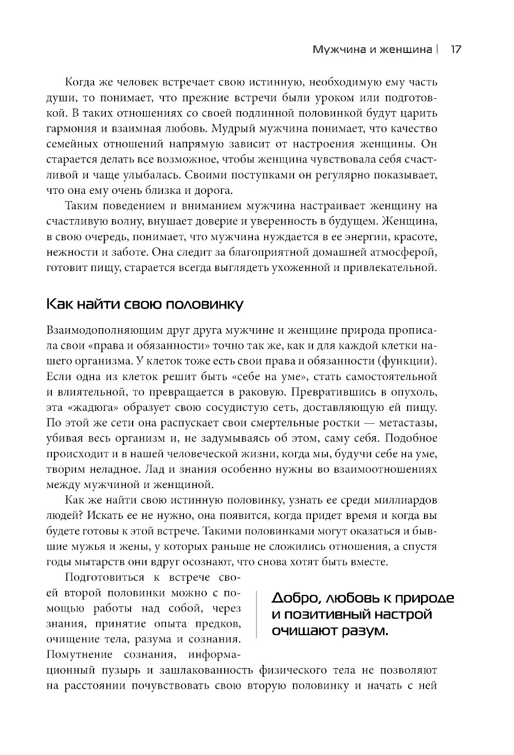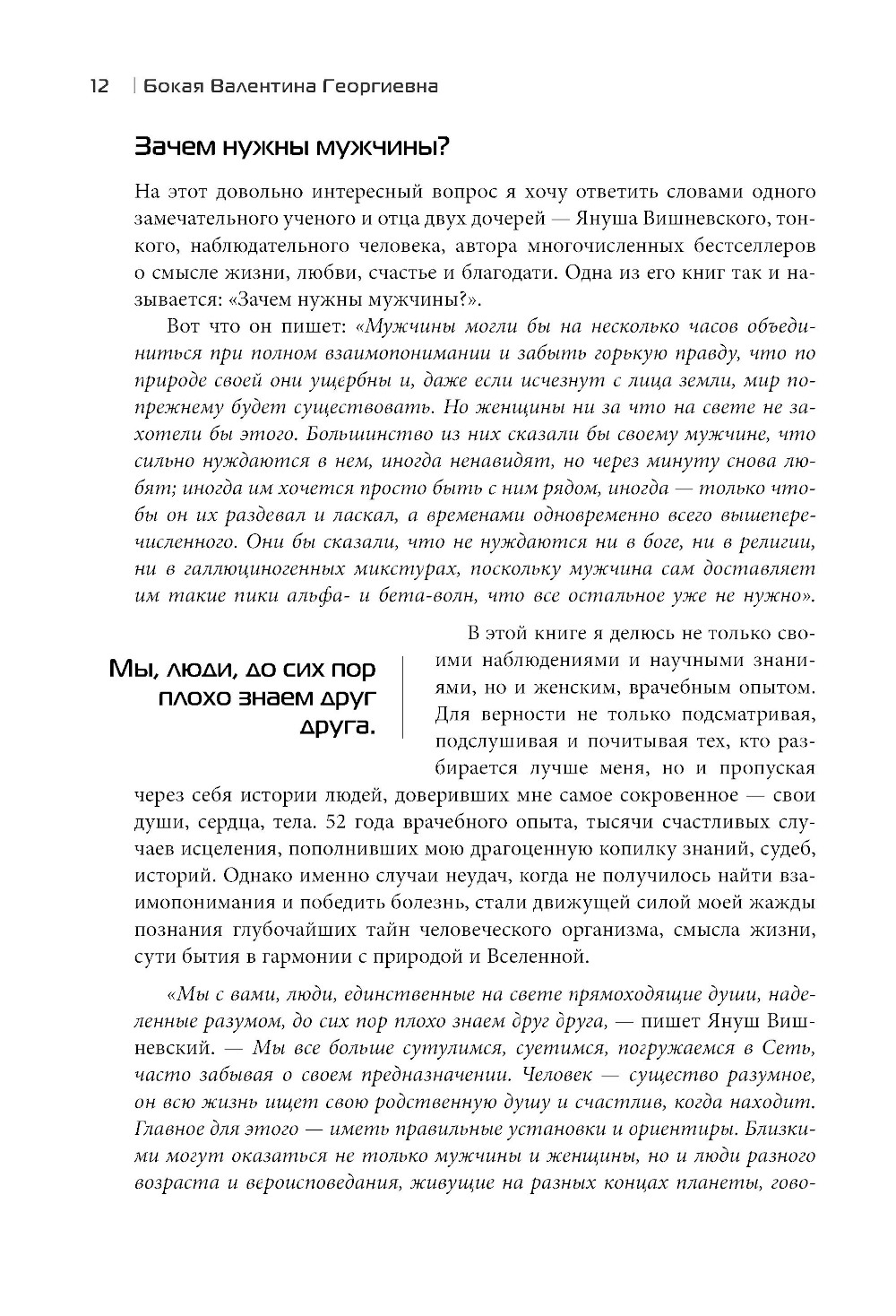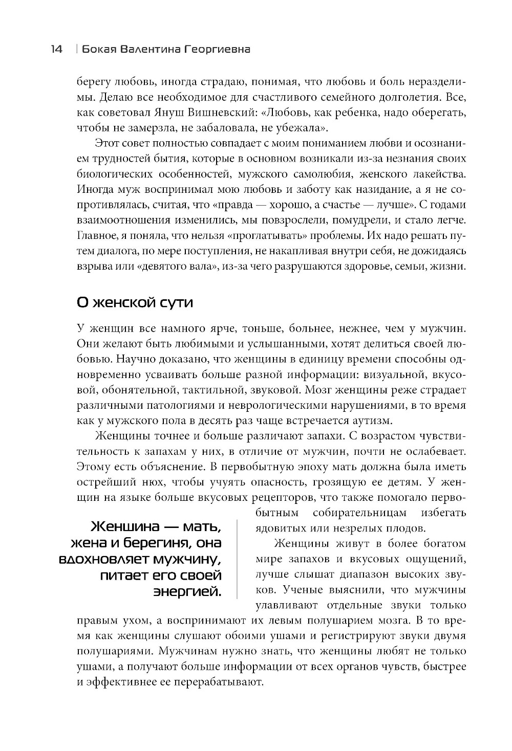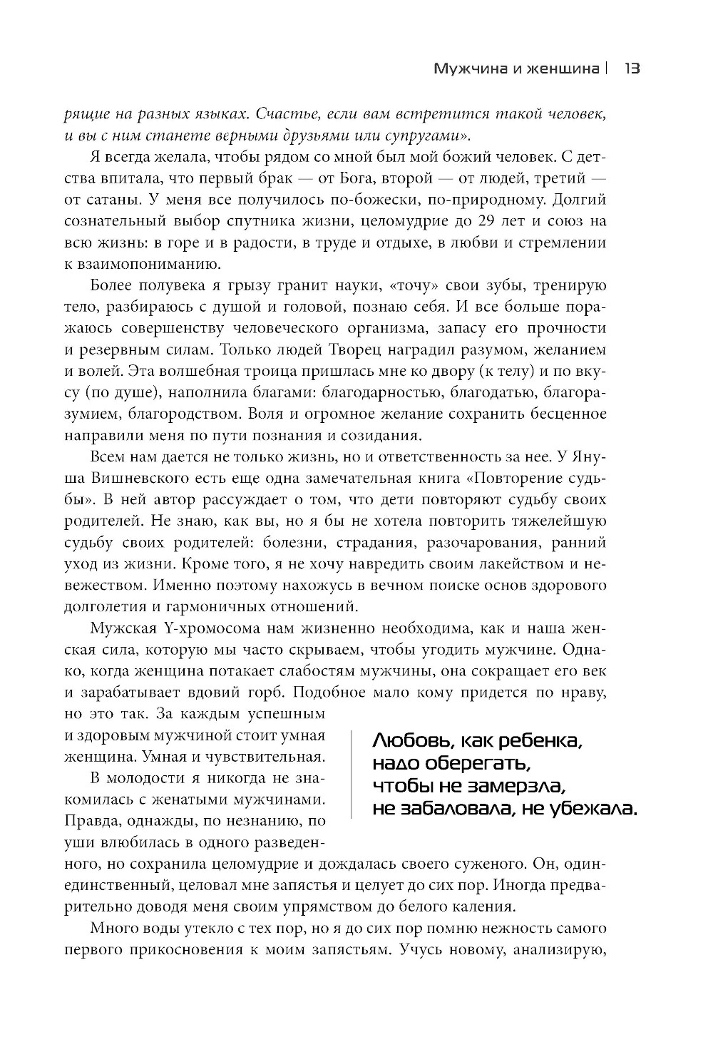 В книге затронуты важнейшие темы: отношения мужчин и женщин, семья, рождение детей и сохранение здоровья. Все то, что присутствует в жизни каждого из нас, делая ее удивительной, желанной, полной надежд и удовлетворения от сделанного и прожитого. Автор постаралась донести до современных женщин, как много необходимо знать и узнавать, насколько мудрее и бережнее нужно относиться к биологическим особенностям мужчин, не забывая, что они хрупкие и уязвимые. 80% мужчин умирают до выхода на пенсию, оставляя жен вдовами. Это страшная статистика. А мужчинам надо помнить, что женщины - берегини рода, и с благодарностью принимать женскую заботу.