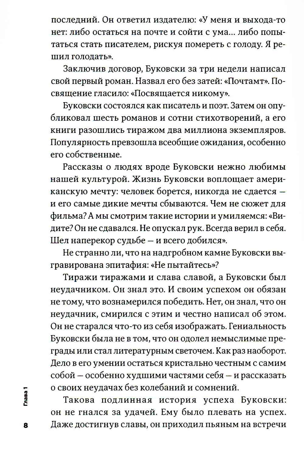 Современное общество пропагандирует культ успеха: будь умнее, богаче, продуктивнее - будь лучше всех. Соцсети изобилуют историями на тему, как какой-то малец придумал приложение и заработал кучу денег, статьями в духе «Тысяча и один способ быть счастливым», а фото во френдленте создают впечатление, что окружающие живут лучше и интереснее, чем мы. Однако наша зацикленность на позитиве и успехе лишь напоминает о том, чего мы не достигли, о мечтах, которые не сбылись. Как же стать по-настоящему счастливым? Популярный блогер Марк Мэнсон предлагает свой, оригинальный подход к этому вопросу. Его жизненная философия проста - необходимо научиться искусству пофигизма. Определив то, до чего вам действительно есть дело, нужно уметь наплевать на все второстепенное, забить на трудности, послать к черту чужое мнение и быть готовым взглянуть в лицо неудачам и показать им средний палец. В своей остроумной книге, мгновенно ставшей бестселлером №1 в Amazon, через истории жизненных неурядиц, провалов и лаж (как своих, так и известных людей) автор рассказывает, как овладеть этим тонким искусством пофигизма, зачем нужно быть менее уверенным в себе и что принцип «Делайте хоть что-нибудь» - отличная мотивация. Эта книга поможет вам жить легко вопреки всем трудностям, меньше волноваться и получать удовольствие от жизни.| Издательство | Альпина Паблишер |