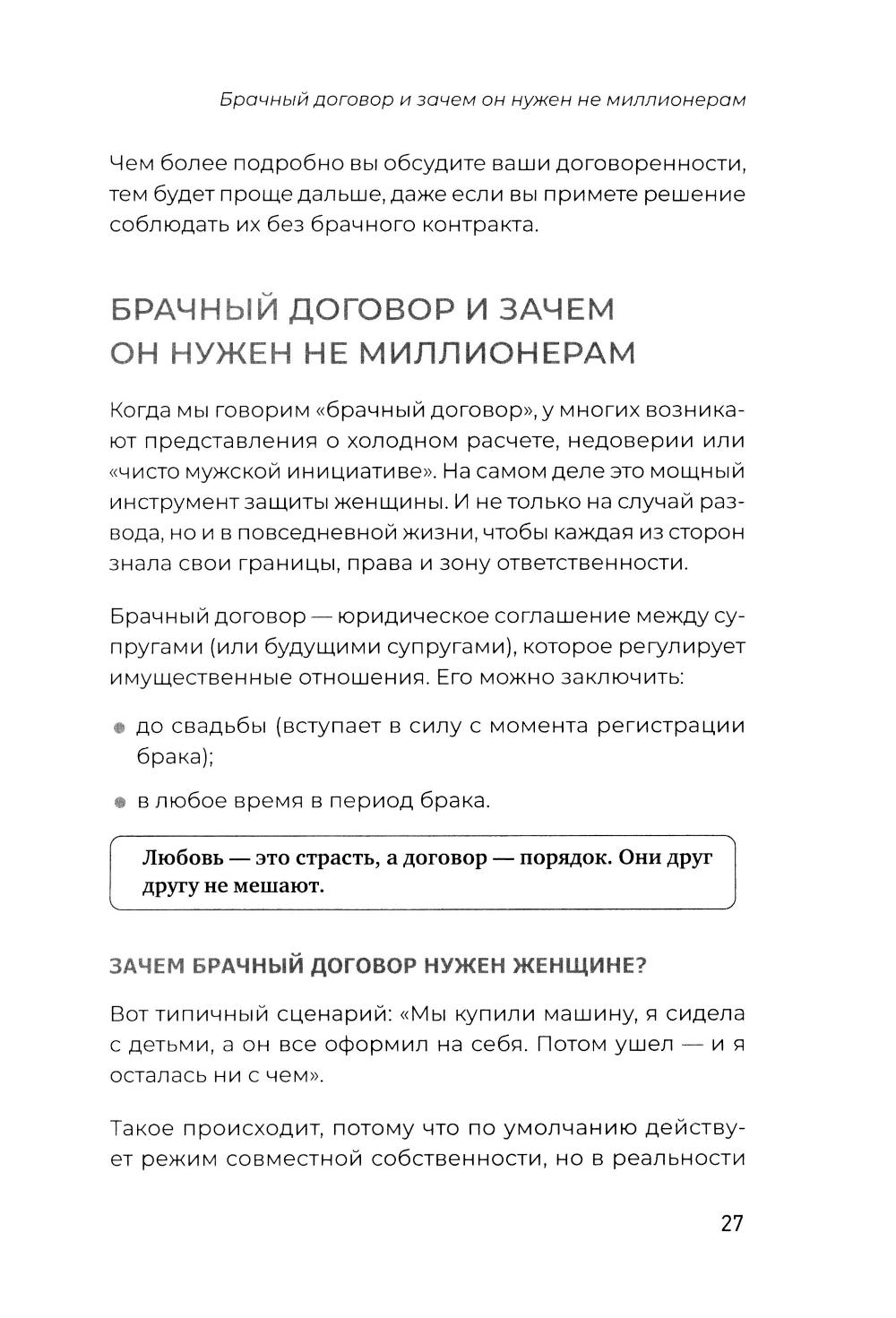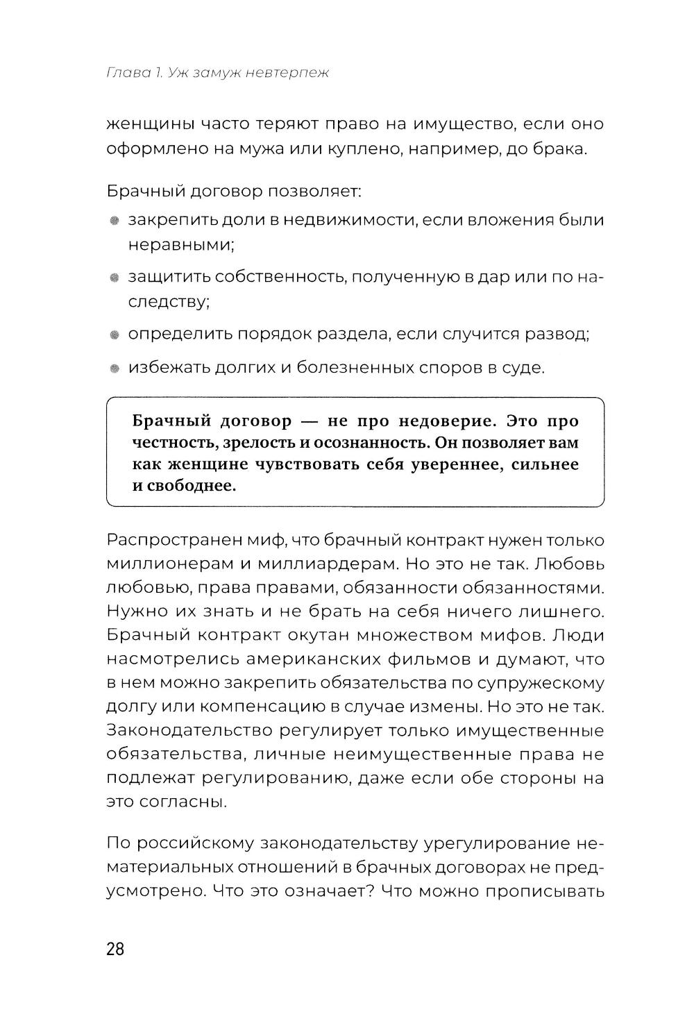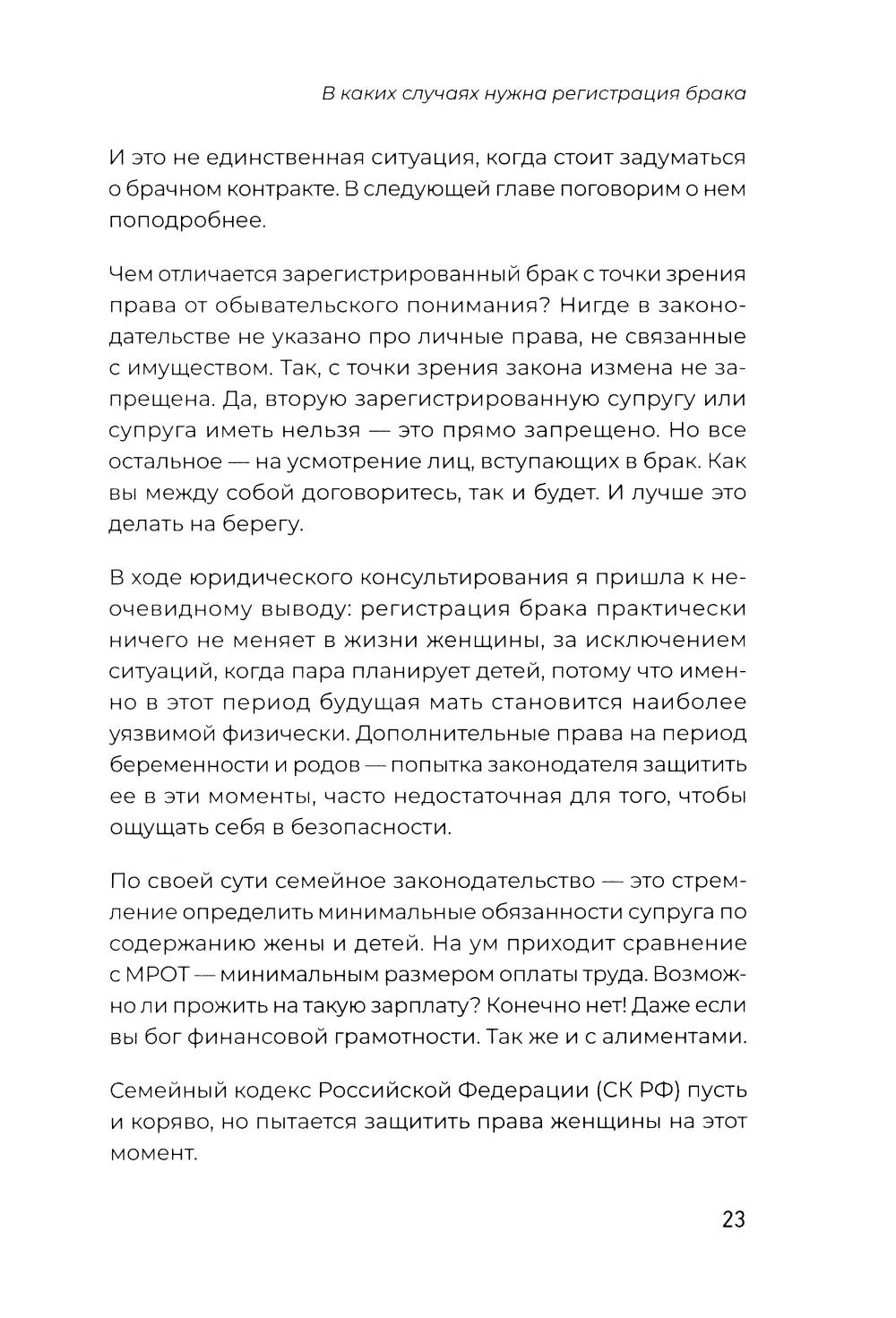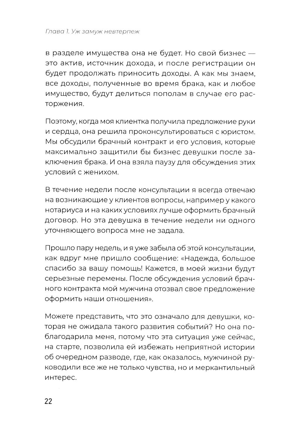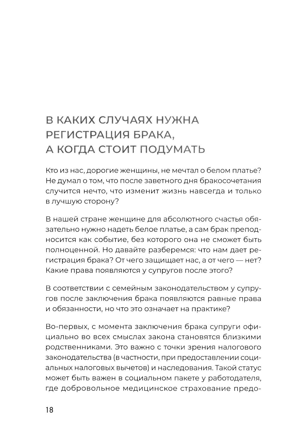 Знание закона, своих прав и обязанностей - сила, от которой отказываются обыватели до той поры, пока не случится нечто, требующее вмешательства юриста. Знать риски и предотвратить их легче и зачастую дешевле, чем разгребать последствия. В книге юриста с 22-летним стажем Надежды Дерменжи на примерах типичных житейских историй раскрываются нормы российского законодательства, направленные на защиту прав женщин. Вы узнаете, в каких случаях невыгодно выходить замуж, зачем стоит заключить брачный договор, даже если ваш избранник не миллионер, как защитить детей от нарушения их прав в больнице, детском саду, школе, как мягко развестись и даже о том, как любовнице получить (или не получить) свою долю в наследстве.| Издательство | Питер |