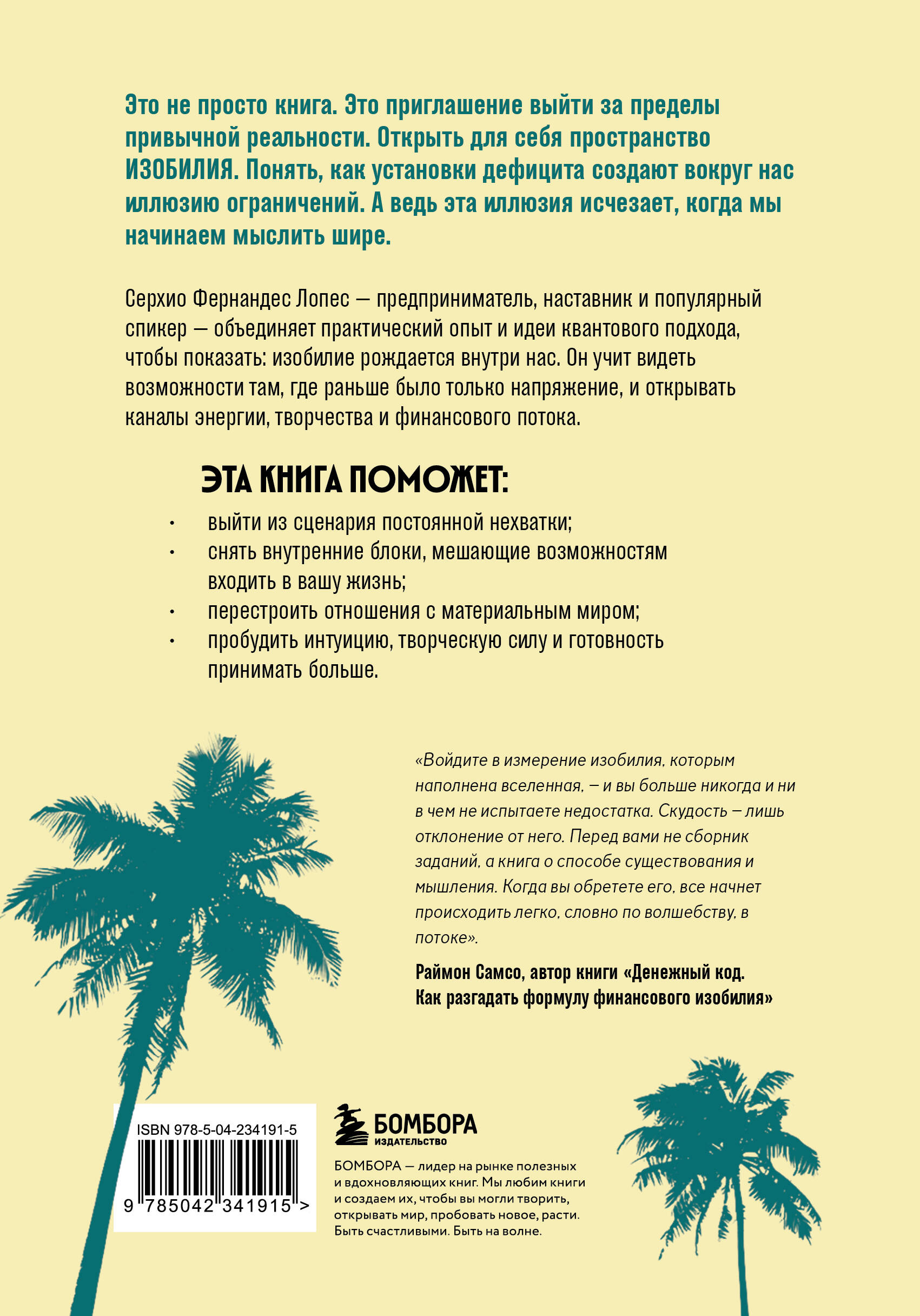 Это не просто книга. Это приглашение выйти за пределы привычной реальности. Открыть для себя пространство ИЗОБИЛИЯ. Понять, как установки дефицита создают вокруг нас иллюзию ограничений. А ведь эта иллюзия исчезает, когда мы начинаем мыслить шире. Серхио Фернандес Лопес - предприниматель, наставник и популярный спикер - объединяет практический опыт и идеи квантового подхода, чтобы показать: изобилие рождается внутри нас. Он учит видеть возможности там, где раньше было только напряжение, и открывать каналы энергии, творчества и финансового потока. Эта книга поможет: • выйти из сценария постоянной нехватки; • снять внутренние блоки, мешающие возможностям входить в вашу жизнь; • перестроить отношения с материальным миром; • пробудить интуицию, творческую силу и готовность принимать больше. «Войдите в измерение изобилия, которым наполнена вселенная, - и вы больше никогда и ни в чем не испытаете недостатка. Изобилие - это естественное состояние. Скудость - лишь отклонение от него. Перед вами не сборник заданий, а книга о способе существования и мышления - или, точнее, о состоянии сознания, состоянии изобилия. Когда вы обретете его, все начнет происходить легко, словно по волшебству, в потоке». - Раймон Самсо, автор книги «Денежный код. Как разгадать формулу финансового изобилия»| Издательство | ООО "Издательство "Эксмо" |