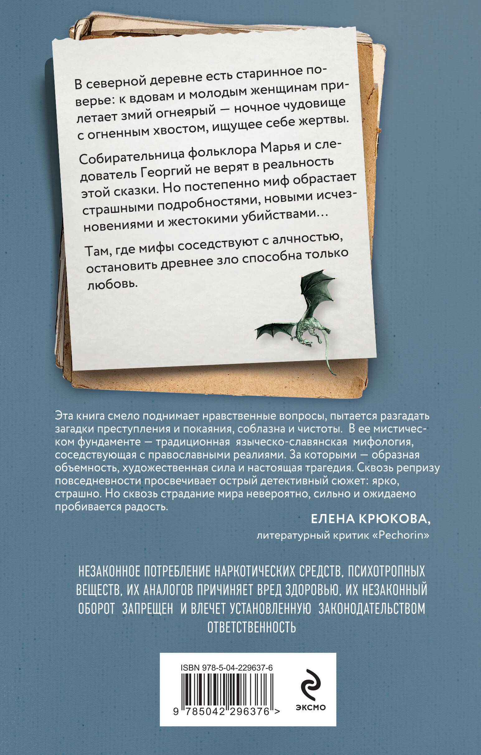 НЕЗАКОННОЕ ПОТРЕБЛЕНИЕ НАРКОТИЧЕСКИХ СРЕДСТВ, ПСИХОТРОПНЫХ ВЕЩЕСТВ, ИХ АНАЛОГОВ ПРИЧИНЯЕТ ВРЕД ЗДОРОВЬЮ, ИХ НЕЗАКОННЫЙ ОБОРОТ ЗАПРЕЩЕН И ВЛЕЧЕТ УСТАНОВЛЕННУЮ ЗАКОНОДАТЕЛЬСТВОМ ОТВЕТСТВЕННОСТЬ. В северной деревне есть старинное поверье: к вдовам и молодым женщинам прилетает змий огнеярый - ночное чудовище с огненным хвостом, ищущее себе жертвы. Собирательница фольклора Марья и следователь Георгий не верят в реальность этой сказки. Но постепенно миф обрастает страшными подробностями, новыми исчезновениями и жестокими убийствами… Там, где мифы соседствуют с алчностью, остановить древнее зло способна только любовь. «Эта книга смело поднимает нравственные вопросы, пытается разгадать загадки преступления и покаяния, соблазна и чистоты. В ее мистическом фундаменте - традиционная язычески-славянская мифология, соседствующая с православными реалиями. За которыми образная объемность, художественная сила и настоящая трагедия. Сквозь репризу повседневности просвечивает острый детективный сюжет: ярко, страшно. Но сквозь страдание мира невероятно, сильно и ожидаемо, пробивается радость». - Елена Крюкова, литературный критик «Pechorin»