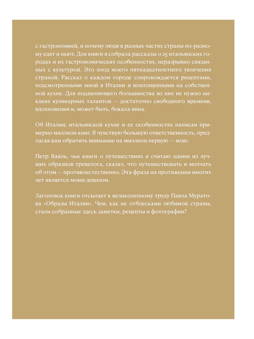 Перед вами книга о многообразии и своеобразии гастрономических традиций Италии. Двадцать пять эссе об итальянских городах и их кулинарных особенностях, дополненных продуманными рецептами, которые легко реализовать на собственной кухне. Показывая Италию сквозь призму региональных кулинарных традиций, автор проводит читателя по всей стране, уделяя внимание не только популярным Риму, Флоренции или Венеции, но и менее известным локациям, и позволяет увидеть Италию глазами путешественника, а не туриста. Благодаря великолепным иллюстрациям книга станет прекрасным подарком тому, кто уже знаком со страной или только мечтает открыть для себя Италию.