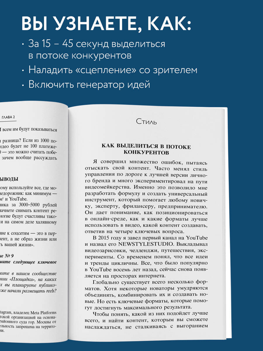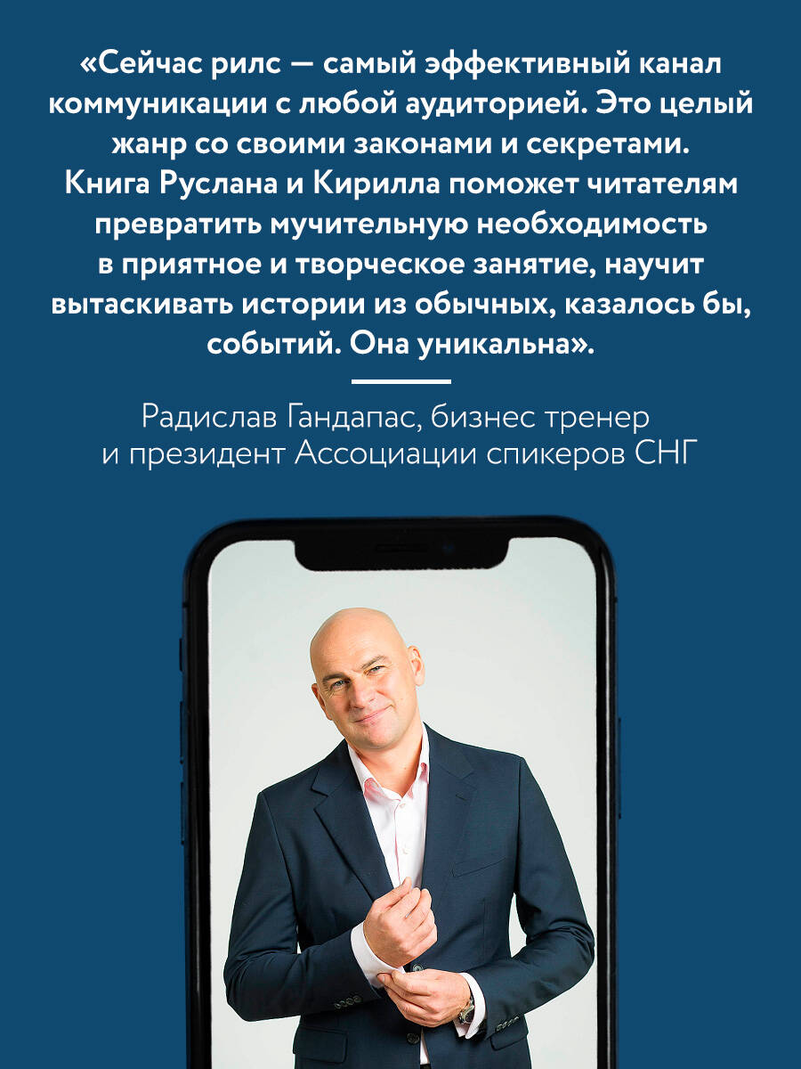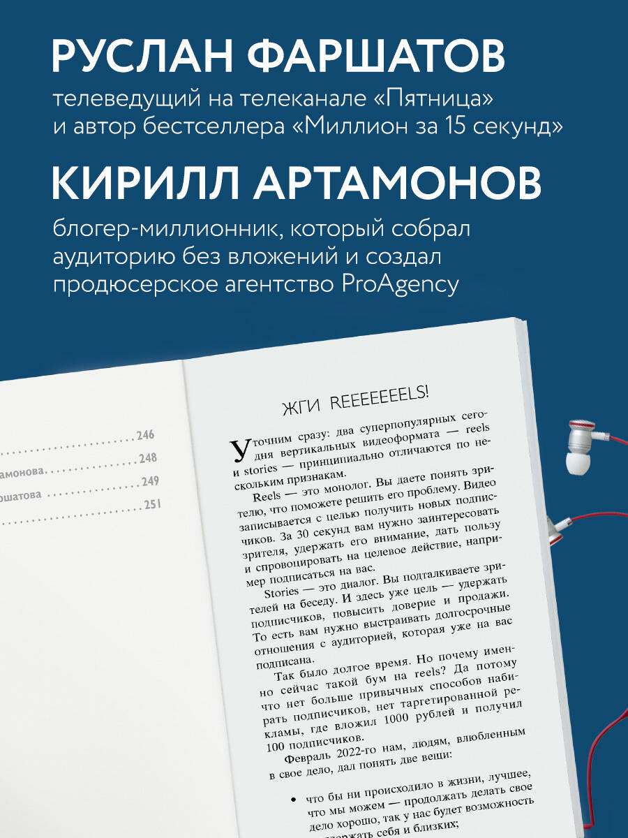 Сегодня рилсы - самый эффективный инструмент для создания аудитории в соцсетях. Хочешь за несколько месяцев собрать 100, 200 тысяч подписчиков? Снимай вертикальные видео! Авторы этой книги, Руслан Фаршатов и Кирилл Артамонов, расскажут, как это делать. Руслан - телеведущий трэвел-шоу на телеканале «Пятница», основатель онлайн-проекта «Медиафитнес», предприниматель. Кирилл всего за 5 месяцев без вложений стал блогером-миллионником и создал продюсерское агентство ProAgency, среди его клиентов: Муз-ТВ, Мегафон и т.д. Оба автора - профессионалы, не один год продвигающие свои курсы в соцсетях и готовые поделиться формулой «идеального вертикального видео». Вы узнаете, как: • за 15-45 секунд выделиться в потоке конкурентов; • наладить «сцепление» со зрителем; • порвать все рекорды по просмотрам и подпискам; • открыть новые горизонты; • включить генератор идей. «Сейчас рилс - самый эффективный канал коммуникации с любой аудиторией. Это целый жанр со своими законами и секретами. Книга Руслана и Кирилла поможет читателям превратить мучительную необходимость в приятное и творческое занятие, научит вытаскивать истории из обычных, казалось бы, событий. Она уникальна». - РАДИСЛАВ ГАНДАПАС, президент Ассоциации спикеров СНГ. №14 в списке TOP-30 Global Gurus