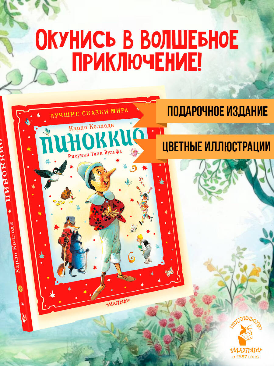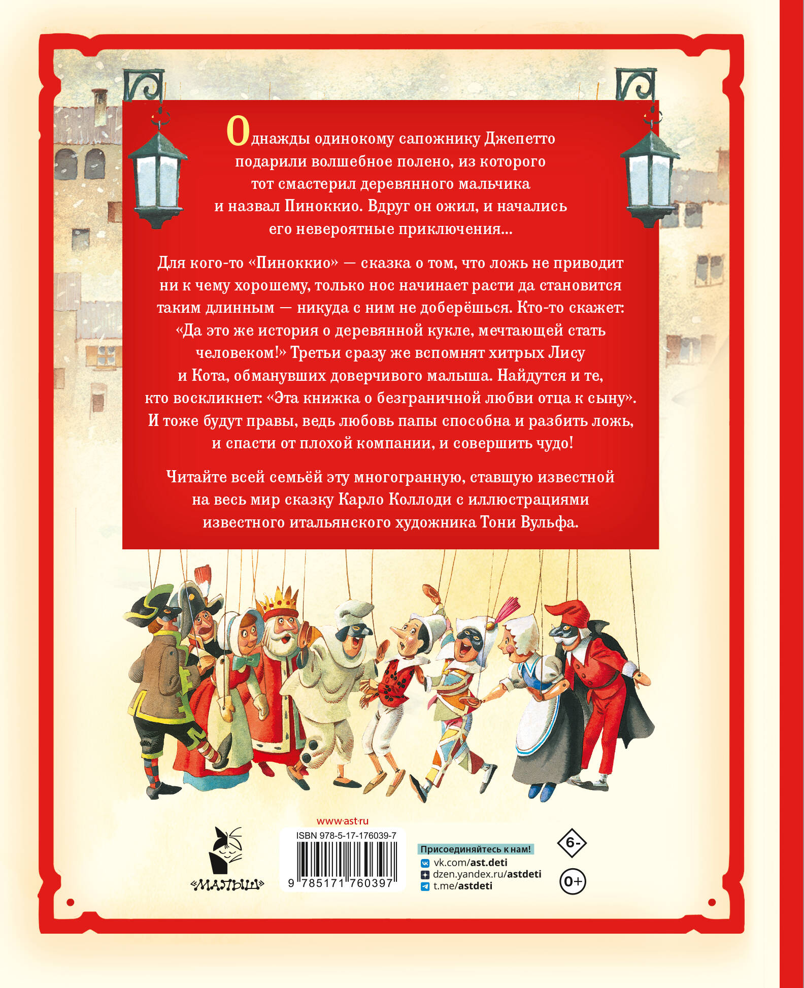 Однажды одинокому сапожнику Джепетто подарили волшебное полено, из которого тот смастерил деревянного мальчика и назвал Пиноккио. Вдруг он ожил, и начались его невероятные приключения… Для кого-то «Пиноккио» - сказка о том, что ложь не приводит ни к чему хорошему, только нос начинает расти да становится таким длинным - никуда с ним не доберёшься. Кто-то скажет: «Да это же история о деревянной кукле, мечтающей стать человеком!» Третьи сразу же вспомнят хитрых Лису и Кота, обманувших доверчивого малыша. Найдутся и те, кто воскликнет: «Эта книжка о безграничной любви отца к сыну». И тоже будут правы, ведь любовь папы способна и разбить ложь, и спасти от плохой компании, и совершить чудо! Читайте всей семьёй эту многогранную, ставшую известной на весь мир сказку Карло Коллоди с иллюстрациями известного итальянского художника Тони Вульфа.