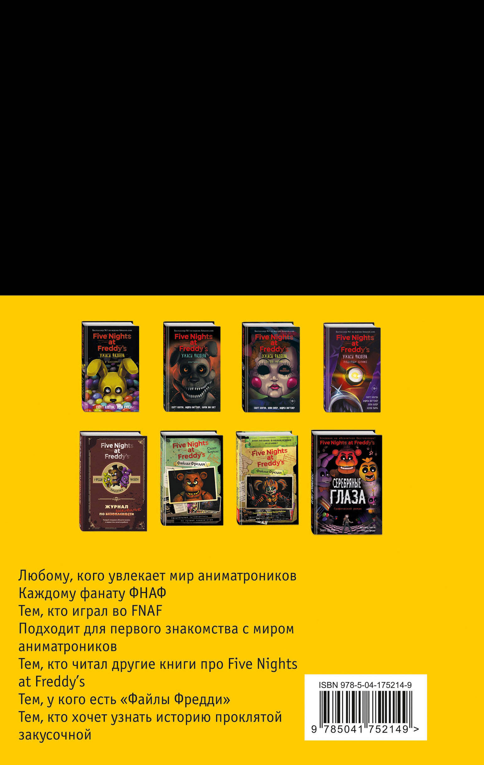 Плакат внутри! Любому, кого увлекает мир аниматроников. Каждому фанату ФНАФ. Тем, кто играл во FNAF. Подходит для первого знакомства с миром аниматроников. Тем, кто читал другие книги про Five Nights at Freddy's. Тем, у кого есть «Файлы Фредди». Тем, кто хочет узнать историю проклятой закусочной.| Издательство | ООО "Издательство "Эксмо" |