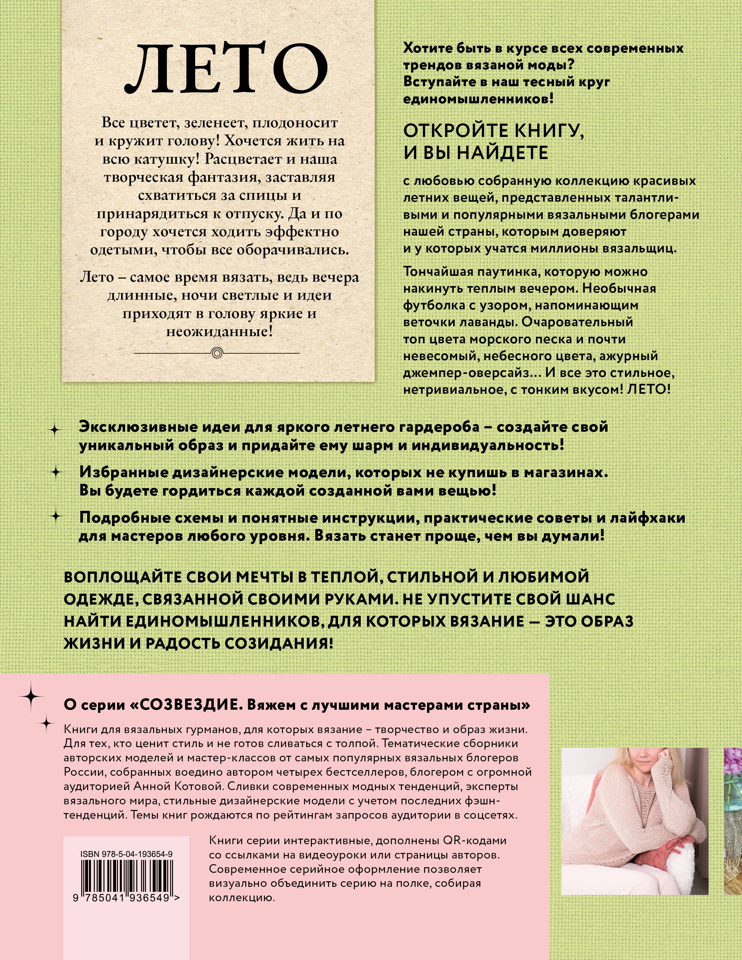 Уникальная книга в уникальной серии! Впервые авторские вязальные проекты от лучших мастеров России тщательно отобраны признанным экспертом, мастером, автором бестселлеров по вязанию Анной Котовой и представлены в одной книге! Самые авторитетные мастера-блогеры, чье имя на слуху российских и не только мастериц-вязальщиц, по чьим мастер-классам обучаются вязать тысячи и тысячи учеников во всем мире, предоставили свои роскошные авторские модели в эту роскошную ЛЕТНЮЮ книгу. Летом, когда все цветет и созревает, хочется ярких красок, свежих идей, и, конечно, длинные теплые вечера так и манят вязать! В этой книге вы найдете красивые и стильные проекты на любой вкус, гарантируем, вам захочется связать их все! И вы, и ваши близкие получат модный, яркий, нетривиальный летний гардероб, в котором так хорошо пройтись по берегу моря, цветущему саду или солнечным улочкам! Вы и ваша семья достойны самого лучшего. Готовимся к ЛЕТУ вместе со звездами российского вязания! Авторский коллектив: КСЕНИЯ АСТАШКИНА ТАТЬЯНА ДОНЧЕНКО ТАТЬЯНА КУРОЧКИНА ЮЛИЯ ЛИСИНА ВЕРА ОДИНЦОВА ИРИНА ПОЛЫНСКАЯ МАРИЯ ЦИНБАЛ ЕЛЕНА ЧЕТВЕРГОВА О серии «СОЗВЕЗДИЕ. Вяжем с лучшими мастерами страны»: Книги для вязальных гурманов, для которых вязание - творчество и образ жизни. Для тех, кто ценит стиль и не готов сливаться с толпой. Тематические сборники авторских моделей и мастер-классов от самых популярных вязальных блогеров России, собранных воедино автором четырех бестселлеров, блогером с огромной аудиторией и множеством учеников Анной Котовой. Сливки современных модных тенденций, эксперты вязального мира, стильные дизайнерские модели с учетом последних фэшн-тенденций. Темы книг рождаются по рейтингам запросов аудитории в соцсетях. Книги серии интерактивные, дополнены QR-кодами со ссылками на видеоуроки или страницы авторов, обеспечивая обратную связь с читателем. Современное серийное оформление с возможностью визуально объединить серию на полке, собирая коллекцию.| Издательство | ООО "Издательство "Эксмо" |