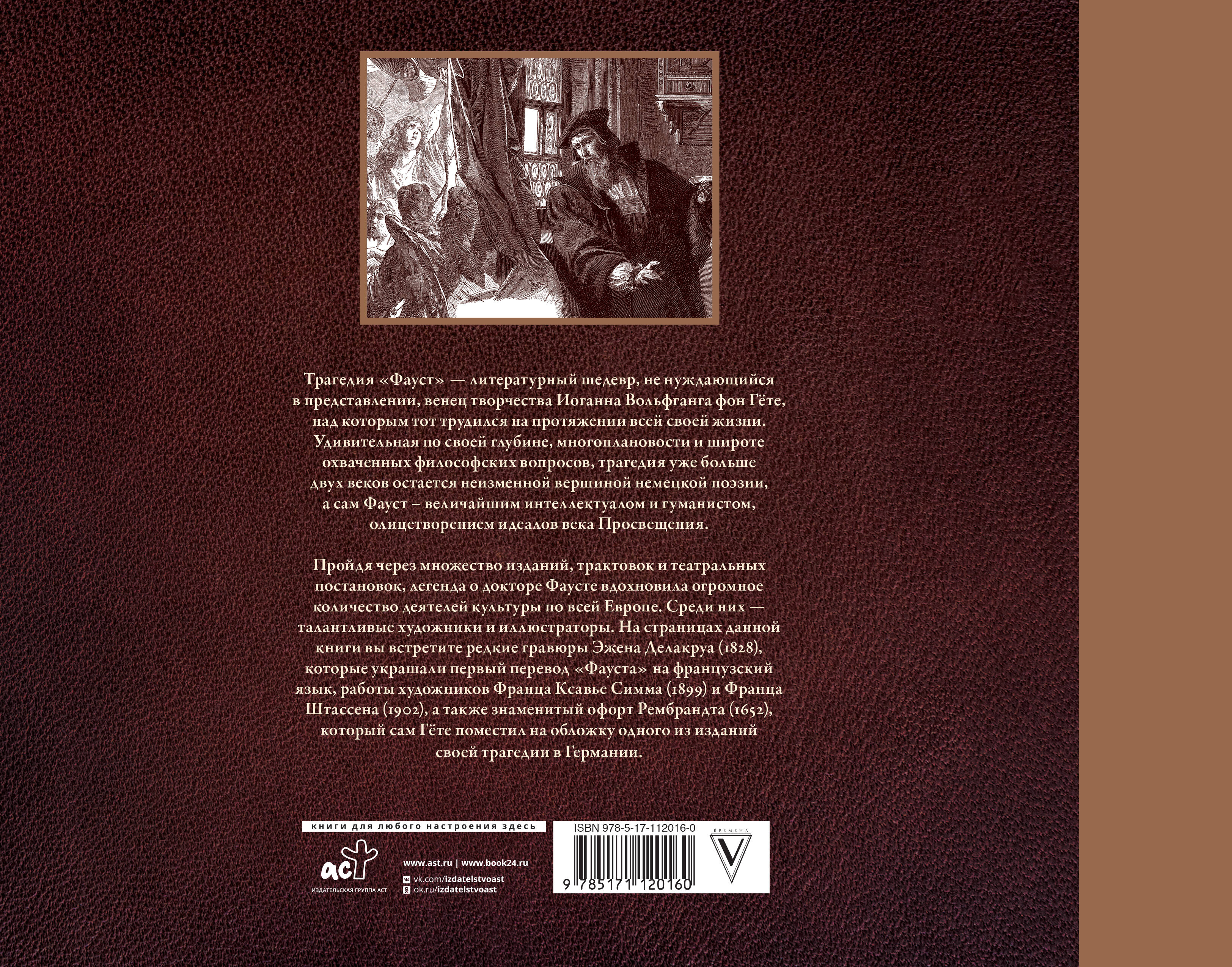"Фауст" - литературный шедевр, не нуждающийся в представлении, венец творчества Иоганна Вольфганга фон Гёте, над которым тот трудился на протяжении всей своей жизни. Удивительная по своей глубине, многоплановости и широте охваченных философских вопросов, трагедия уже больше двух веков остается неизменной вершиной немецкой поэзии, а сам Фауст - величайшим интеллектуалом и гуманистом, олицетворением идеалов века Просвещения. Пройдя через множество изданий, трактовок и театральных постановок, легенда о докторе Фаусте вдохновила огромное количество деятелей культуры по всей Европе. Среди них - талантливые художники и иллюстраторы. На страницах данной книги вы встретите редкие гравюры Эжена Делакруа (1828), которые украшали первый перевод "Фауста" на французский язык, работы художников Франца Ксавье Симма (1899) и Франца Штассена (1902), а также знаменитый офорт Рембрандта (1652), который сам Гёте поместил на обложку одного из изданий своей трагедии в Германии.| Издательство | Издательство "АСТ" |