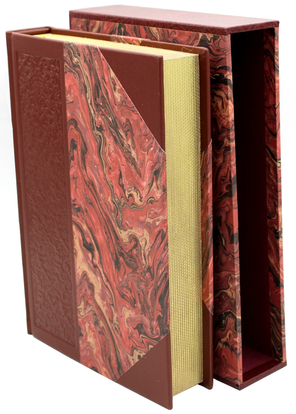 Составной переплёт ручной работы из натуральной кожи. Форзац из дизайнерской бумаги. 4 бинта на корешке, ручной обработки. Обрез блока торшонированное золото. Тиснение блинтовое, золотой и цветной фольгой. Каптал из натуральной кожи. Ляссе.