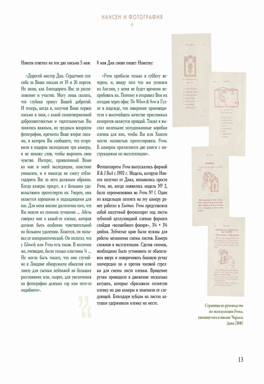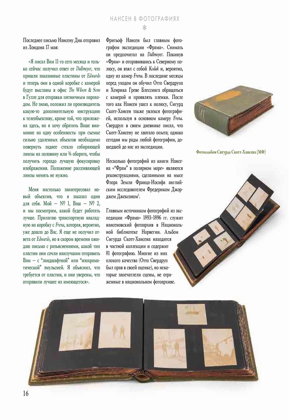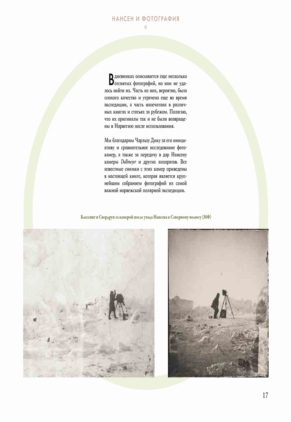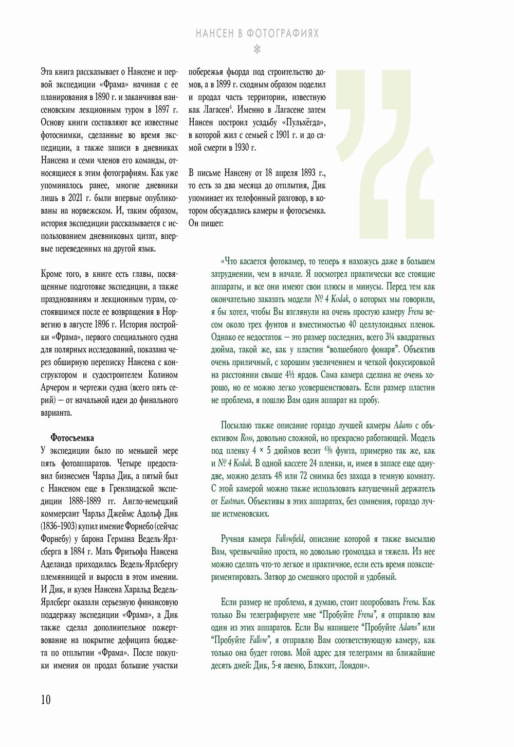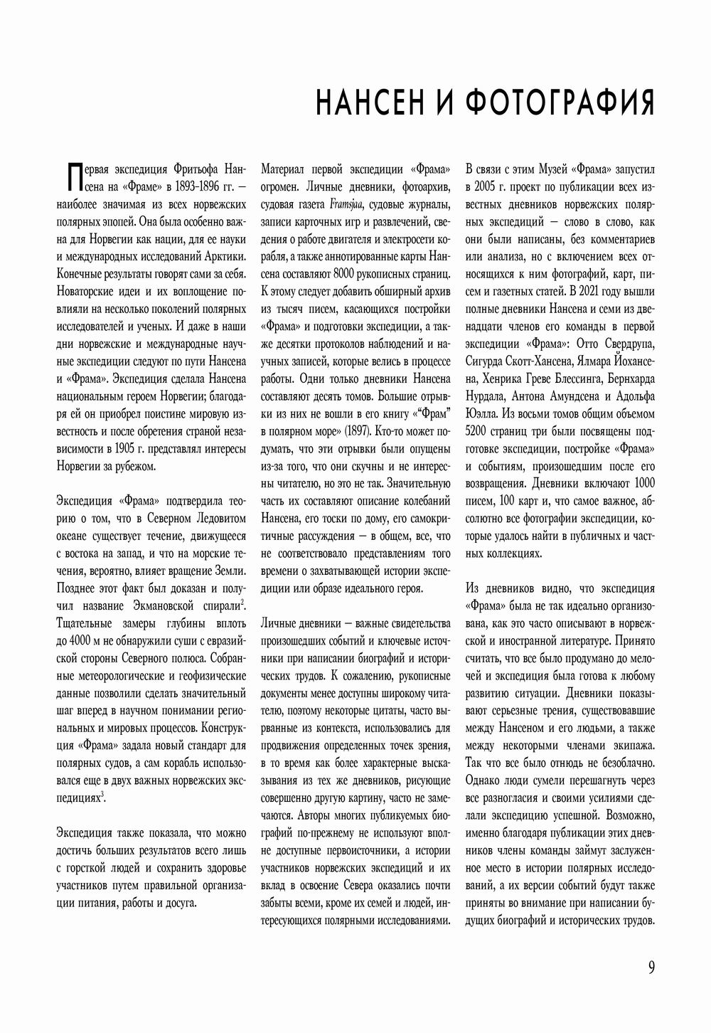 Книга «Нансен в фотографиях» посвящена первому путешествию «Фрама» в 1893-1896 годах и охватывает период подготовки к эпической экспедиции с 1890 года и до завершения лекционного турне Фритьофа Нансена в 1897 году. В основе книги - все известные фотоснимки, сделанные во время экспедиции, а также выдержки из дневников Нансена и семи членов его команды, описывающие обстоятельства, при которых эти фотографии были сняты. Таким образом, история предстает перед читателем в виде дневниковых записей и газетных репортажей. Процесс постройки «Фрама» - первого судна, спроектированного специально для полярных исследований, представлен через обширную переписку Нансена с судостроителем Колином Арчером и серию чертежей - от первоначальной идеи до финального воплощения. Предназначена широкому кругу читателей, интересующихся историей исследования высоких широт.| Издательство | Paulsen/Паулсен |
