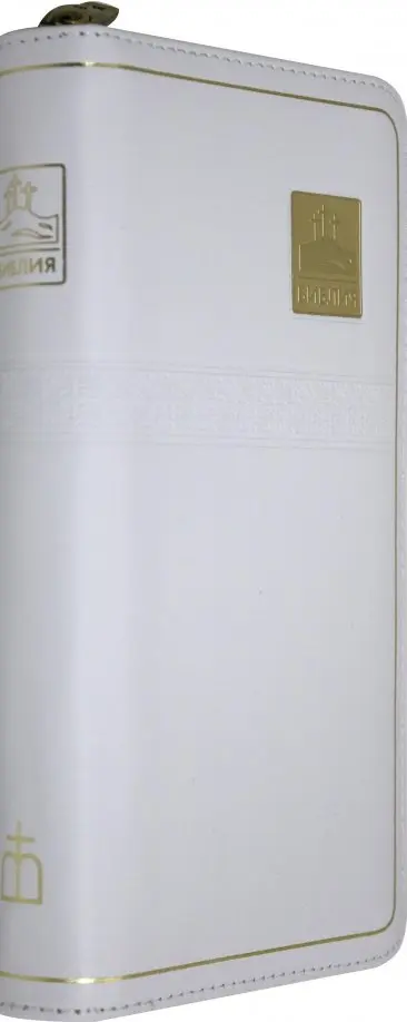 Удлиненный компактный формат 83х175 мм, кожаный переплет на молнии, "золотой" обрез, закладка, индексы для поиска библейских книг.