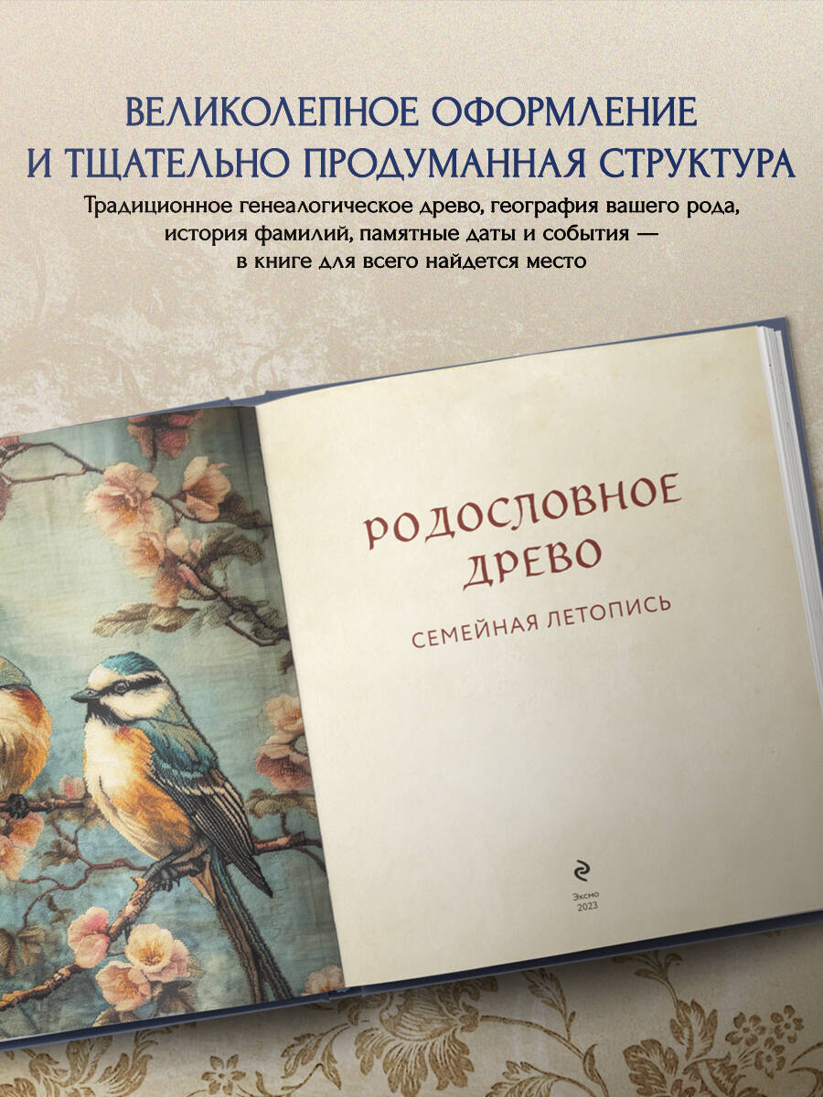 Уникальная родословная книга, которая не только поможет восстановить и бережно сохранить историю вашей семьи, но и создаст полный портрет ее нынешнего поколения, живущего в настоящем! Традиционное генеалогическое древо, география вашего рода, история фамилий, памятные даты и события - для всего найдется место на ее красивых страницах. А еще свой след оставят ваши родные и близкие, по крупицам восстанавливая и фиксируя каждую черточку, присущую вашей семье! Фамильные рецепты и поговорки, портреты любимых питомцев, самые яркие путешествия, совместные праздники - обо всем этом узнают ваши внуки и правнуки, листая эту роскошную книгу. Гаджеты устареют, а память о вас останется! Летопись вашего рода будет продолжаться. А это значит, уже сейчас стоит позаботится о ее красоте и сохранности на долгие годы. В этой книге будет жить именно ваша история!