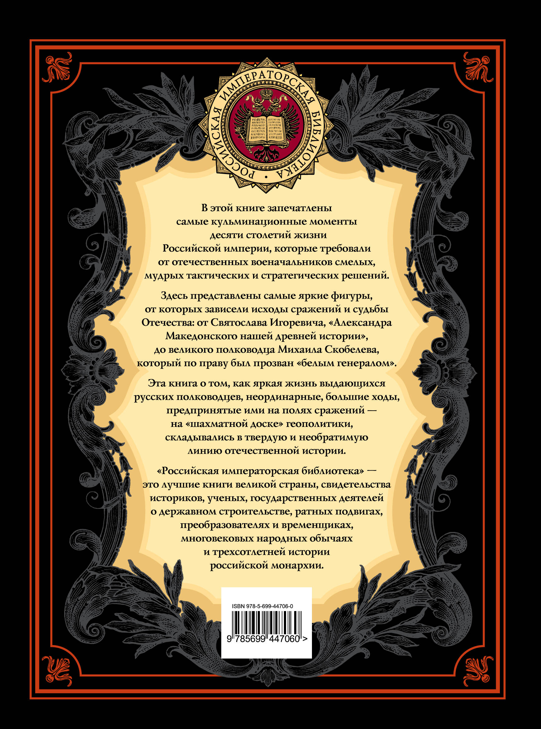 Российское государство создавалось в постоянной борьбе с внешними врагами, которые приходили с востока и запада, севера и юга. Отечественным правителям приходилось быть не только деятельными администраторами, ловкими дипломатами, но и военачальниками, лично возглавлявшими многочисленные военные походы и сражения. Со временем полководческое искусство превратилось в особый род почетной деятельности, ибо отличиться на военном поприще стремились представители многих знатных фамилий. Мы представляем современному читателю увлекательную военную историю России в лицах тех, кто ее вершил. В биографиях даже самых знаменитых полководцев читатель откроет многие, дотоле не известные факты жизни и военных свершений, а исторически достоверный иллюстративный материал позволит зримо представить обстоятельства, в которых действовали герои Российской империи. Серия «Российская императорская библиотека» - это грандиозное собрание выдающихся образцов отечественной мысли и словесности. Издания, вошедшие в серию, представляют собой лучшее в великом духовном наследии нашей страны. Это труды, созданные знаменитыми историками, учеными, великими государственными деятелями и посвященные тысячелетней истории России, ее культуре и искусству, военной славе, многовековым народным обычаям и деяниям выдающихся представителей нашего Отечества. Прекрасная возможность составить свою домашнюю библиотеку из великих трудов о великой стране. Каждая книга серии прекрасно проиллюстрирована многочисленными цветными и черно-белыми иллюстрациями, которые дают возможность в полном объеме увидеть то, что составляет сокровищницу культурного наследия нашей страны! Каждая книга серии станет великолепным подарком: - для тех, кто собирает домашнюю библиотеку классических трудов; - для тех, кто интересуется историей России, выдающимися личностями; - для школьников и студентов.| Издательство | ООО "Издательство "Эксмо" |