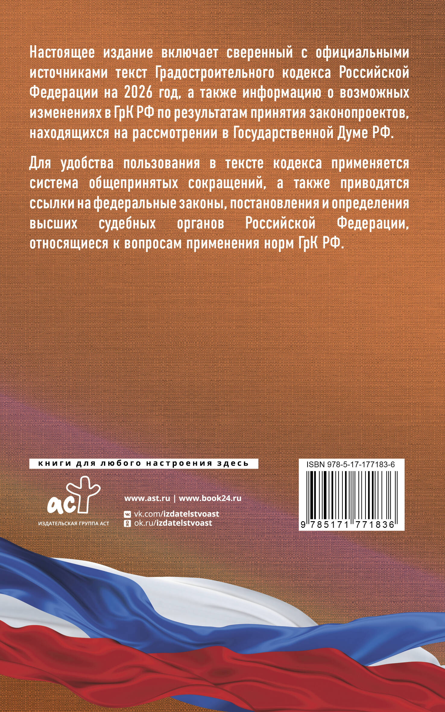Данное издание Градостроительного кодекса РФ сверено с официальным источником и приводится по состоянию на 2026 год. Кодекс учитывает все изменения, опубликованные в официальных источниках на момент подписания издания в печать. В издании представлена информация о возможных изменениях в ГрК РФ по результатам принятия законопроектов, находящихся на рассмотрении в Государственной Думе РФ. Для удобства пользования в тексте кодекса применяется система общепринятых сокращений, а также приводятся ссылки на федеральные законы, постановления Правительства Российской Федерации, постановления и определения высших судебных органов Российской Федерации, относящиеся к вопросам применения норм ГрК РФ.| Издательство | Издательство "АСТ" |