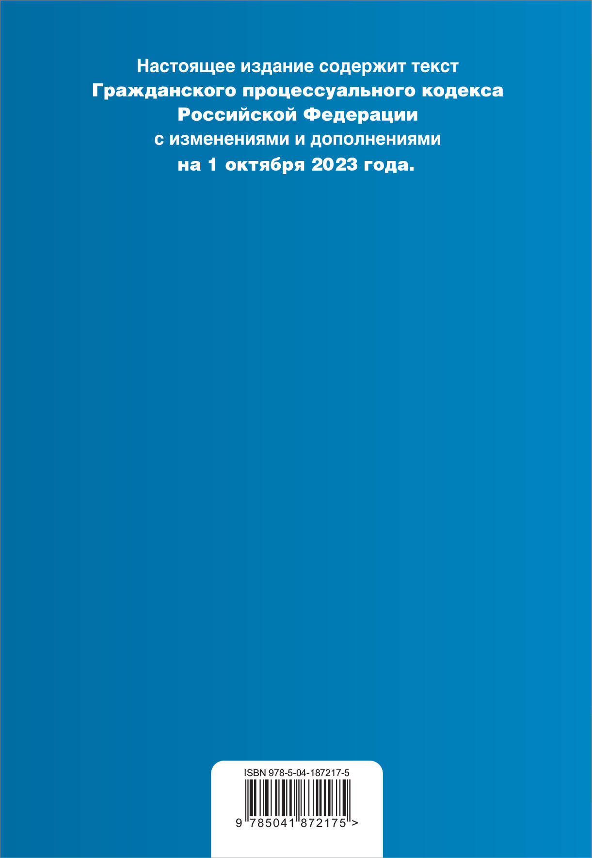 Настоящее издание содержит текст Гражданского процессуального кодекса Российской Федерации с изменениями и дополнениями на 1 октября 2023 года с удобной навигацией и таблицей изменений. Если есть изменения, вступающие в силу позднее, то вместе с редакцией нормы, действующей на эту дату, приводится норма в новой редакции и указывается дата, с которой она вступает в силу.
