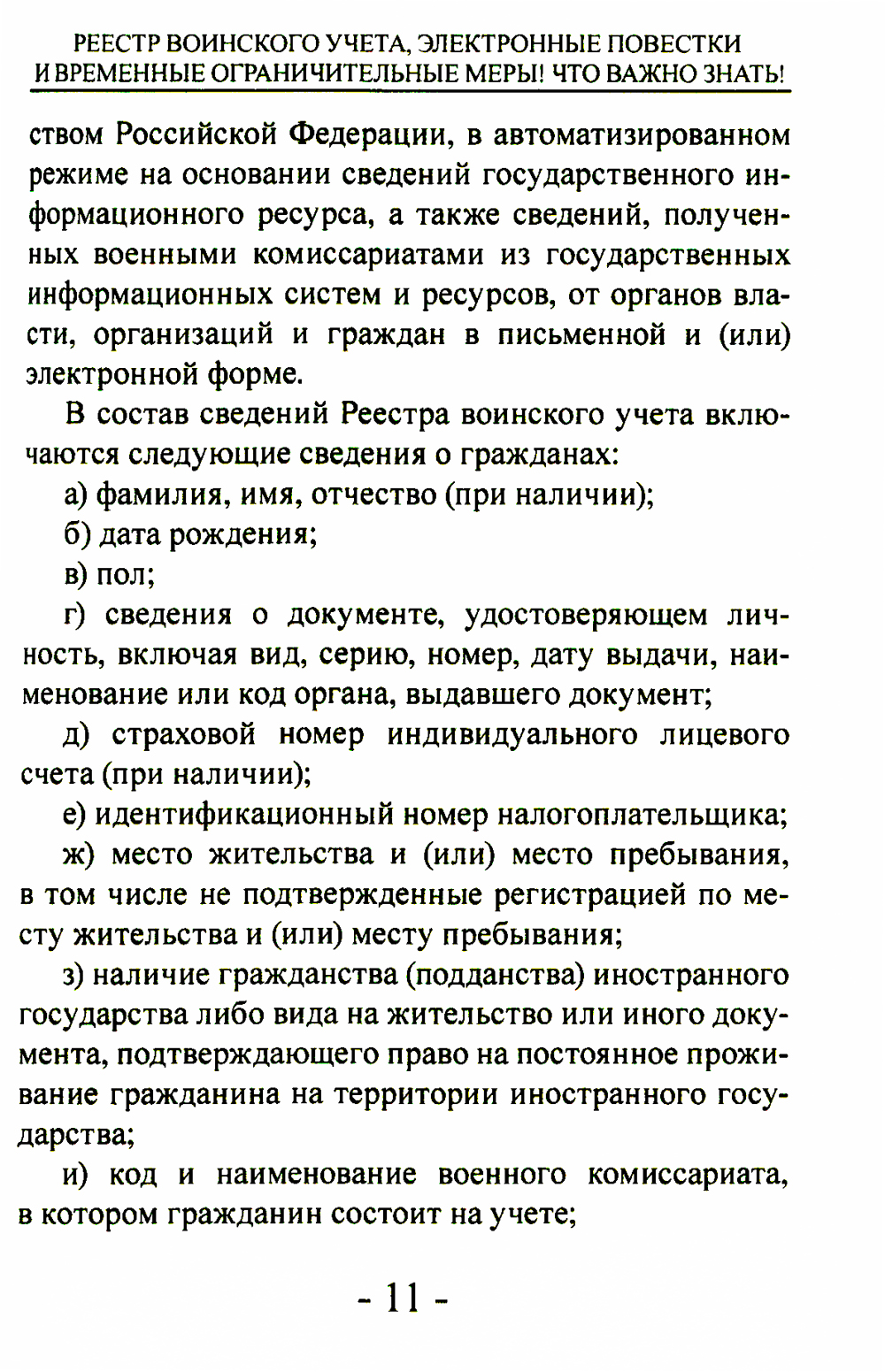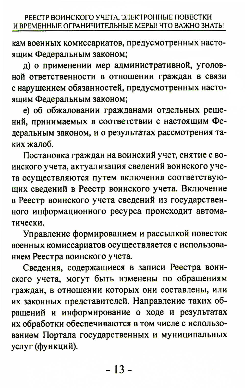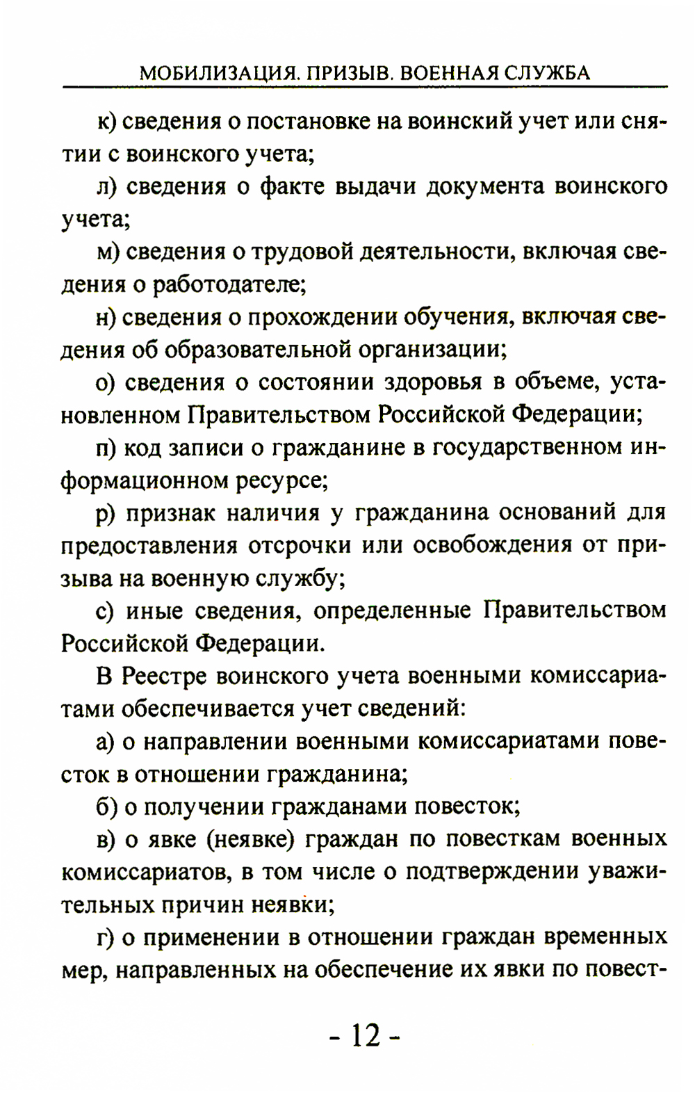 Конституция Российской Федерации (Статья 59) гласит, что защита Отечества является долгом и обязанностью гражданина Российской Федерации. Гражданин Российской Федерации несет военную службу в соответствии с Федеральным законом «О воинской обязанности и военной службе» Приведен и исследован новый закон, который уже успели прозвать «законом об электронных повестках», который принят Госдумой, одобрен Советом Федерации и подписан Президентом РФ. Реестр воинского учета, электронные повестки и временные ограничительные меры. Что важно знать! Настоящее издание рекомендовано для оказания юридической помощи мобилизованным, призывникам, военнослужащим, а так же кадровым сотрудникам, ответственным за воинский учет в организациях и на предприятиях. Миронов Иван Борисович - адвокат, Председатель Московской кол-пегий адвокатов «Миронов, Кудрявцев и партнеры». Федорова Ирина Борисовна - адвокат, руководитель практики в МКА «Миронов, Кудрявцев и партнеры» по защите прав военнослужащих.| Издательство | Книжный мир |