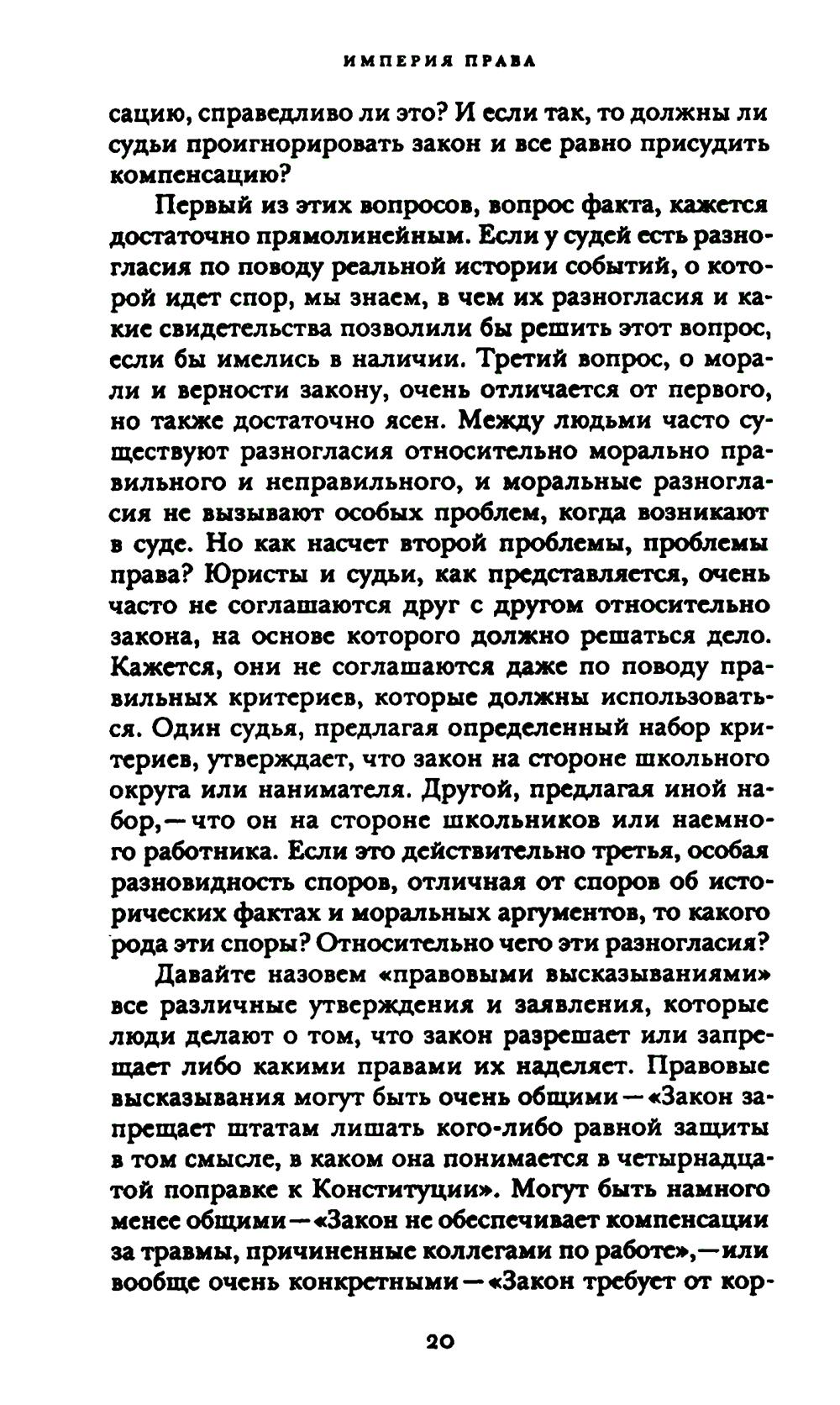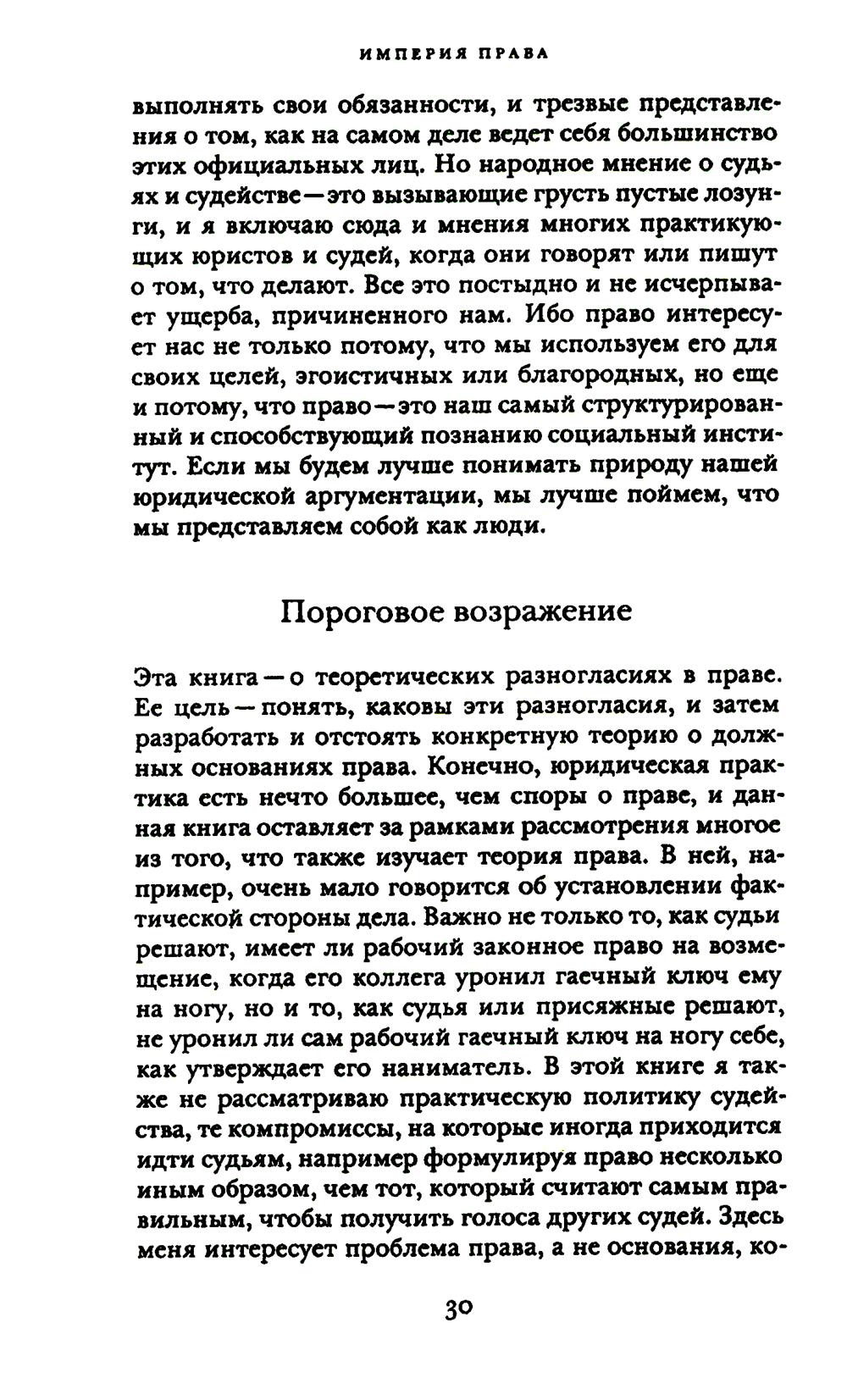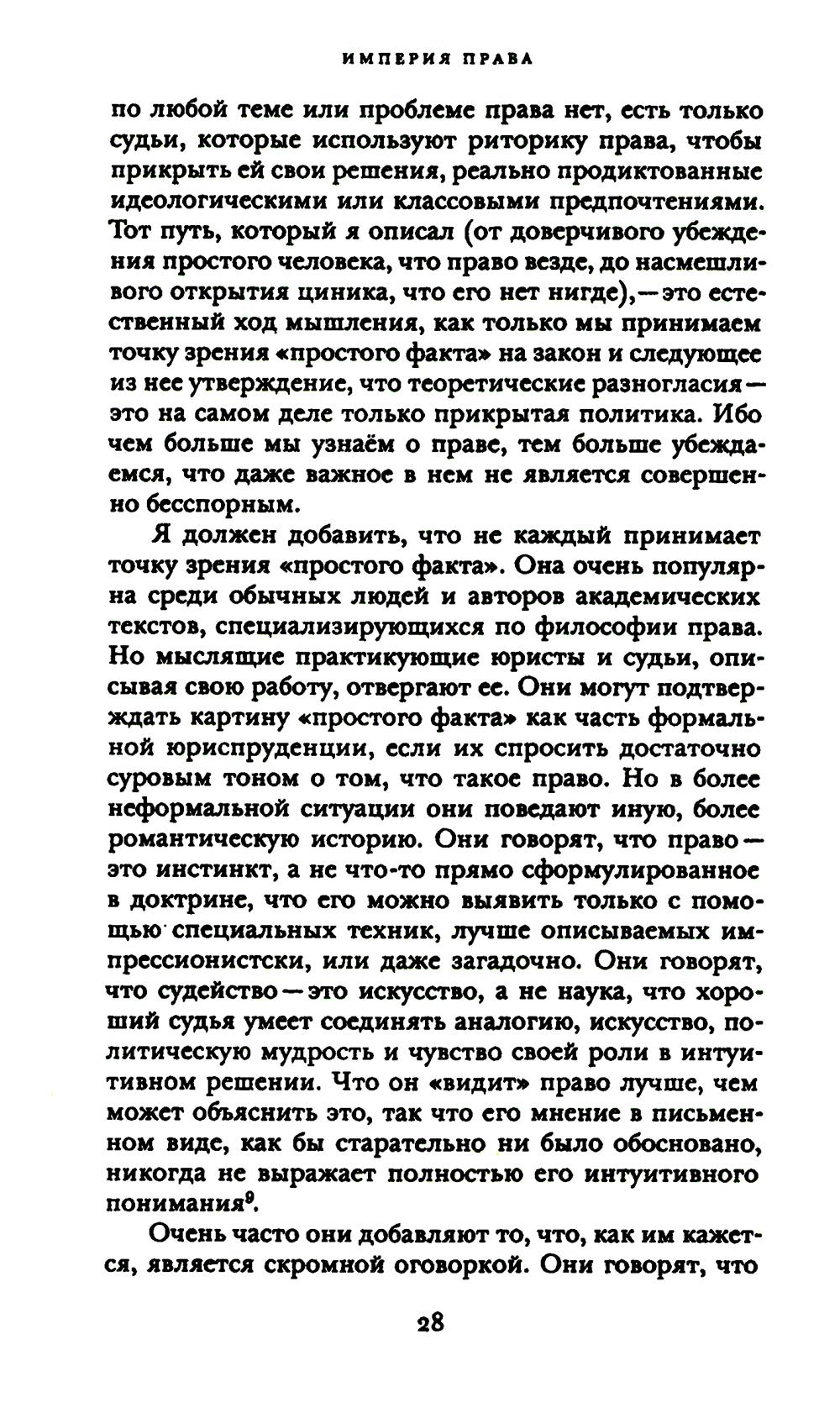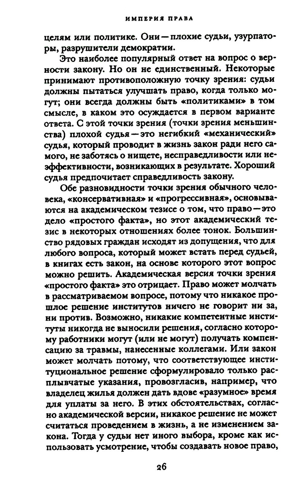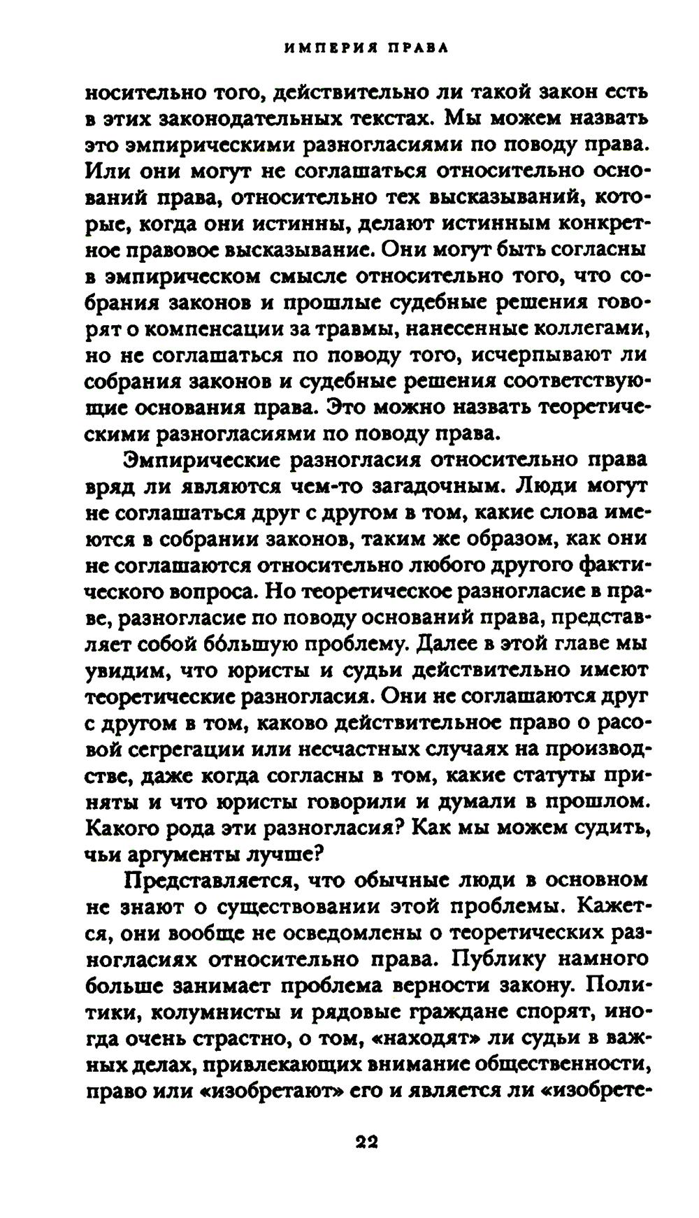 С присущей ему проницательностью и ясностью стиля Рональд Дворкин написал мастерское объяснение работы англо-американской правовой системы и принципов, на которых она основана. Он утверждает, что главная задача права состоит в обеспечении того, чтобы политическое сообщество действовало последовательным и принципиальным образом по отношению ко всем его членам. В свете этой точки зрения он анализирует дела, подлежащие рассмотрению по нормам общего права, дела, возникающие в рамках статутного права, и значимые дела, связанные с положениями Конституции, решения по которым принимал Верховный суд США. Дворкин систематически демонстрирует, что его концепция политической и правовой целостности является ключом к англо-американской правовой теории и практике. «Империя права» - это полномасштабное изложение его теории права, которое будет изучаться и обсуждаться - учеными и теоретиками, юристами и судьями, студентами и политическими активистами - в течение многих последующих лет.| Издательство | Изд. Института Гайдара |