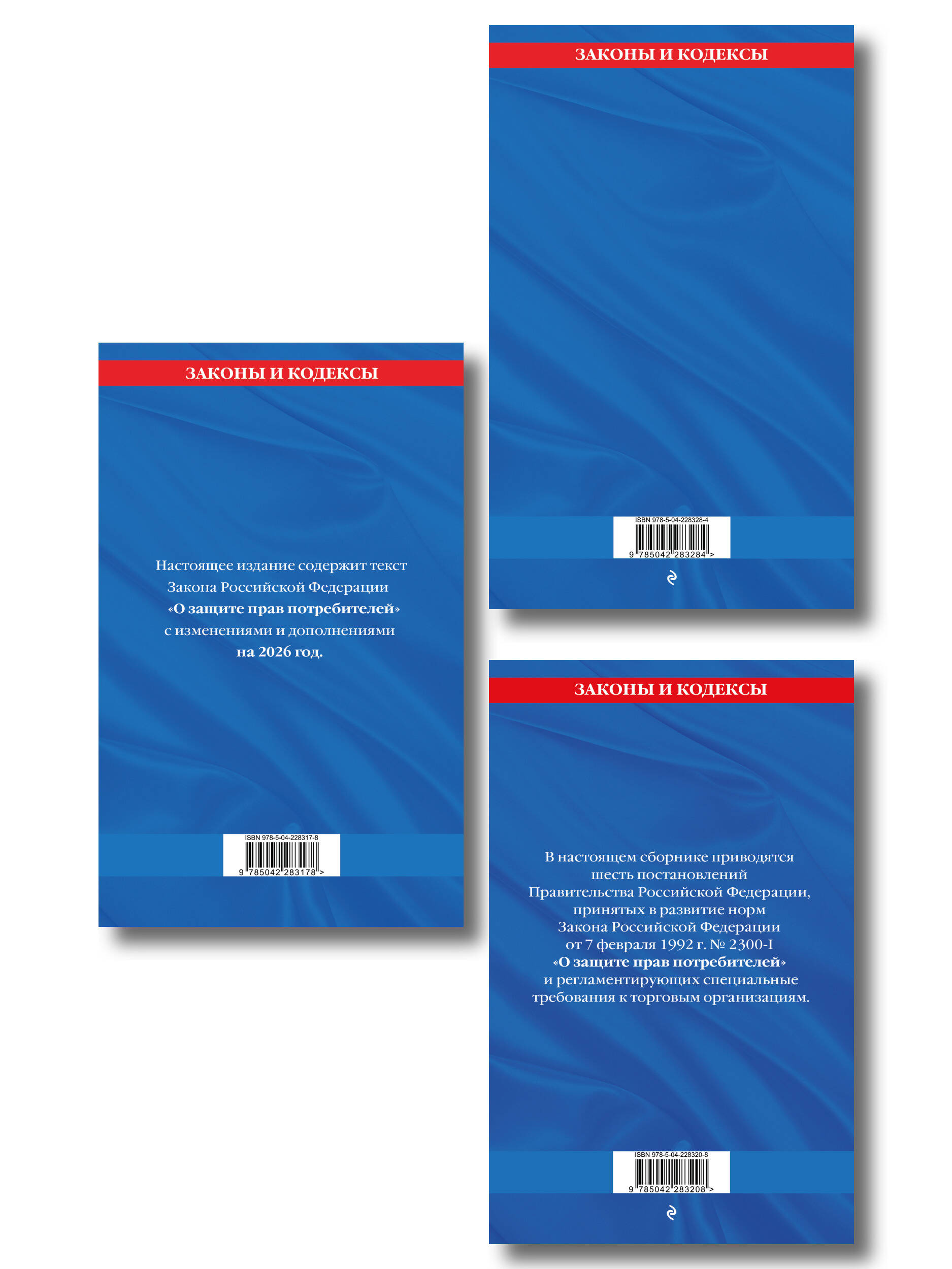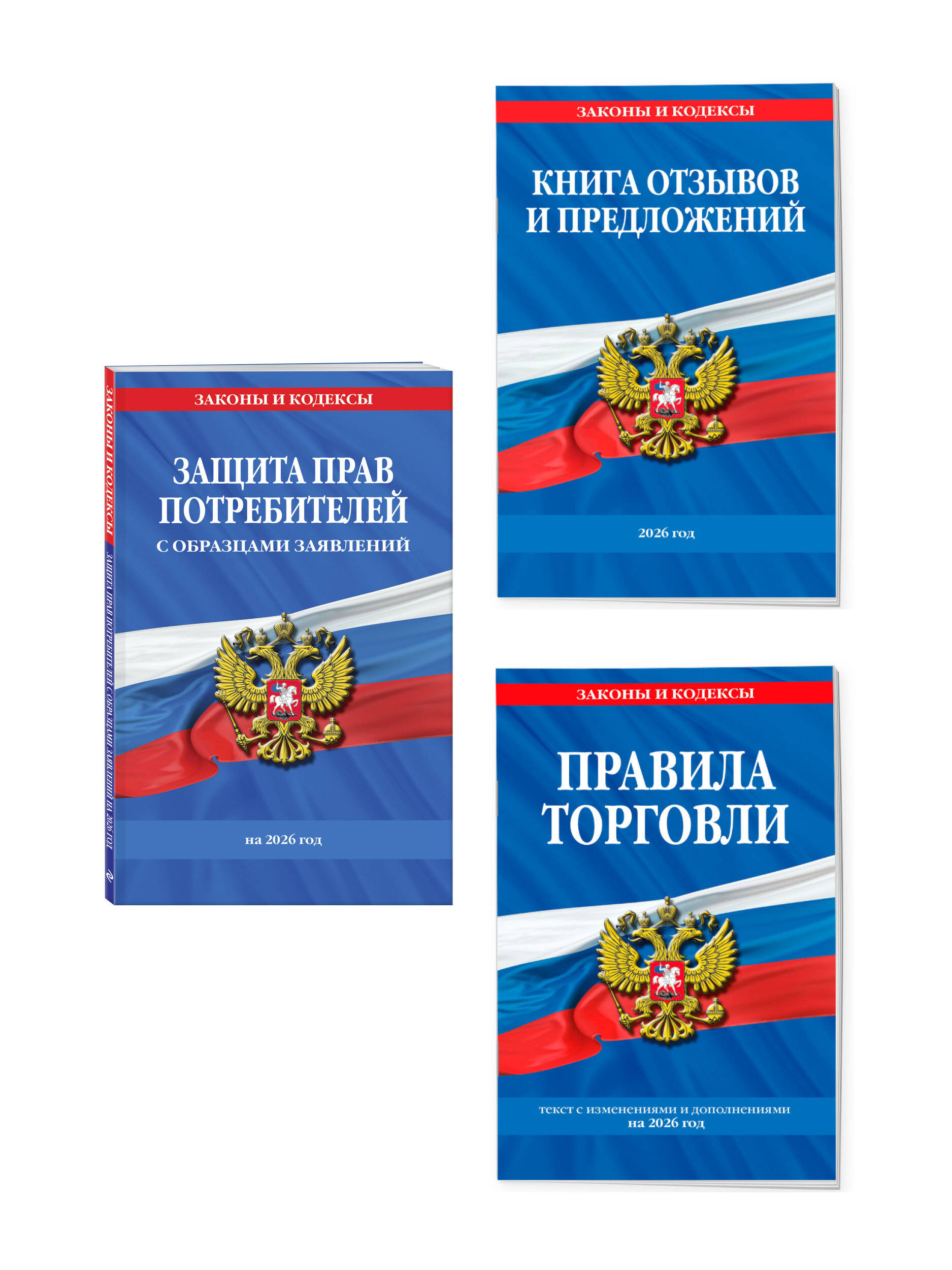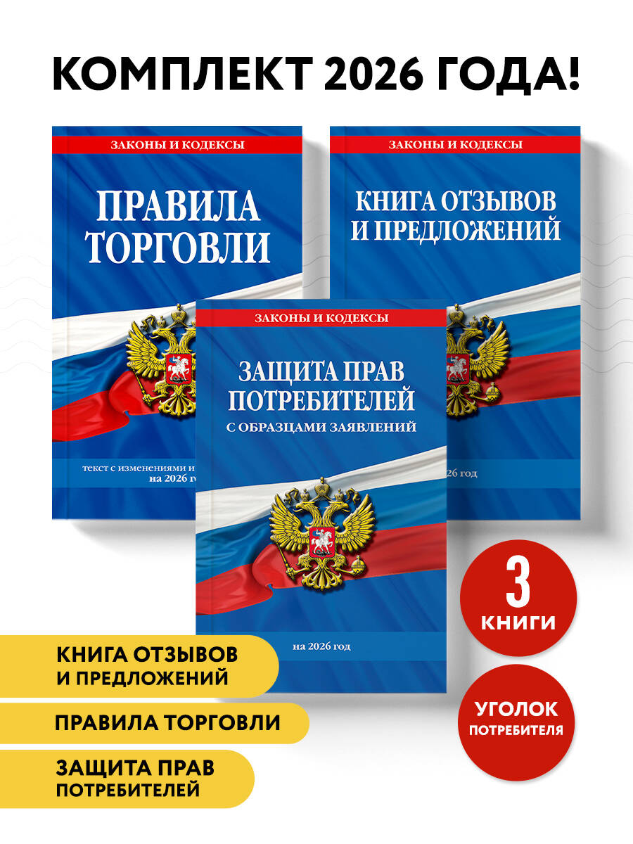 В комплект входят: "Защита прав потребителей с образцами заявлений на 2026 г.", "Книга отзывов и предложений 2026 год", "Правила торговли: текст с изм. и доп. на 2026 год". "Защита прав потребителей с образцами заявлений на 2026 г." Настоящее издание содержит текст Закона Российской Федерации "О защите прав потребителей" и учитывает все имеющиеся изменения и дополнения. В книгу включены примерные (типовые) формы исковых заявлений (о расторжении договоров, взыскании денежных средств, возмещении убытков, неустойки, морального вреда и др.) и претензий, которые помогут потребителям правильно составить документы при обращении в компетентные органы для защиты их интересов при приобретении товаров (работ, услуг) ненадлежащего качества и небезопасных для жизни и здоровья. Сборник содержит список адресов и телефонов организаций по защите прав потребителей. Издание предназначено для широкого круга читателей. "Книга отзывов и предложений 2026 год" Книга отзывов и предложений - необходимый инструмент обратной связи с клиентом на предприятиях розничной торговли и сферы услуг, предназначена для быстрого реагирования на нарушения в обслуживании. Представленная вашему вниманию книга соответствует всем нормам законодательства: пронумерована и скреплена, содержит необходимые для написания отзывов бланки. Такая книга, исписанная комплиментами посетителей, будет отличной рекламой для заведения. "Правила торговли: текст с изм. и доп. на 2026 год" В настоящем сборнике приводятся Постановление Правительства Российской Федерации от 31 декабря 2020 г. № 2463 "Об утверждении правил продажи товаров по договору розничной купли-продажи" и ряд иных актов, регулирующих отношения купли-продажи.| Издательство | ООО "Издательство "Эксмо" |