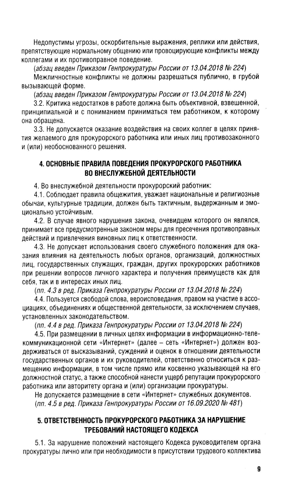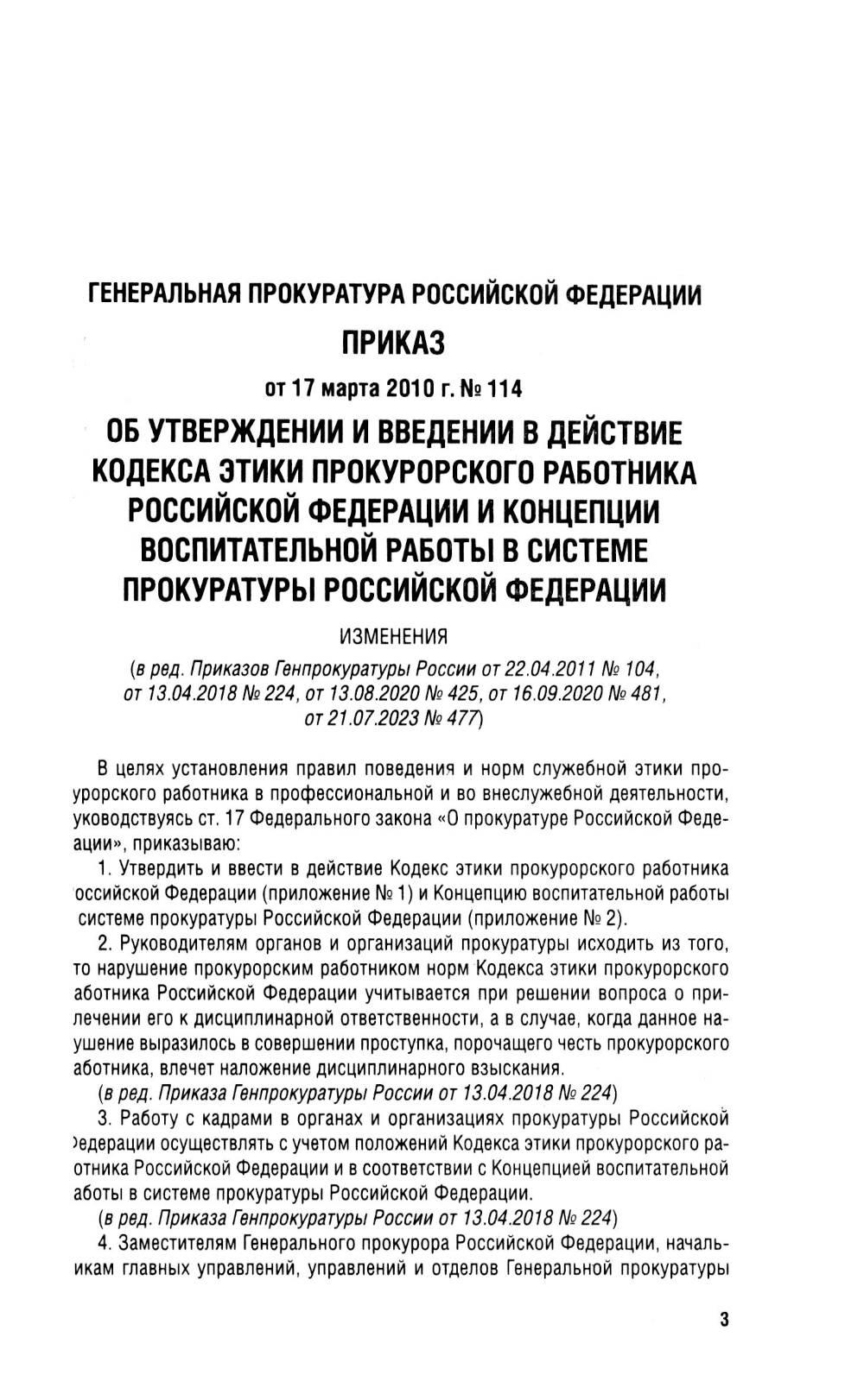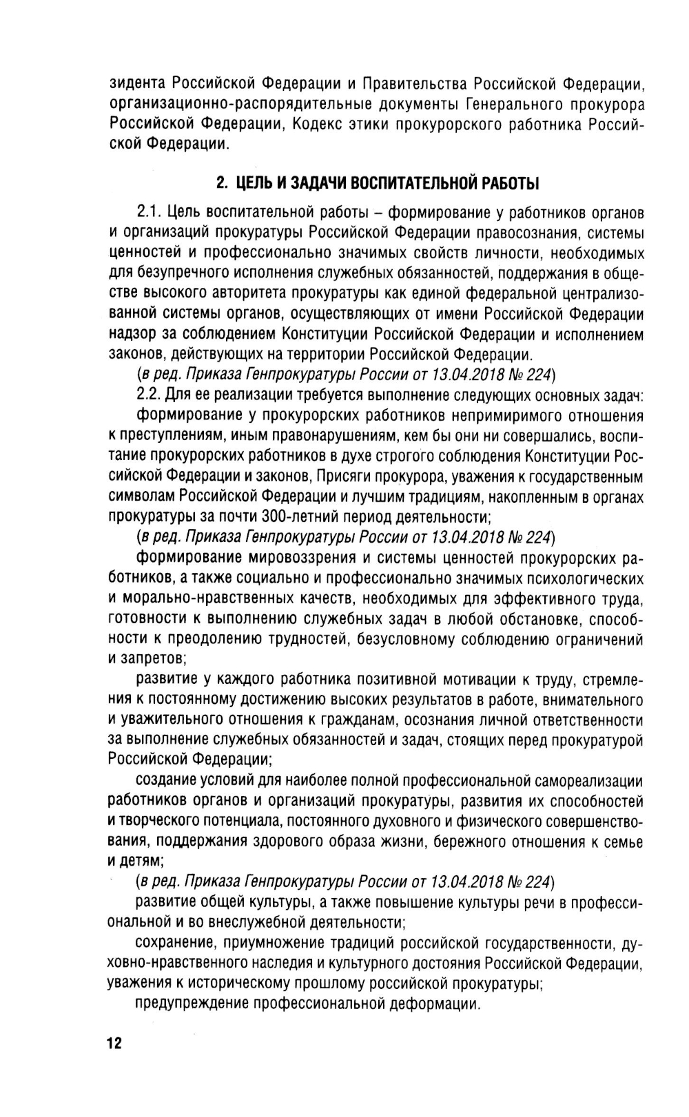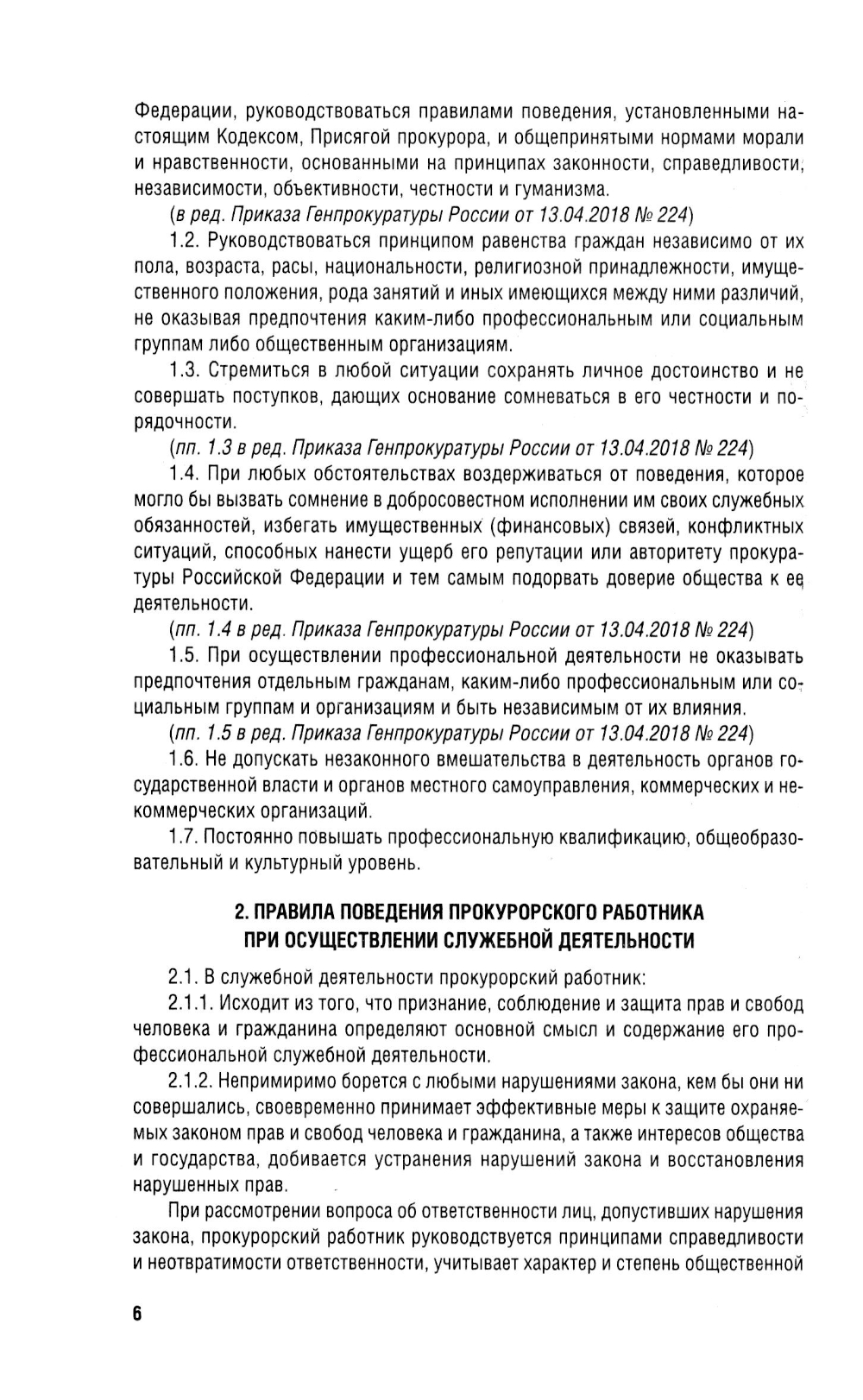В издание вошли Кодекс этики прокурорского работника Российской Федерации, Концепция воспитательной работы в системе прокуратуры Российской Федерации, а также Приказ Генпрокуратуры России, которым они утверждены. Тексты документов подготовлены с использованием профессиональной юридической системы «Кодекс», сверены с официальным источником. В настоящем издании нормативные документы приводятся с учетом изменений, принятых нормативными актами, опубликованными на дату подписания издания в печать.| Издательство | Проспект |