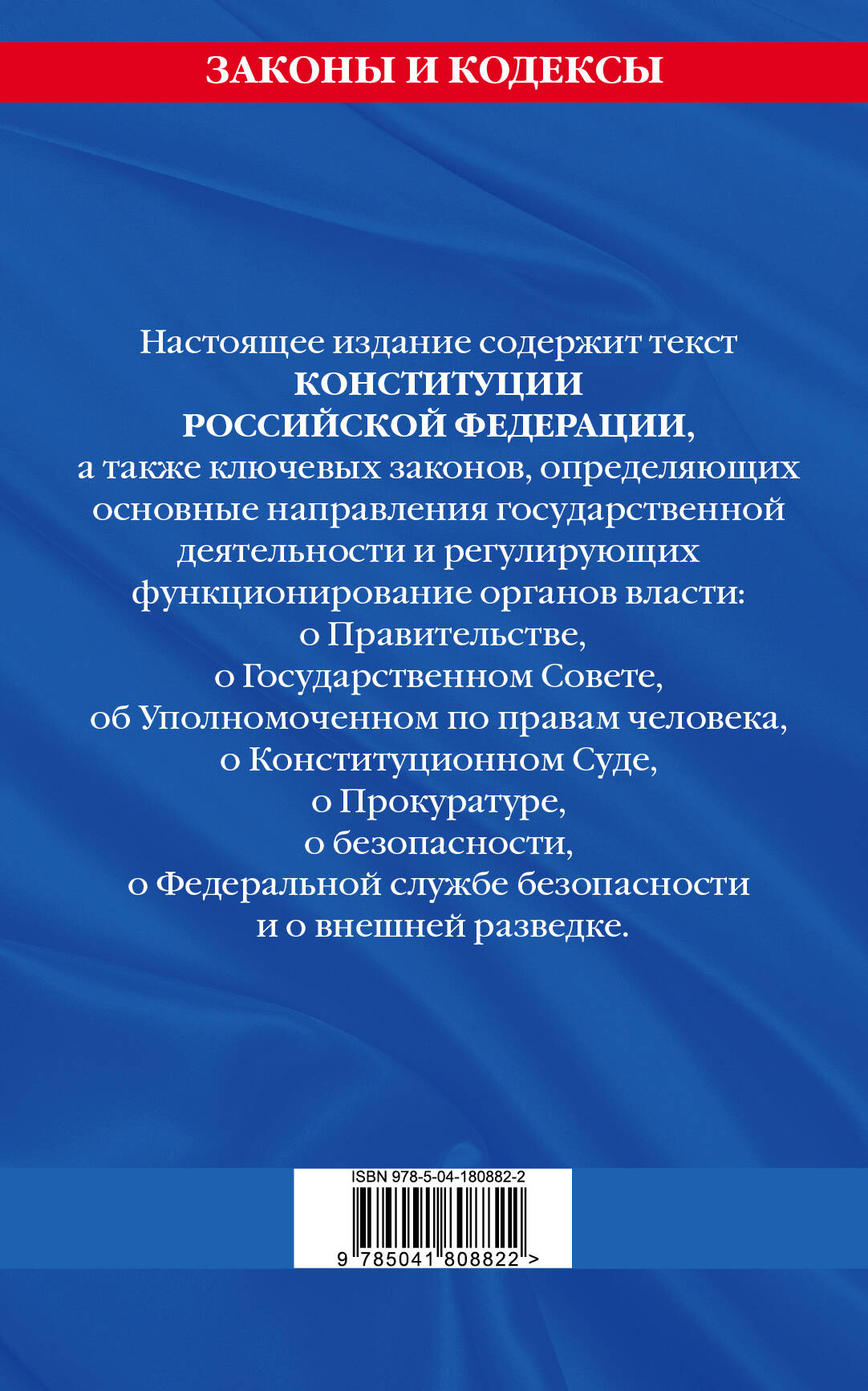 Издание содержит Конституцию Российской Федерации со всеми поправками, а также ключевые законы: «О Правительстве», «О Государственном Совете», «Об Уполномоченном по правам человека», «О Конституционном Суде», «О прокуратуре», «О безопасности», «О Федеральной службе безопасности» и «О внешней разведке».| Издательство | ООО "Издательство "Эксмо" |