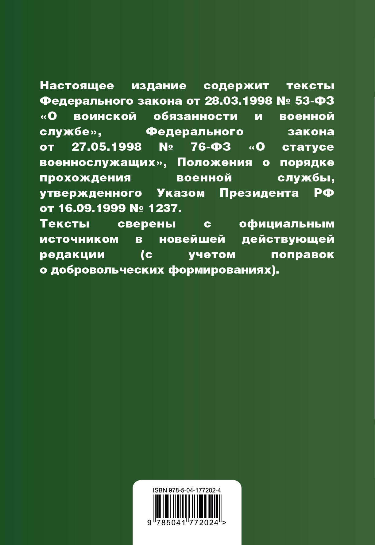 Впервые - в одном сборнике все тексты основных нормативных правовых актов, регулирующих вопросы военной службы в Российской Федерации в новейшей действущей редакции на 2023 год (с учетом поправок о добровольческих формированиях). В сборник включены тексты федеральных законов от 28.03.1998 № 53-ФЗ "О воинской обязанности и военной службе" и от 27.05.1998 № 76-ФЗ "О статусе военнослужащих", Положения о порядке прохождения военной службы, утвержденного Указом Президента РФ от 16.09.1999 № 1237.| Издательство | ООО "Издательство "Эксмо" |