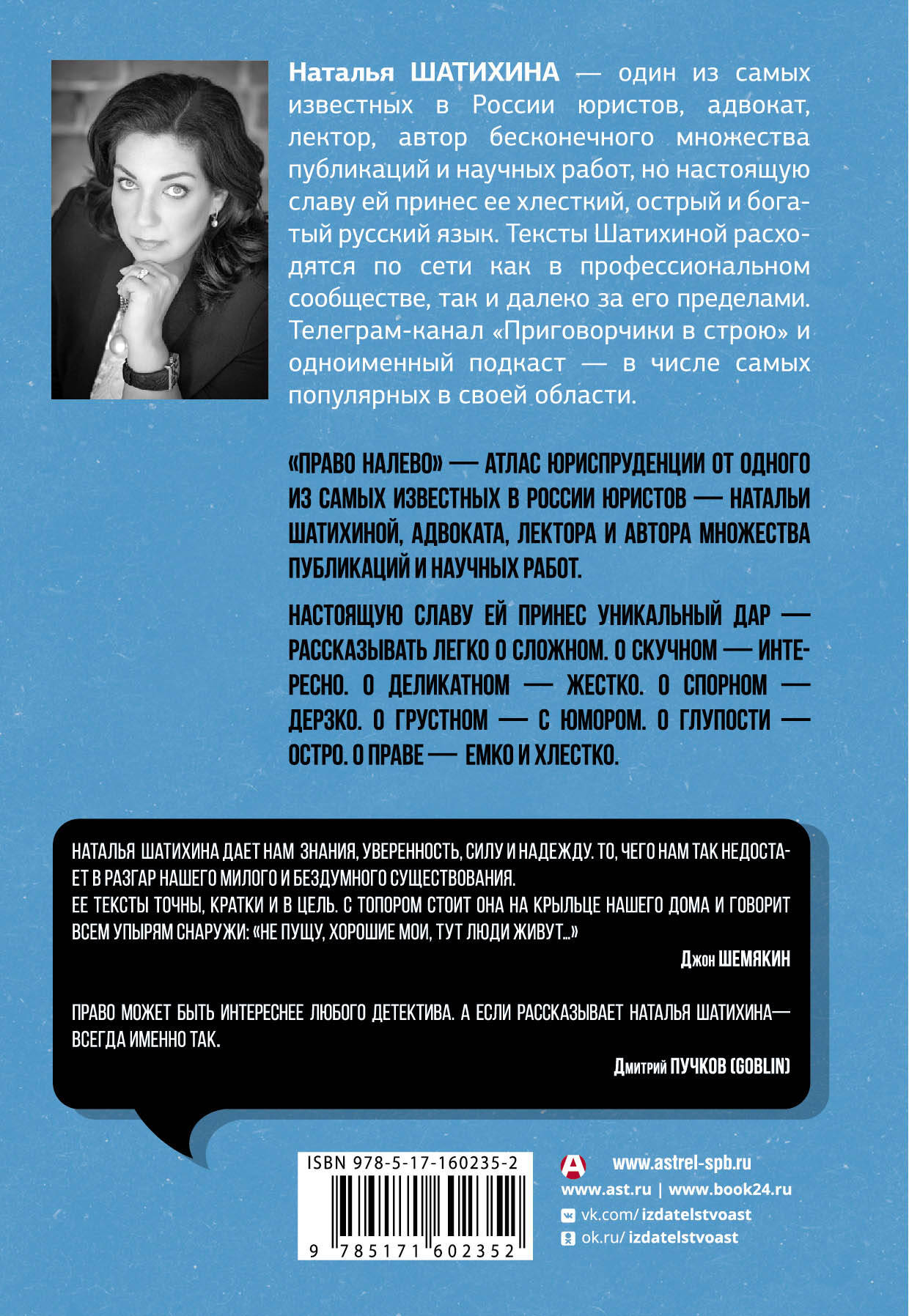 Наталья Шатихина, один из самых известных юристов России, ведущая популярного телеграм-канала «Приговорчики в строю», выпустила книгу о юриспруденции, в которой она разбирает реалистичные кейсы, доступным для понимания языком объясняет структуру и работу системы. Емко, легко и всегда с юмором.| Издательство | Издательство "АСТ" |