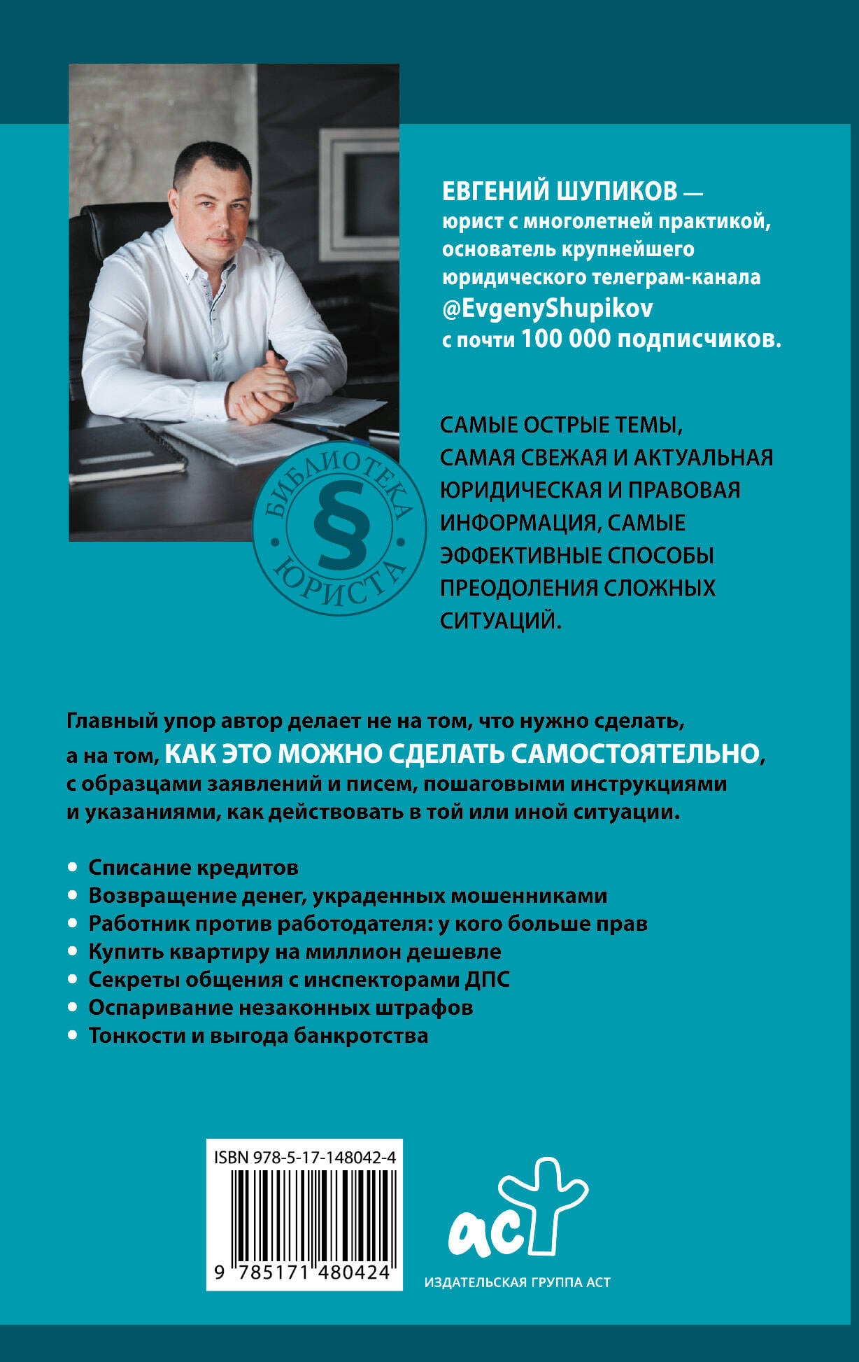 В новой книге известного юриста Евгения Шупикова дается самая свежая и актуальная юридическая и правовая информация, самые эффективные способы преодоления сложных ситуаций. Эта книга для тех, кто хочет самостоятельно защитить свои права и не собирается платить деньги за сомнительные консультации юридических фирм. В книге вы найдете образцы заявлений и писем, пошаговые инструкции и указания, как списать кредит, вернуть деньги, украденные мошенниками; выясните, у кого больше прав: у работника или работодателя; как купить квартиру на миллион дешевле; узнаете секреты общения с инспекторами ДПС; научитесь оспаривать незаконные штрафы.| Издательство | АСТ |