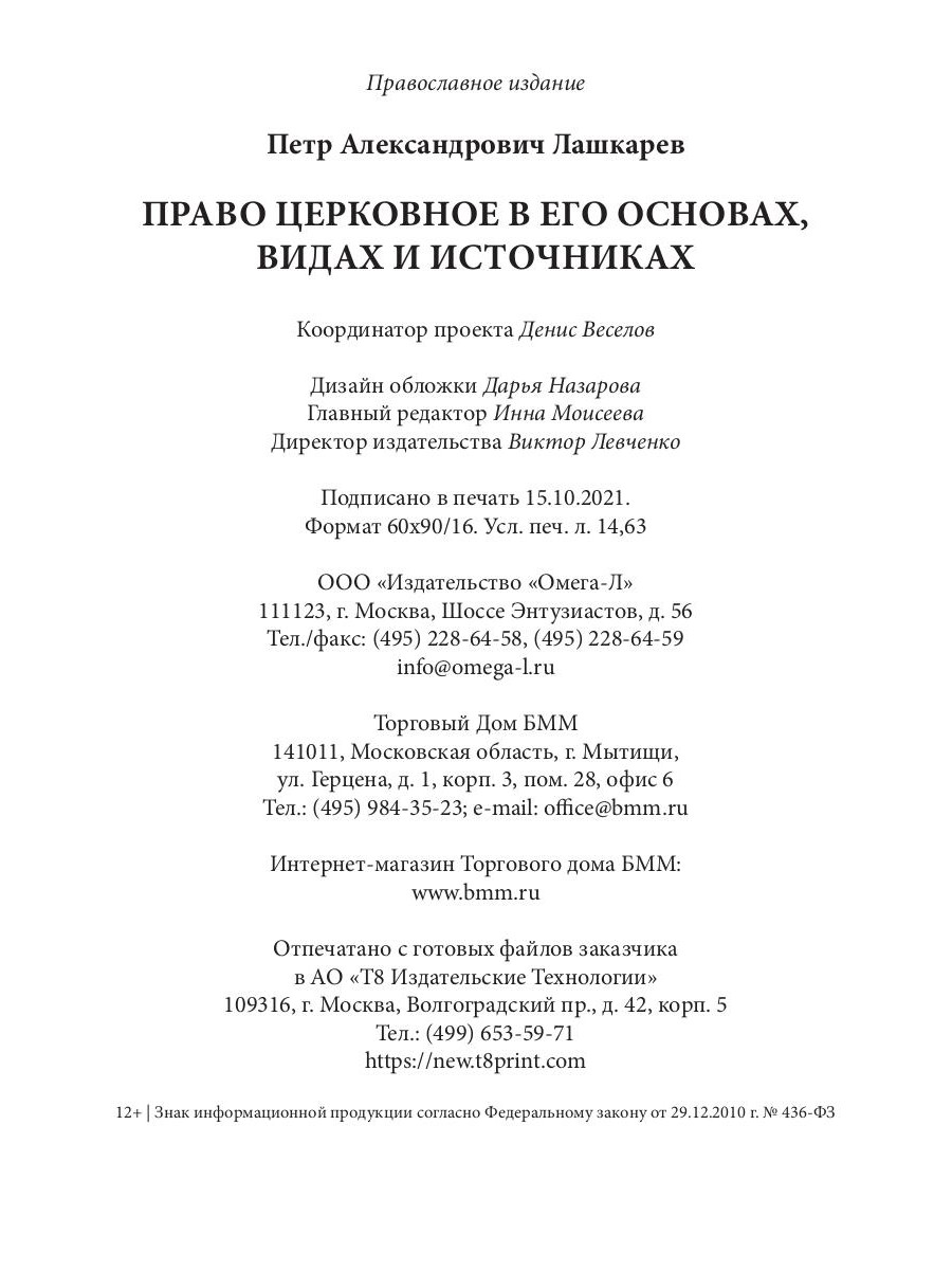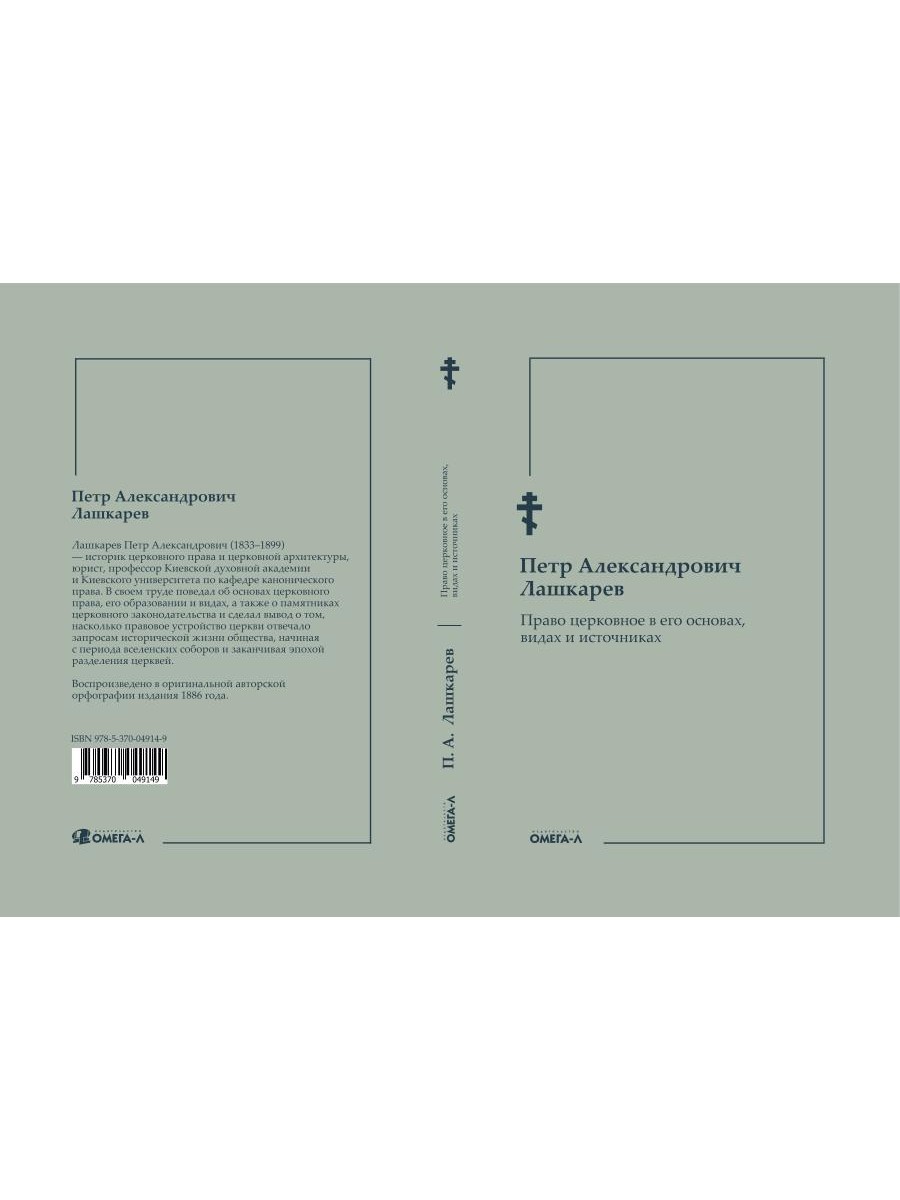 Лашкарев Петр Александрович (1833-1899) - историк церковного права и церковной архитектуры, юрист, профессор Киевской духовной академии и Киевского университета по кафедре канонического права. В своем труде поведал об основах церковного права, его образовании и видах, а также о памятниках церковного законодательства и сделал вывод о том, насколько правовое устройство церкви отвечало запросам исторической жизни общества, начиная с периода вселенских соборов и заканчивая эпохой разделения церквей. Воспроизведено в оригинальной авторской орфографии издания 1886 года (Киев: Тип. Г. Т. Корчак-Новицкого, 1886. - 224 с.).| Издательство | Омега-Л |