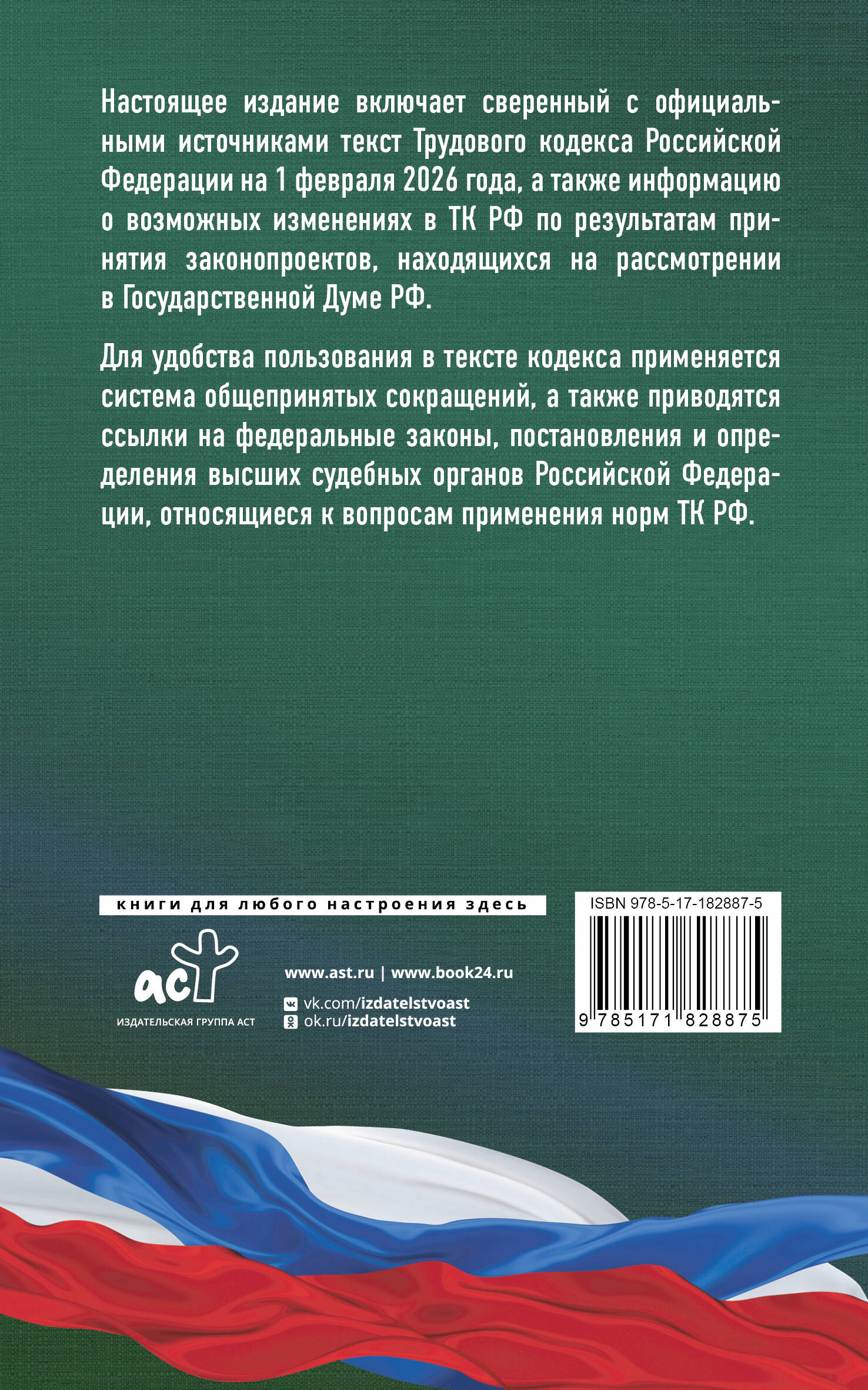 Данное издание Трудового кодекса Российской Федерации сверено с официальным источником и приводится по состоянию на 1 февраля 2026 года. Кодекс учитывает все изменения, опубликованные в официальных источниках на момент подписания издания в печать. В издании представлена информация о возможных изменениях в ТК РФ по результатам принятия законопроектов, находящихся на рассмотрении в Государственной Думе РФ. Для удобства пользования в тексте кодекса применяется система общепринятых сокращений, а также приводятся ссылки на федеральные законы, постановления Правительства Российской Федерации, постановления и определения высших судебных органов Российской Федерации, относящиеся к вопросам применения норм ТК РФ.